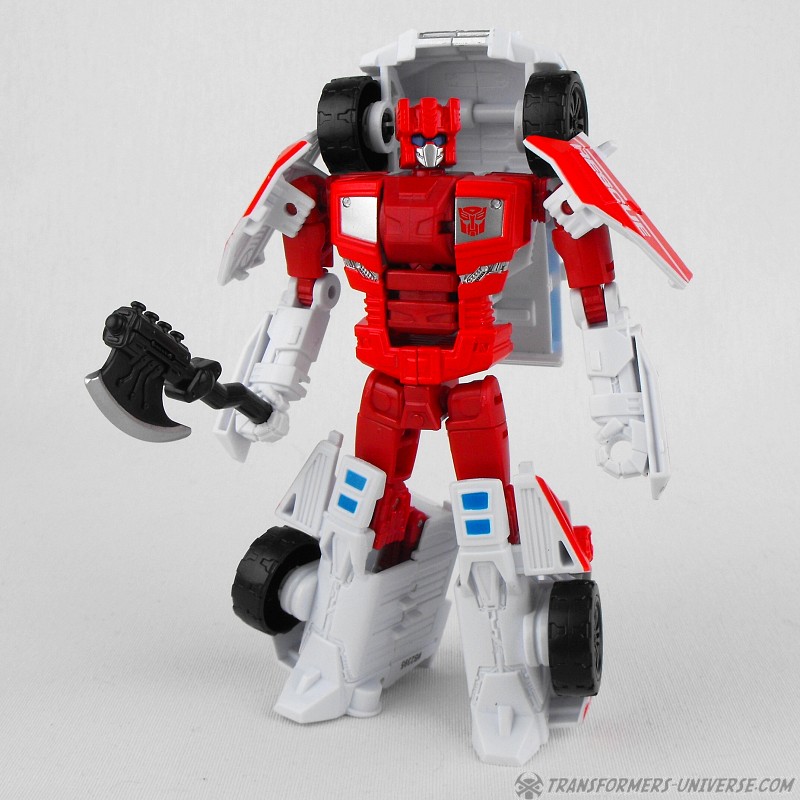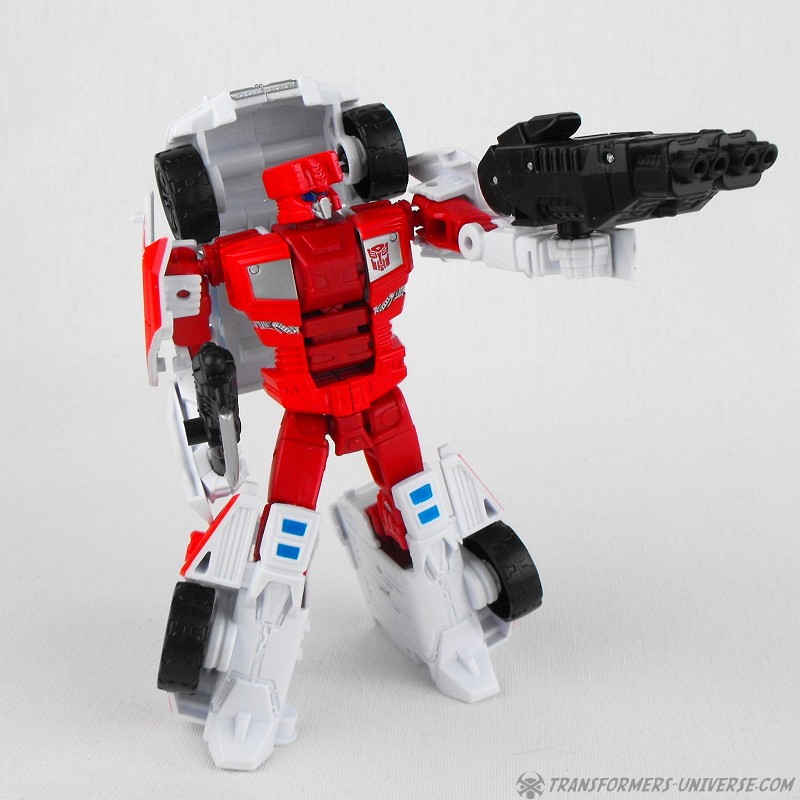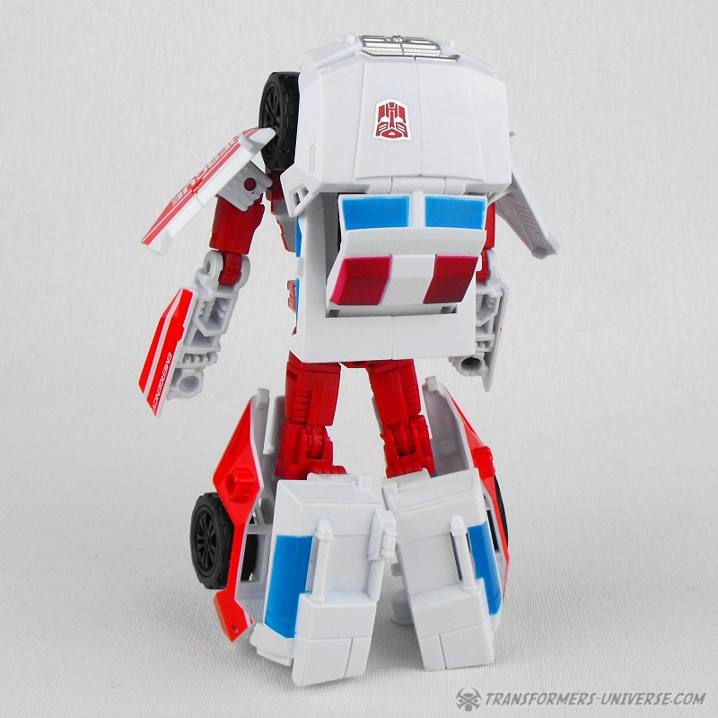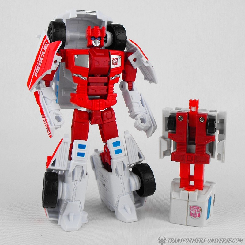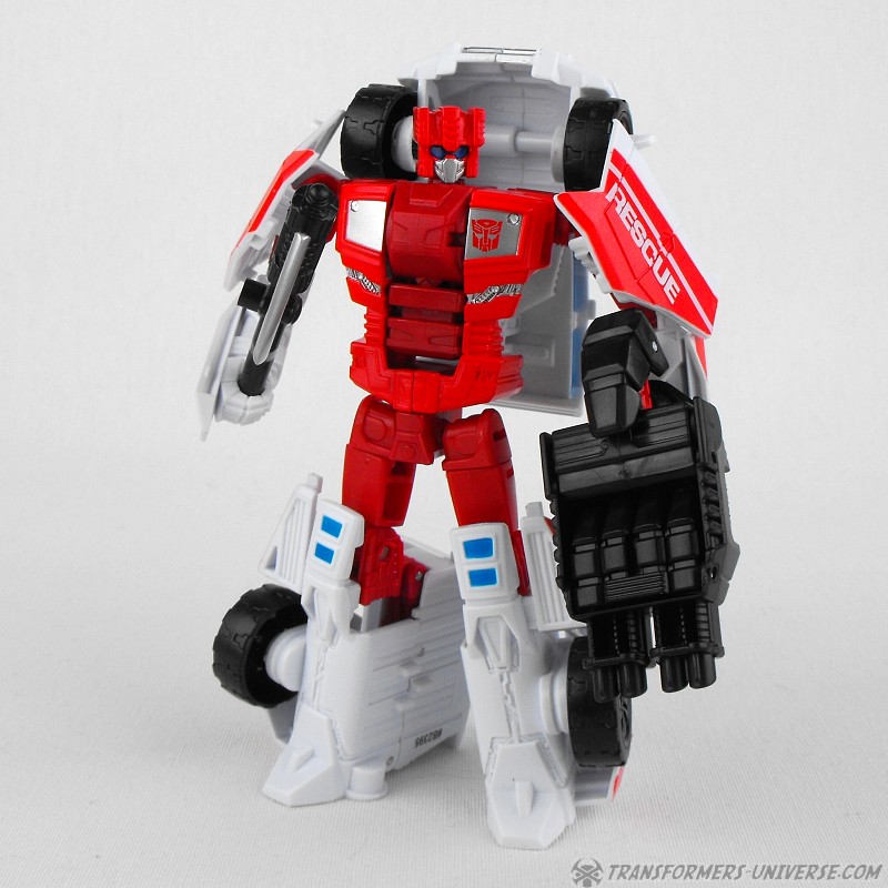 Robot Mode: First Aid might be the Protectobot who is closest in both look and design to his G1 predecessor. Bigger, of course, and far better articulated, naturally, but overall the two figures look very much alike. Red torso, white arms and legs, most of the vehicle shell on the back, even the look of the chest and head are very similar. So yes, no doubt, this is First Aid here.
