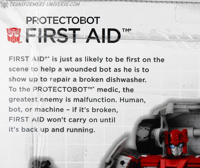 First Aid is just as likely to be first on the scene to help a wounded bot as he is to show up to repair a broken dishwasher. To the Protectobot medic, the greatest enemy is malfunction. Human, bot, or machine - if it's broken, First Aid won't carry on until it's back up and running.