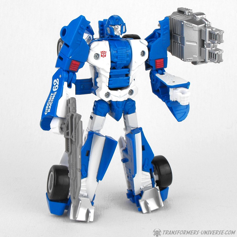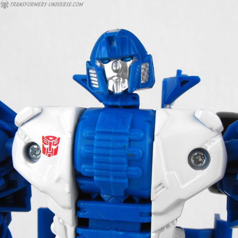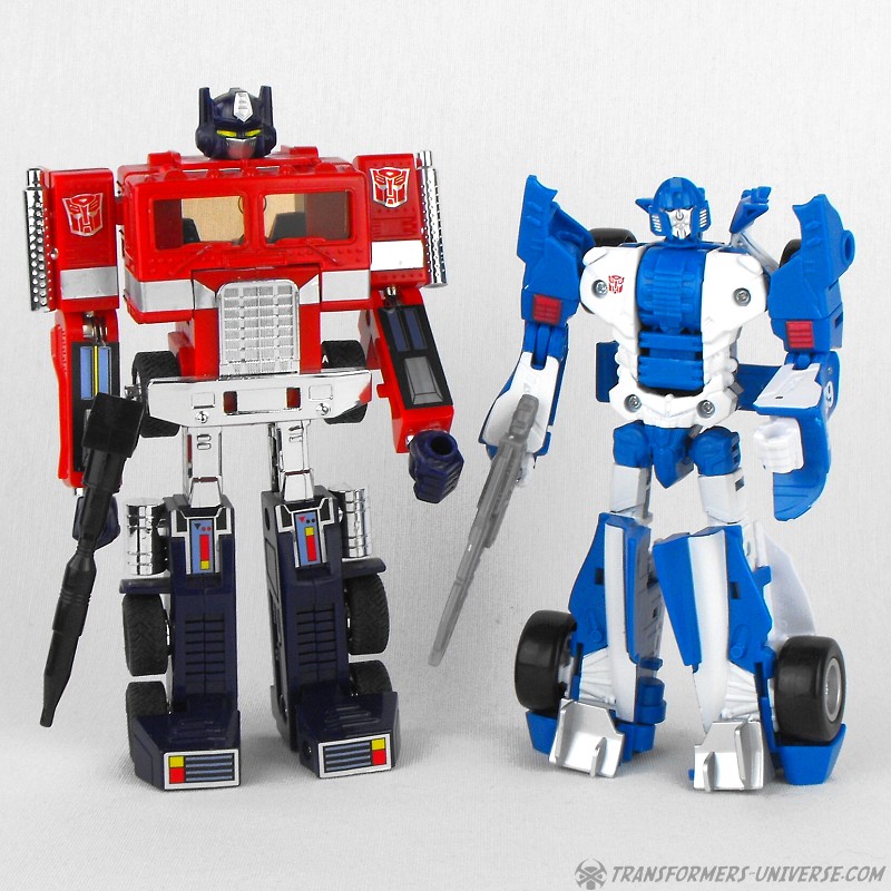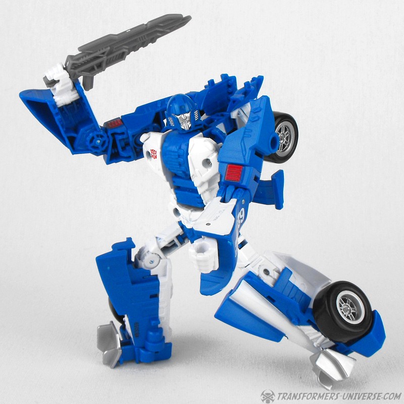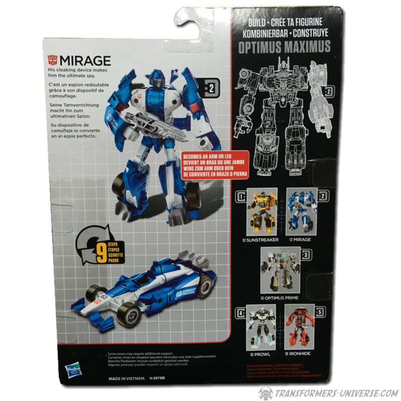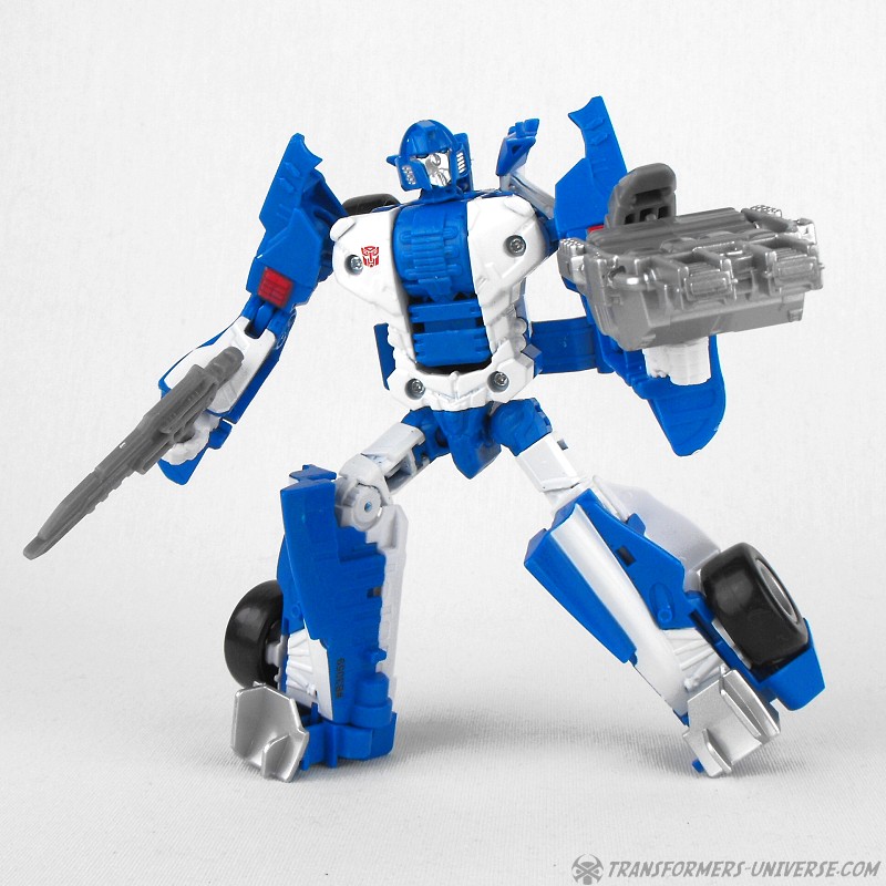 Remarks: Mirage is a repaint of Dragstrip, so look there for the full review. Just some words on the differences here. Apart from his familiar blue and white paint job, Mirage was also given a new head sculpt, which is pretty much a dead ringer for Mirage as he currently appears in the IDW comics and a pretty close match the G1 cartoon character, too. The rest is more or less the same, even the weapons are identical, just a different color (silver instead of purple). And, of course, he can still become the limb of a combiner, in his case he is intended to become part of Optimus Maximus.