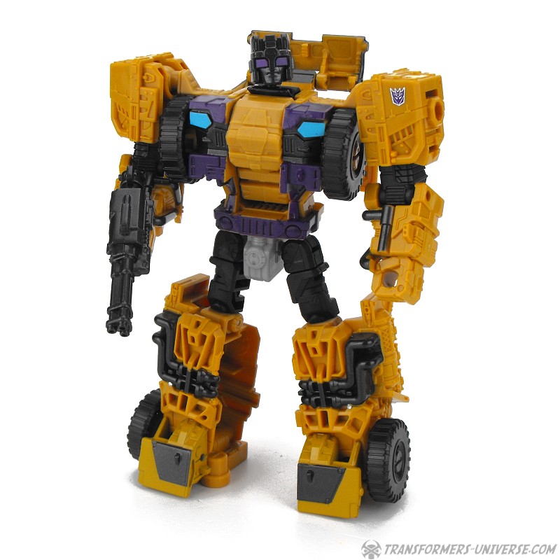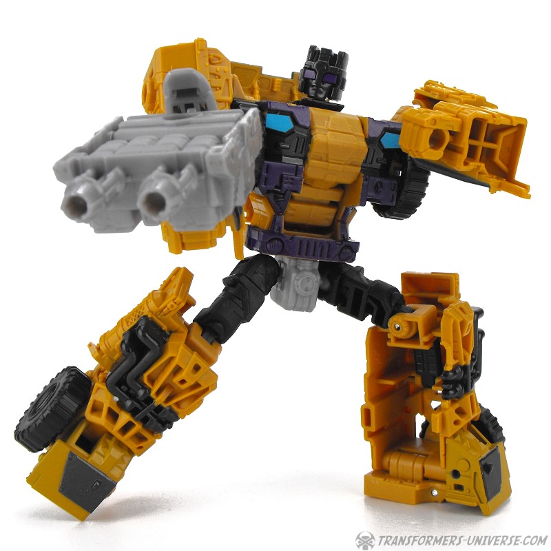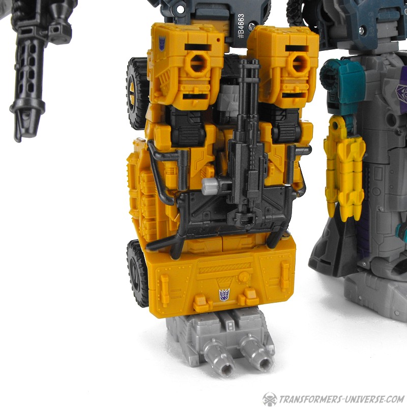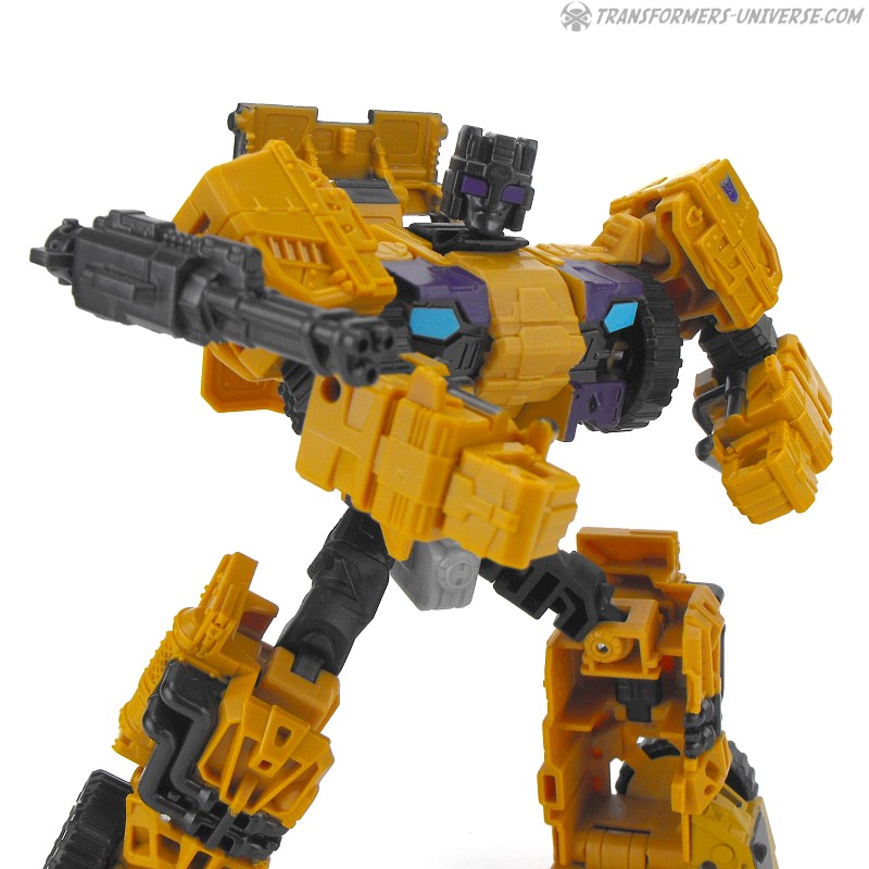 Articulation is standard for a Combiner Wars figure, meaning pretty good, and Swindle can do quite a few cool poses. No twisting wrists or ankle tilt, but that wasn’t really standard yet at the time. He comes with black minigun as a weapon, as well as the usual combiner foot/fist/gun thing.