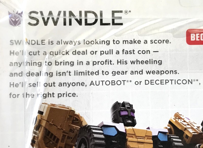 Prelude: The Combaticons have often been likened to the A-Team (just evil), so that would make Swindle the equivalent of Templeton “Face Man” Peck, played by Dirk Benedict. Of course Face has never tried to sell off his own teammates for parts, but that’s where the “evil” part comes in, I guess. So here is Combiner Wars Swindle, ready to sell you his own action figure. Let’s say go!