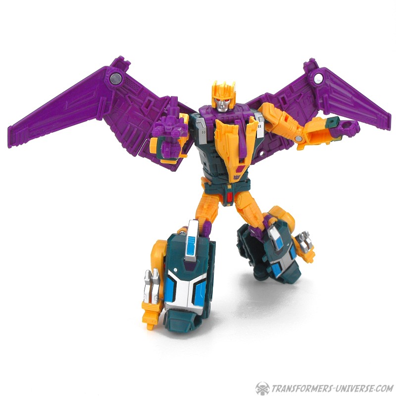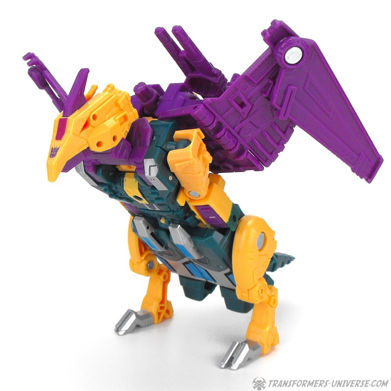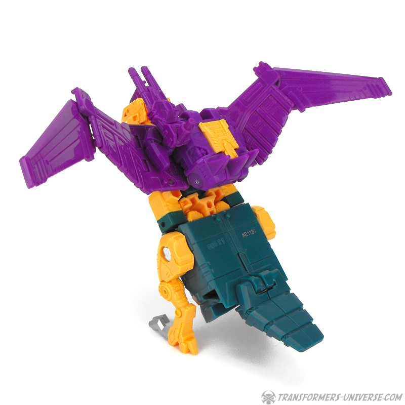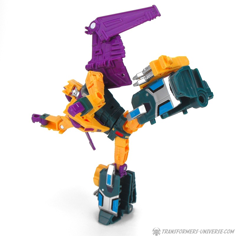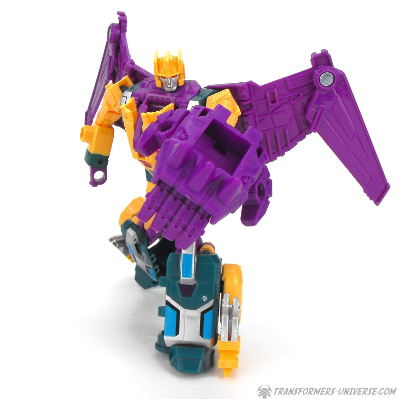 Alternate Mode: Cutthroat transforms into a bird-like creature, but in a slightly different way than Swoop. Instead of fully folding his legs onto his back, Cutthroat simply folds them in and has bird legs on the sides, making for a larger, more solid-looking creature than Swoop. Also, the bird head isn’t simply a mask slipping onto the robot mode’s face, but includes a long neck, too. The bird can open its beak and both the gun and the combiner fist can be stored on its back. The wings have an impressive span. So bottom line: if you like winged beast modes, there is no reason why you can’t like this one here. Nicely done.