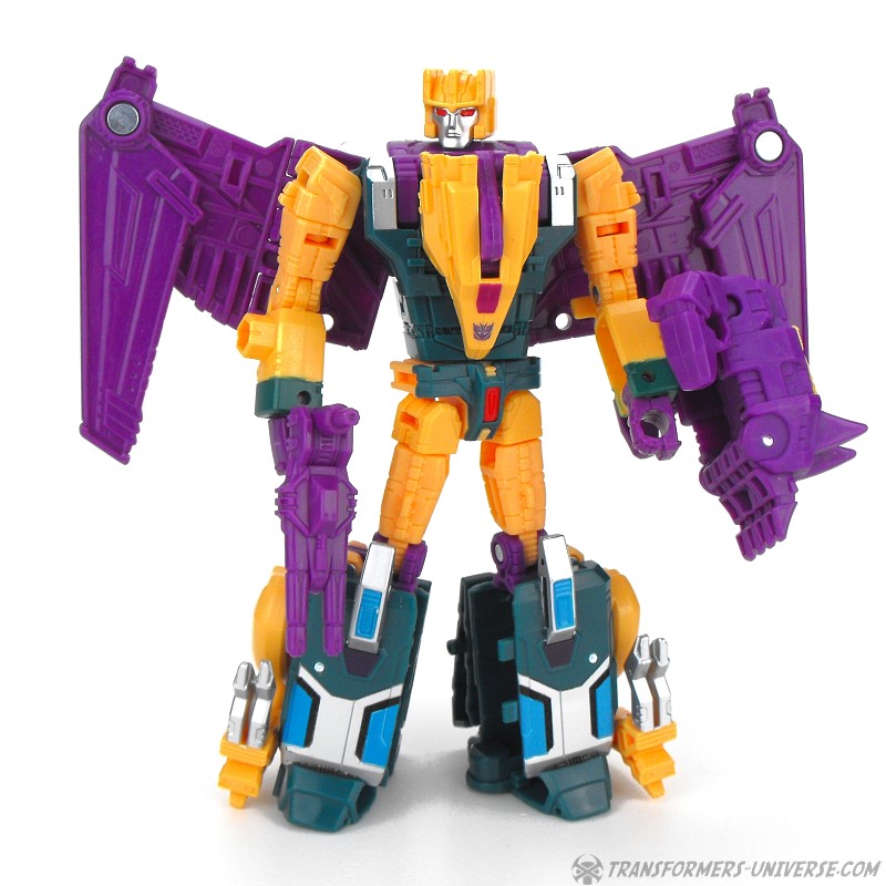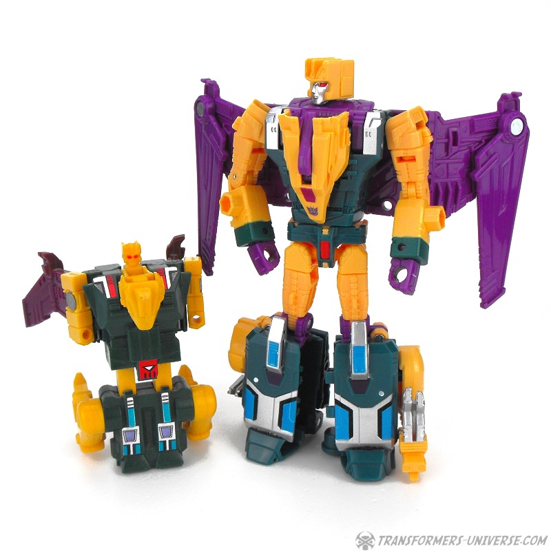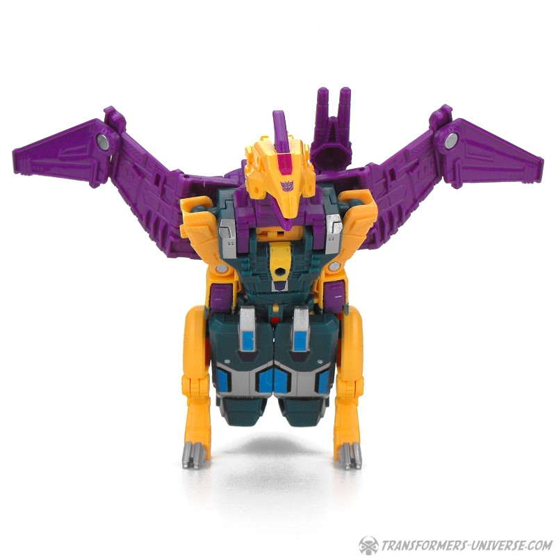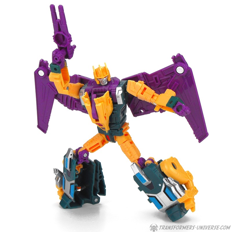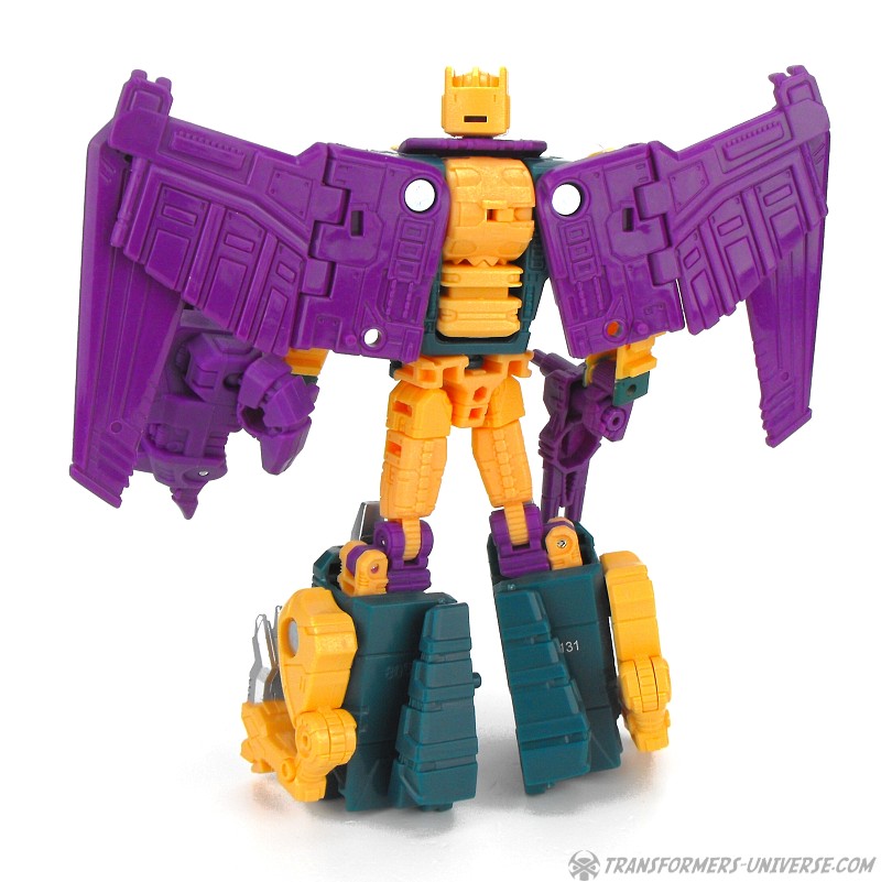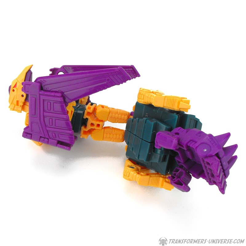 Alternate Mode: Cutthroat transforms into a bird-like creature, but in a slightly different way than Swoop. Instead of fully folding his legs onto his back, Cutthroat simply folds them in and has bird legs on the sides, making for a larger, more solid-looking creature than Swoop. Also, the bird head isn’t simply a mask slipping onto the robot mode’s face, but includes a long neck, too. The bird can open its beak and both the gun and the combiner fist can be stored on its back. The wings have an impressive span. So bottom line: if you like winged beast modes, there is no reason why you can’t like this one here. Nicely done.
