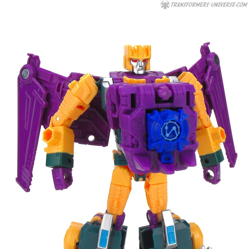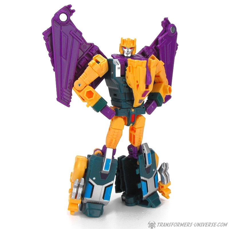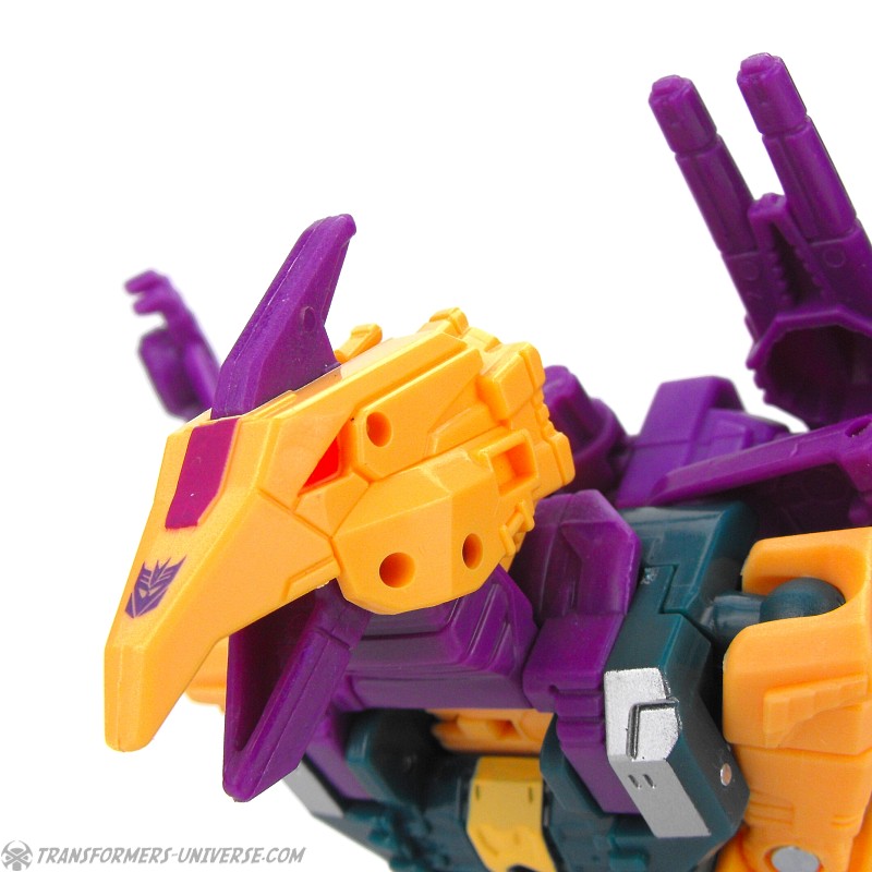 Robot Mode: Despite being a retool of Swoop, Cutthroat (and isn’t that a nice, kid-friendly PG name?) differs in quite a few ways. Differnent wings, of course, as well as a different bird head on his chest. Different legs, too, owing the to the slightly different configuration in beast mode (see below). Add a different head and entirely different colors, too, and you have a figure that looks almost entirely new.