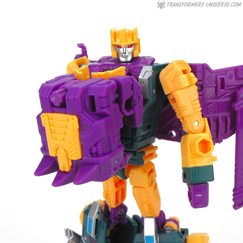 Overall I must say that I like Cutthroat slightly better than Swoop in terms of looks, but that is entirely subjective, of course. The robot is basically the same except for some cosmetic differences. He, too, comes with a combiner fist that doubles as a chest armor that can fit a Prime Master inside it. Doesn’t look too bad on Cutthroat, but I’ll never be a fan of this gimmick, I fear. Cutthroat also comes with a purple gun instead of a sword.