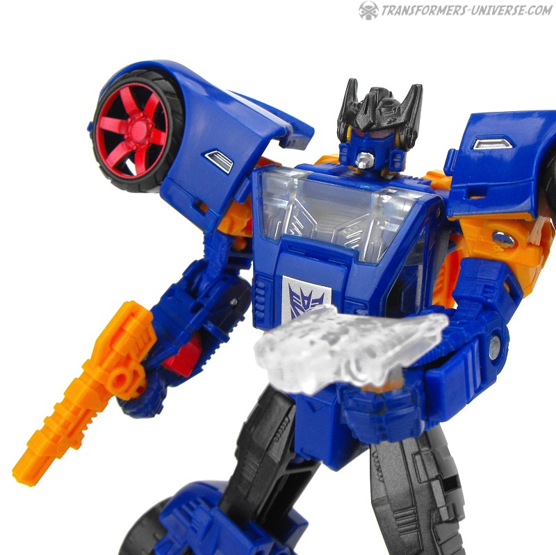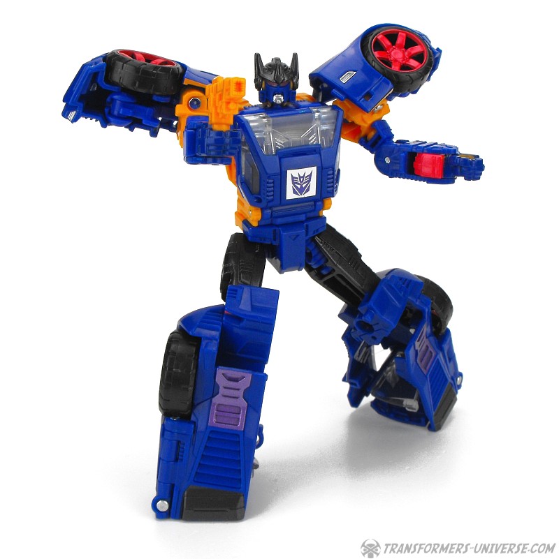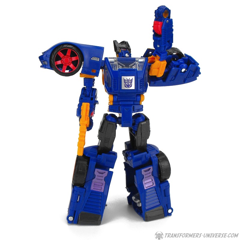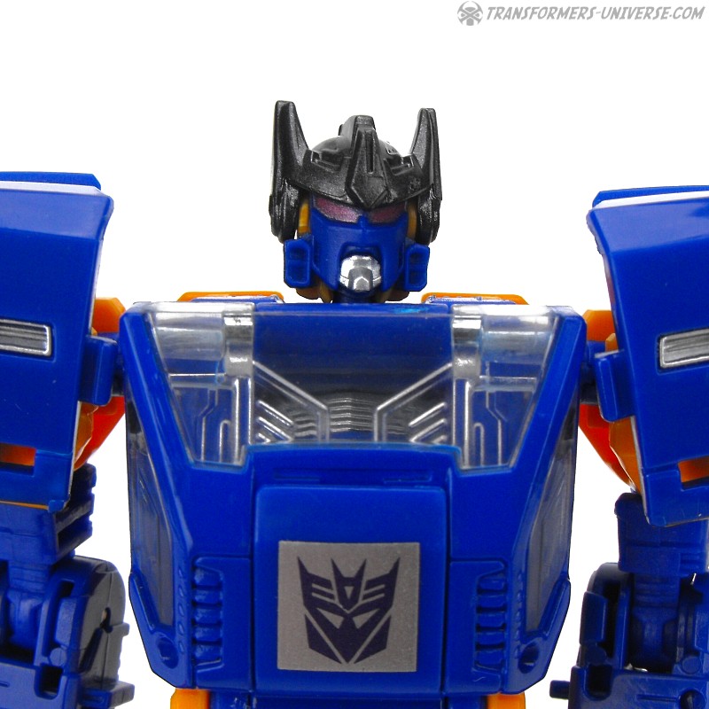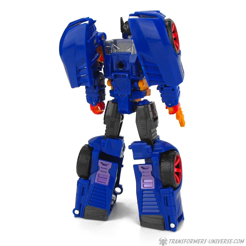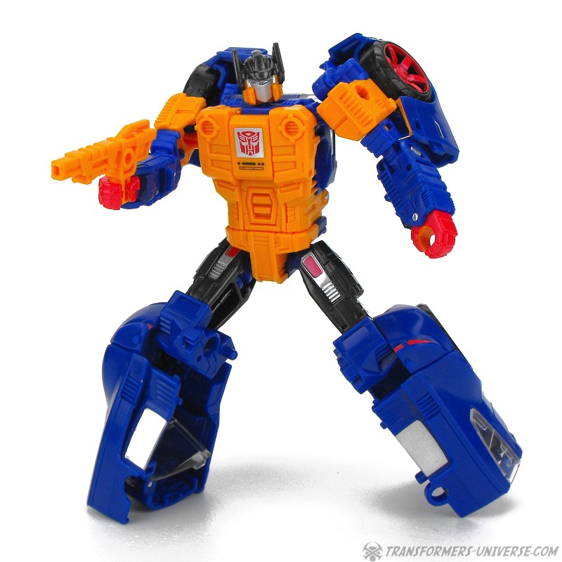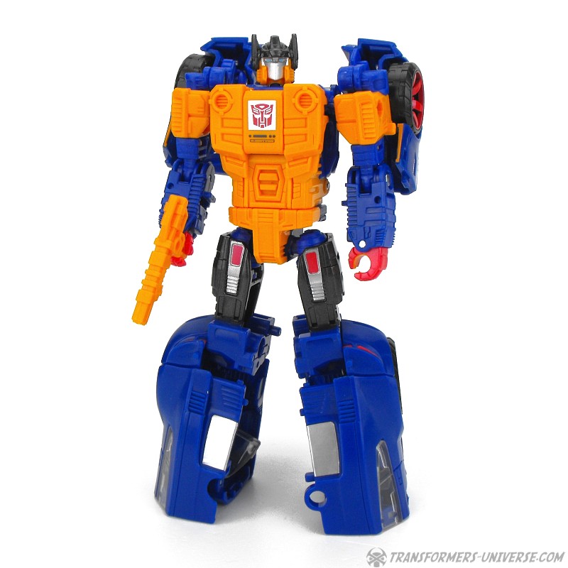 In order to assume his secondary robot mode as Counterpunch, you basically turn Punch around. His Autobot insignia is covered, the Decepticon insignia is uncovered. The shoulder pieces are folded out sideways, the helmet is tipped back, and the red hands are flipped for black ones. Done! Now you have Counterpunch, who is looking every inch the Decepticon in blue and black. Just as well-articulated as Punch, just as nicely detailed as Punch, but looking very much different. The hand-switching gimmick is a nice idea, but sadly he wields the same orange gun as Punch. Would have been better to go with two different weapons here like G1 Punch/Counterpunch did. Apart from that, though, very nice. A perfect secondary robot mode.