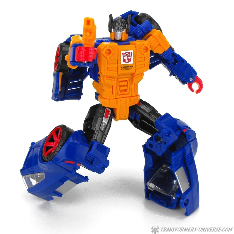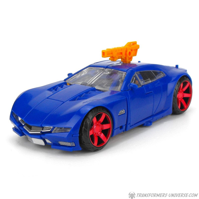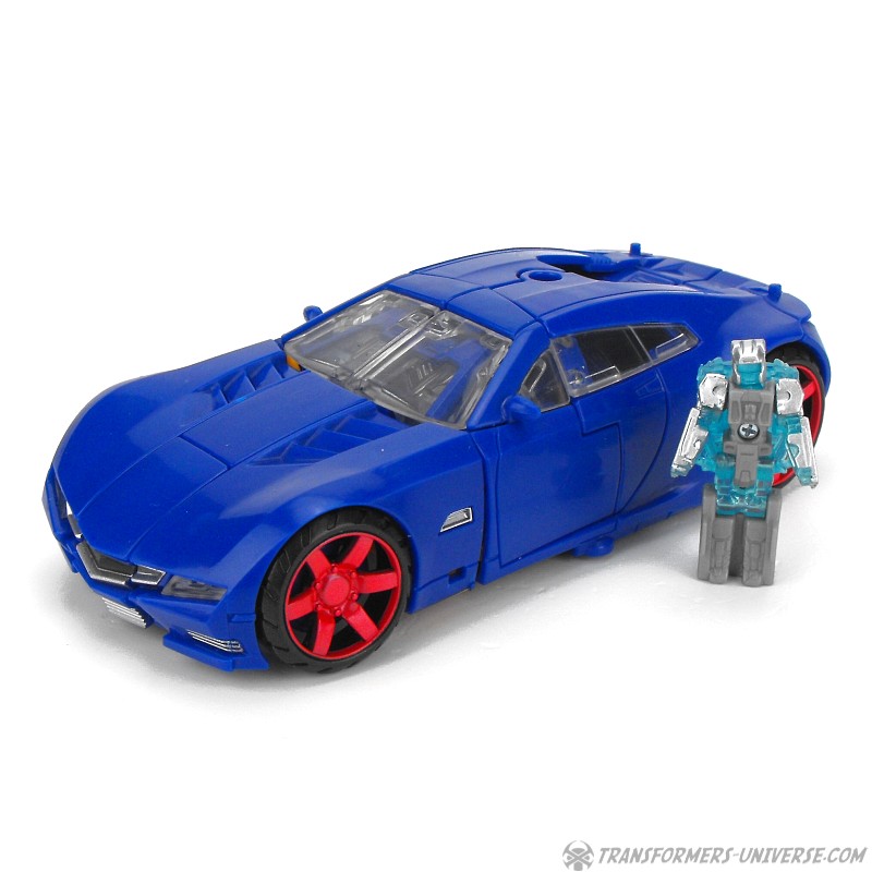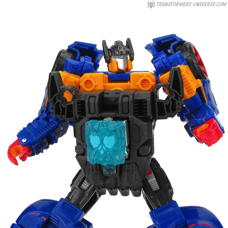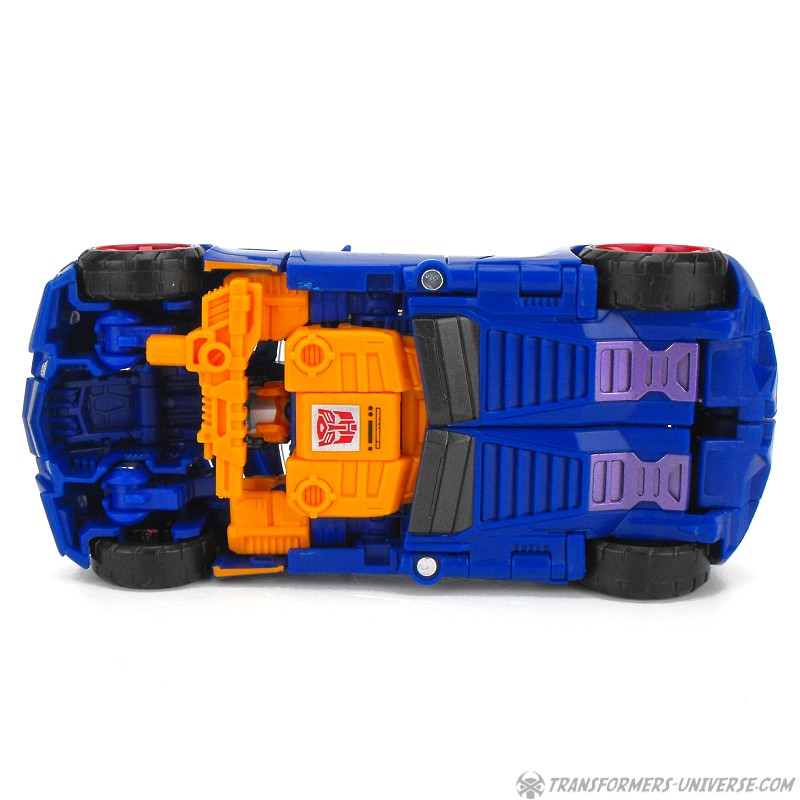 Alternate Mode: Punch transforms into a generic blue sports car with red wheels. A large portion of the chassis actually emerges from the robot’s legs, which is pretty impressive engineering. Not quite Prime Vehicon levels, but good. The resulting car looks pretty nice, too, and there is no hint of a robot mode to be seen. Okay, he’s got visible head syndrome on the car’s underside, but as we have learned from the Bumblebee movie trailers, that is canon. Punch’s gun can be stored on the underside, too (and even hides the head a bit) and if you really want, you can mount the gun and/or the combiner fist chest armor on top of the car, too. So all in all, a pretty nice car mode. A bit boring when compared to having two robot modes, but good.