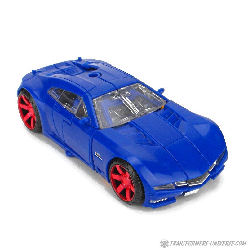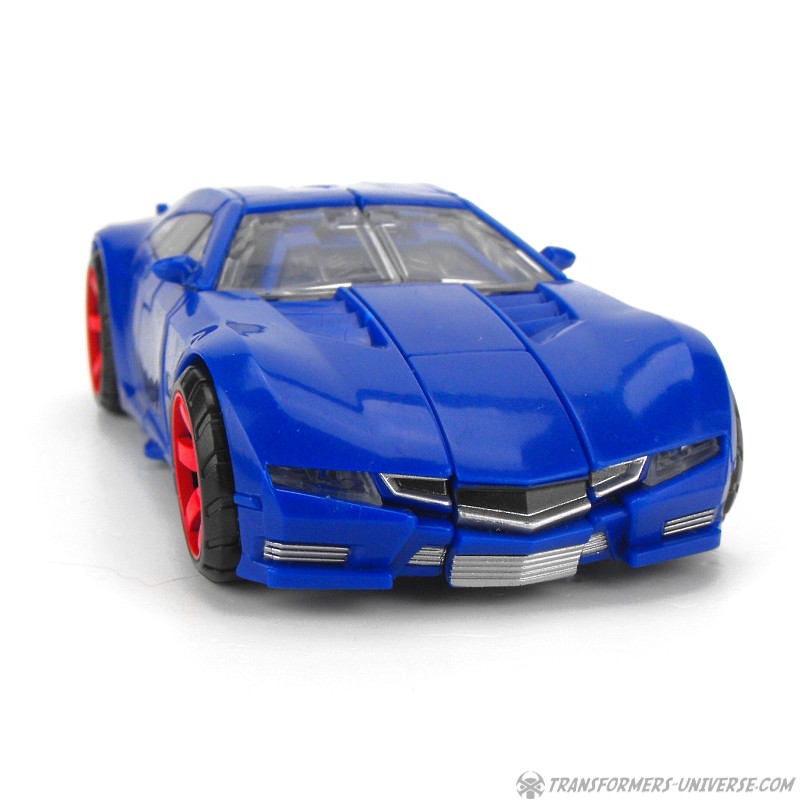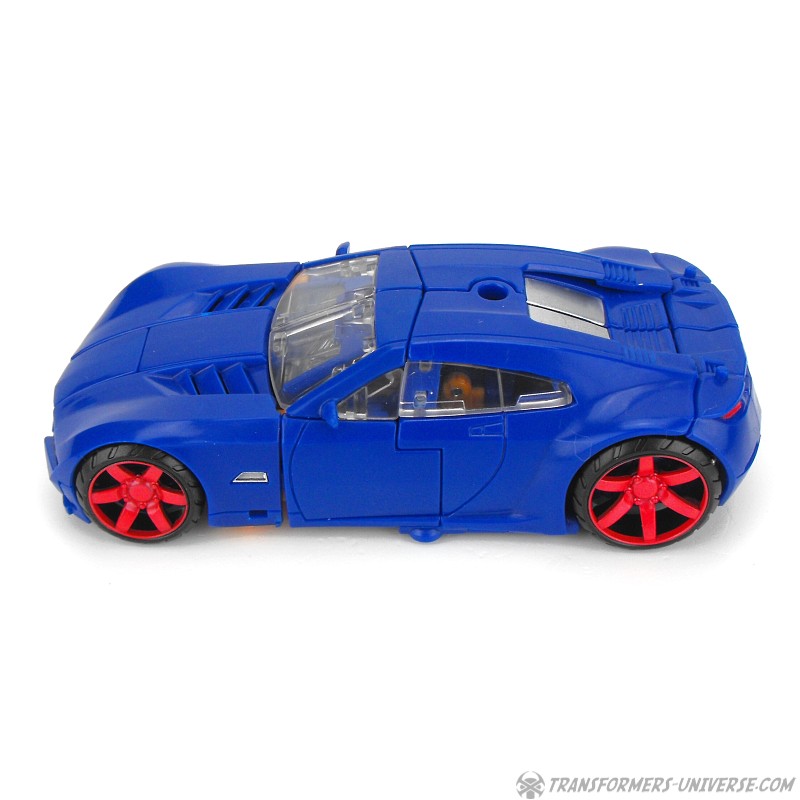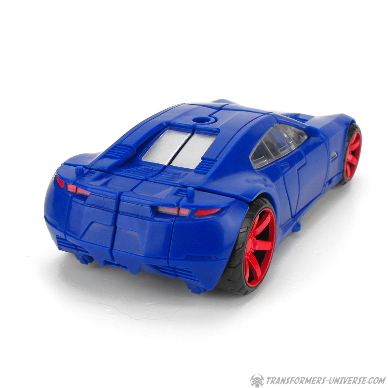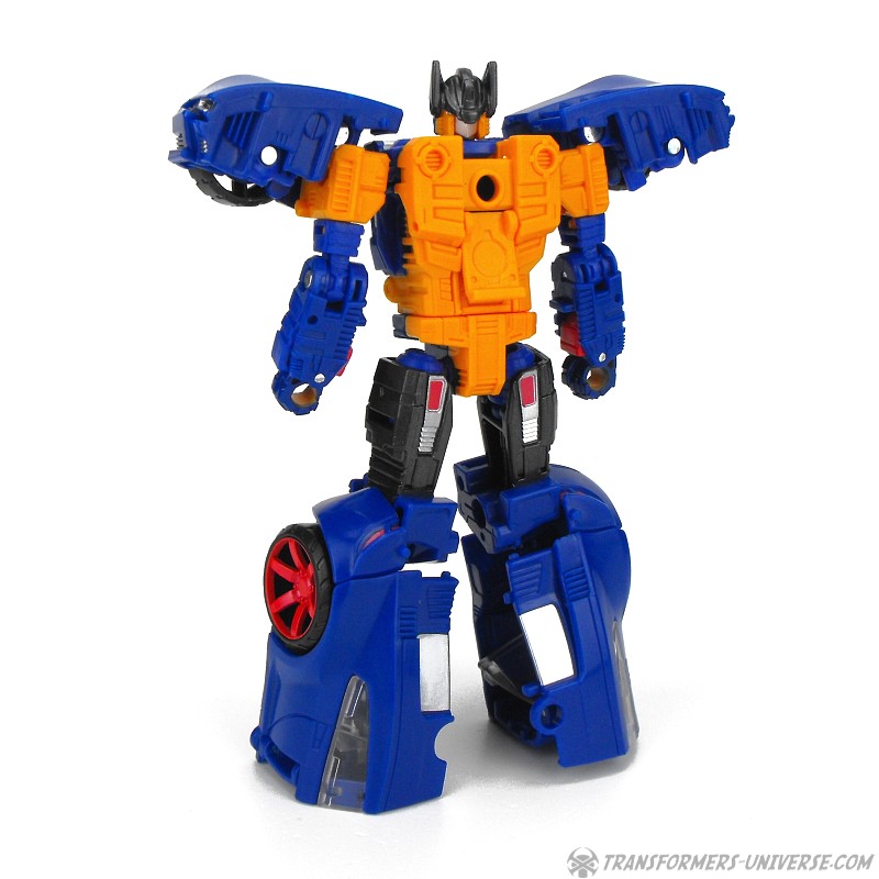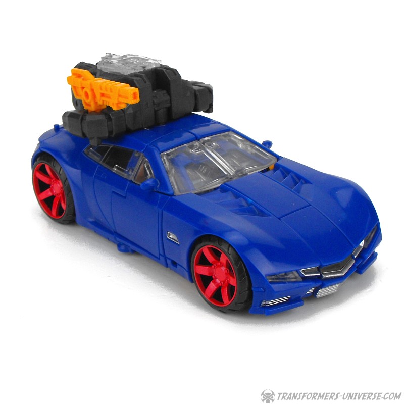 Alternate Mode: Punch transforms into a generic blue sports car with red wheels. A large portion of the chassis actually emerges from the robot’s legs, which is pretty impressive engineering. Not quite Prime Vehicon levels, but good. The resulting car looks pretty nice, too, and there is no hint of a robot mode to be seen. Okay, he’s got visible head syndrome on the car’s underside, but as we have learned from the Bumblebee movie trailers, that is canon. Punch’s gun can be stored on the underside, too (and even hides the head a bit) and if you really want, you can mount the gun and/or the combiner fist chest armor on top of the car, too. So all in all, a pretty nice car mode. A bit boring when compared to having two robot modes, but good.