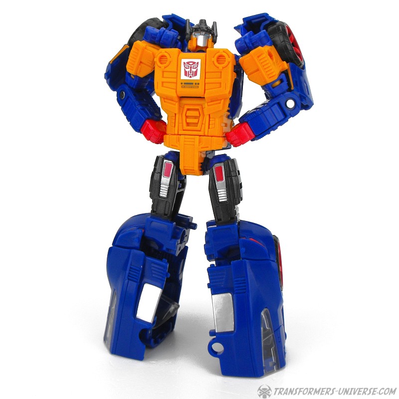 Robot Mode: Let us start with Punch’s “true” robot mode, a robot with an orange torso, blue limbs, and red hands. Here Punch looks the quintessential Autobot, complete with a very Optimus-Prime-like head and face. The robot is very nicely articulated and the detailing looks pretty good, too. Also, you can look at Punch from the back without immediately noticing that there is another robot mode hidden there. The black helmet Punch wears obscures that he has another face on the back of his head quite nicely.