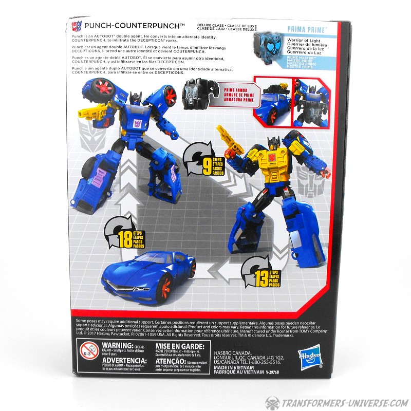 Punch / Counterpunch is the third Amazon exclusive connected to the Prime Wars series, preceded by Blast-Off (Combiner Wars) and Repugnus (Titans Return). I ordered him almost the moment he was available on the Amazon website and do not regret it. He is a very good figure, far superior to the previous incarnation of the character, Timelines Punch, and just a good Transformers toy overall. He very nicely implements the double spy gimmick, has no flaws, and apart from being misassembled out of the box there is nothing to complain about here. Fully recommended.