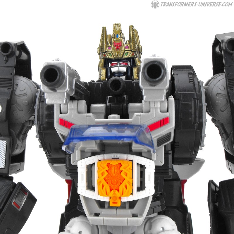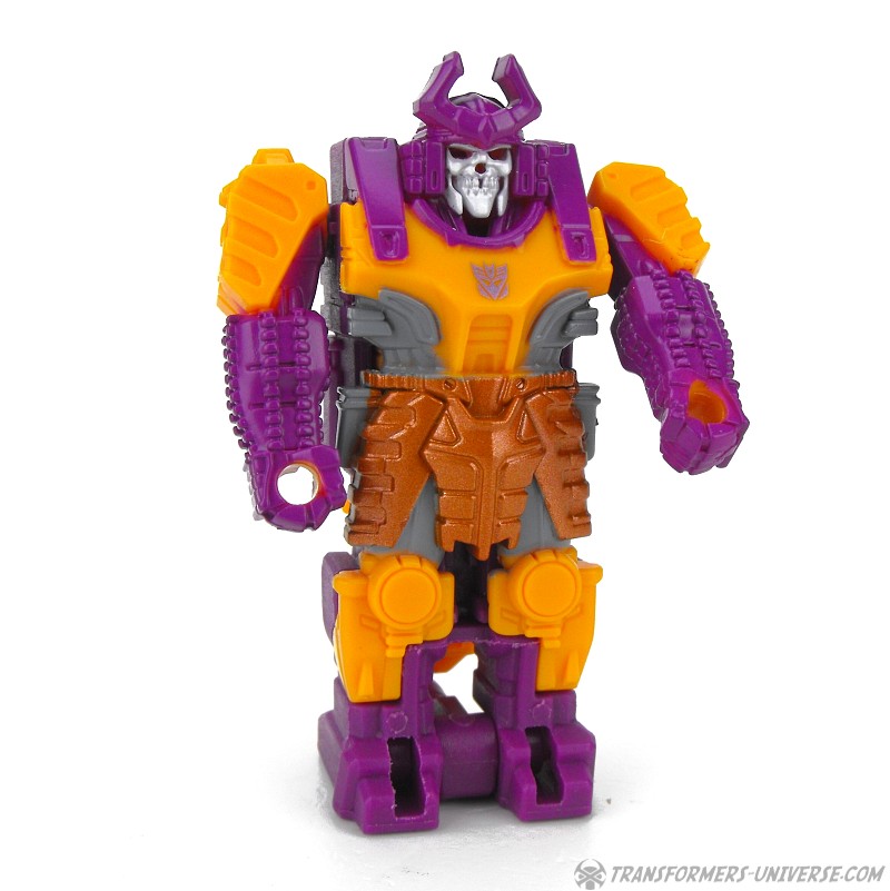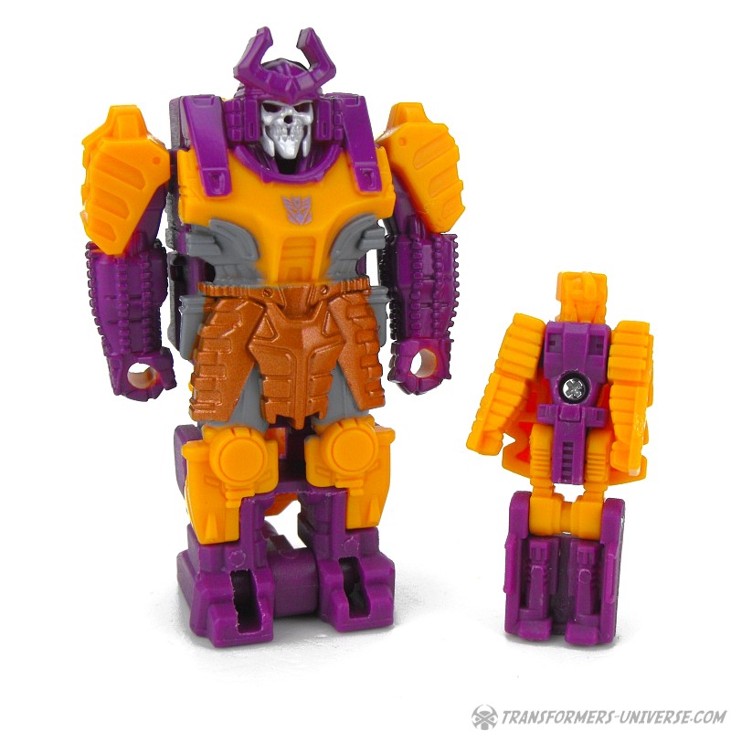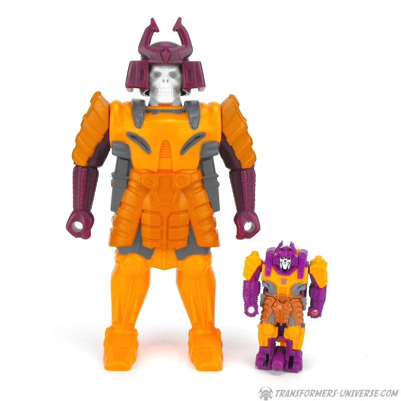 The smaller robot can be put inside a larger suit of armor, a so-called Decoy Armor, which is designed to look like G1 Pretender Bludgeon. Now don’t ask me why the Prime of Life hides inside a skeleton samurai armor, maybe because no one would think to look for him there. The Decoy Armor is as well-articulated as the old Pretenders, meaning it can swivel its arms at the shoulders and that’s it. Look-wise it’s a great match for Bludgeon, almost better-detailed than the much larger original. The Armor can hold the gun barrel from its back as a hand weapon.