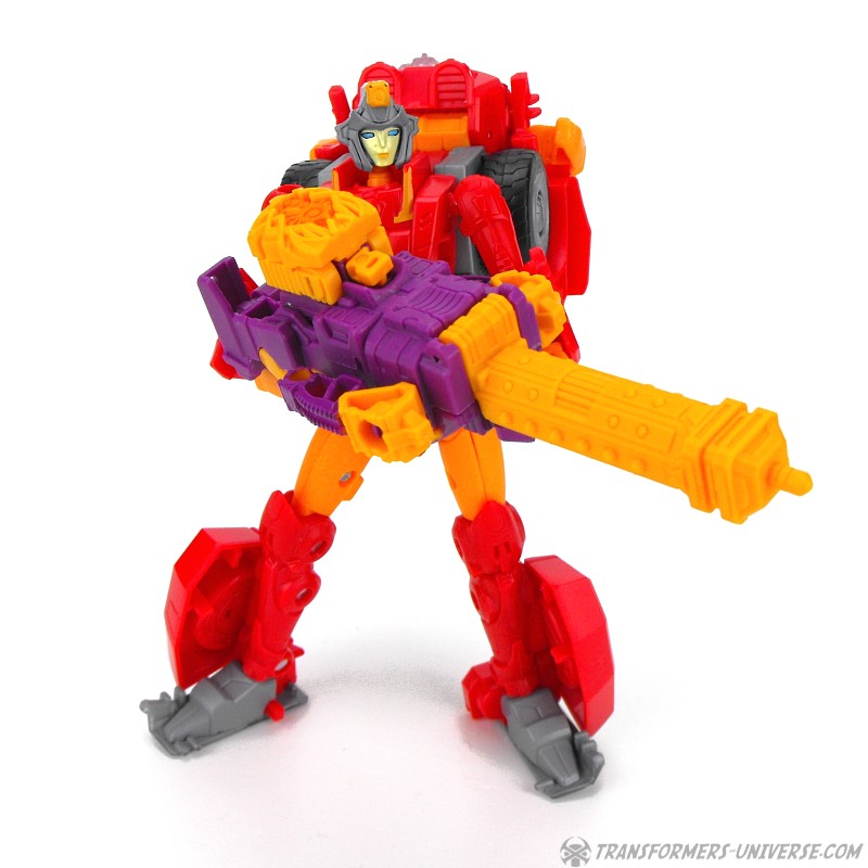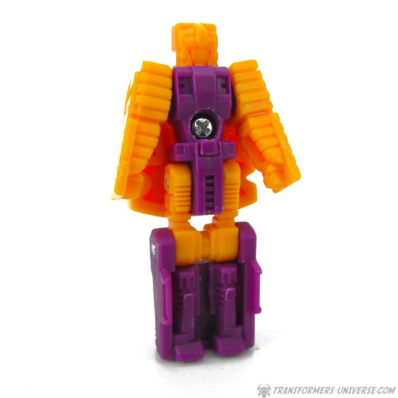 Robot Mode: The actual Quintus Prime figure is a Prime Master, meaning a very small robot. The figure is yellow and purple, can turn its head, has ball-jointed shoulders, and has hip and knee joints, but fused-together lower legs. So articulation, while present, is not exactly spectacular. The figure’s rucksack features his Prime sigil and what little face sculpting he has shows a visor over his eyes.