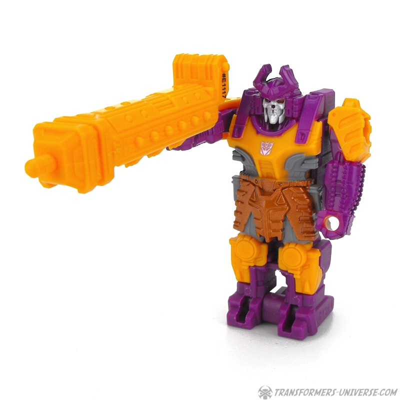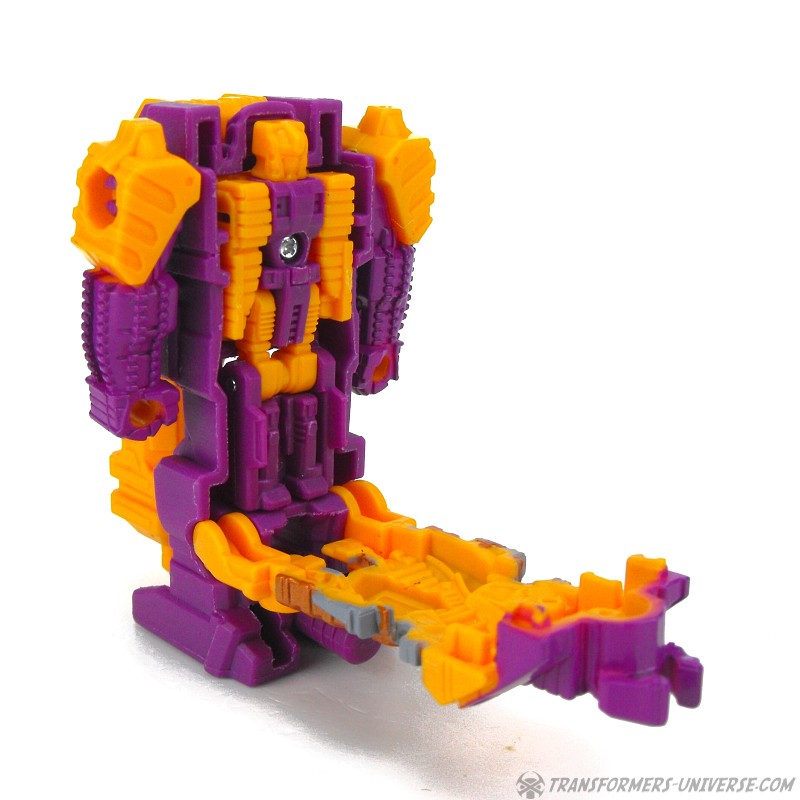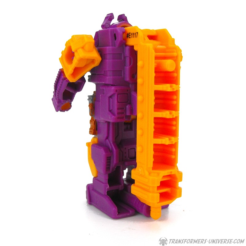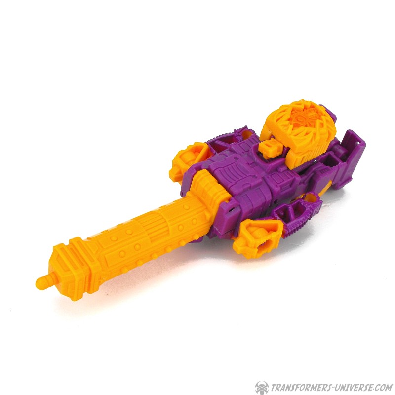 The Decoy Armor can also transform, kind of, which technically makes this toy here a Mega Pretender, I guess. It’s not much of a transformation, of course, as Bludgeon just unfolds the gun barrel from his back, unfolds a 5mm pin from between his feet, and then you’ve got a Targetmaster-style weapon ready to be used by bigger figures. And in true Mega-Pretender fashion, the alternate mode of the inner robot can combine with the alternate mode of the shell, too. The Prime engine/core/whatever attaches to the top of the weapon, no doubt enhancing its deadliness with Quintus’ life-giving power or something.