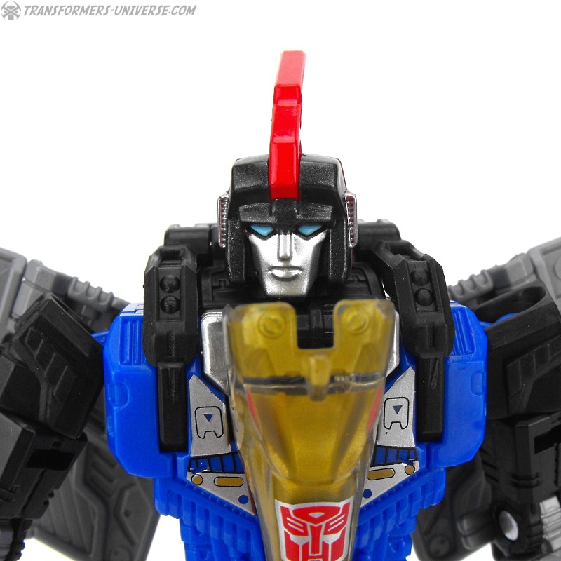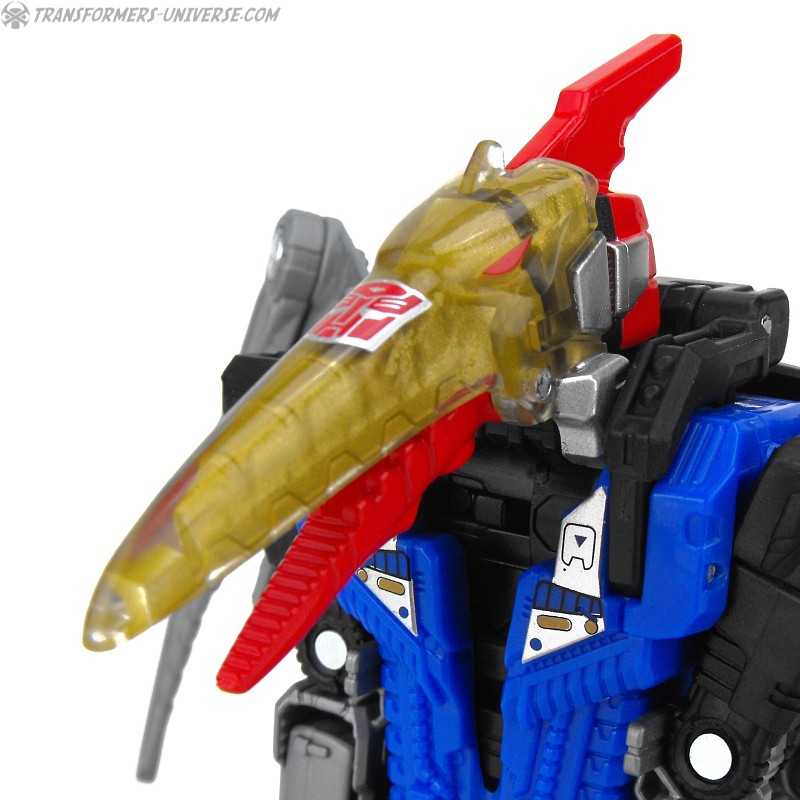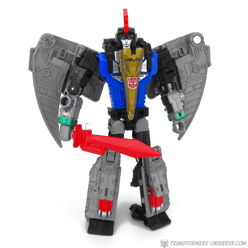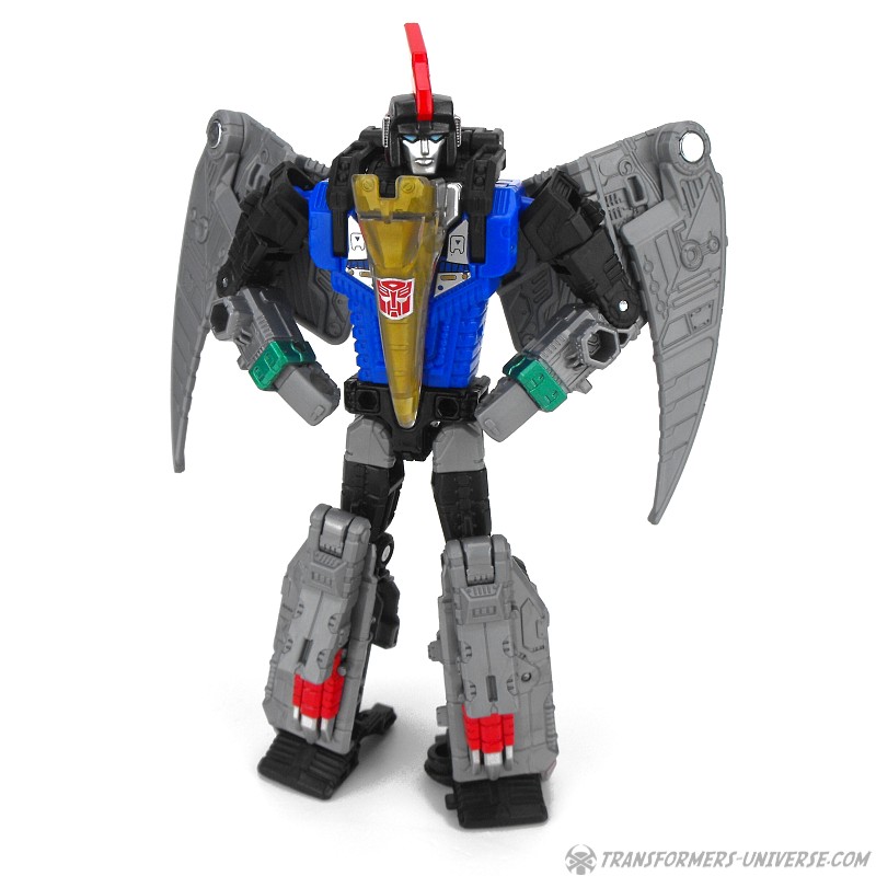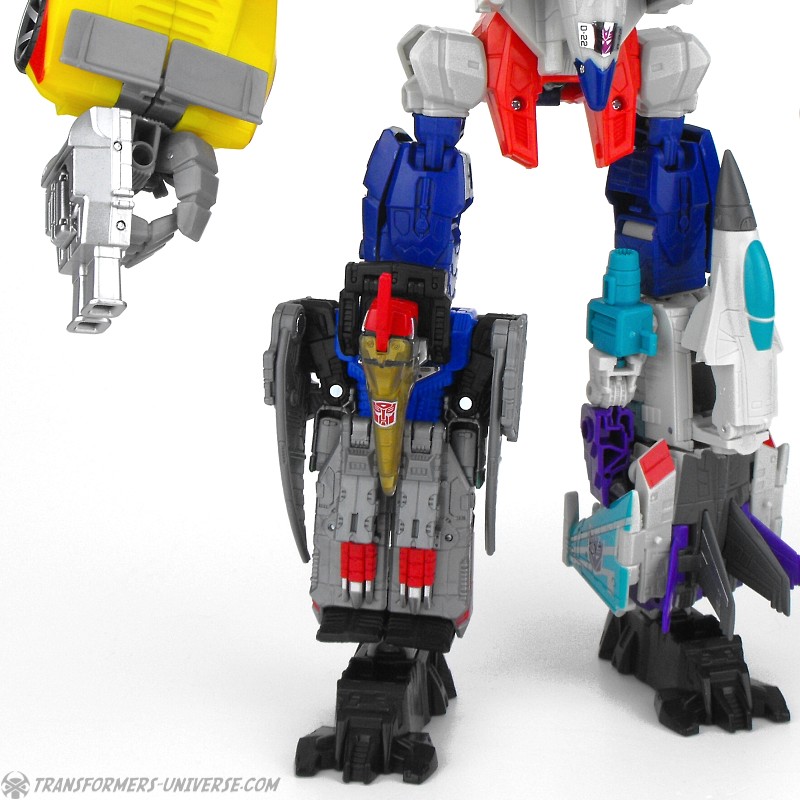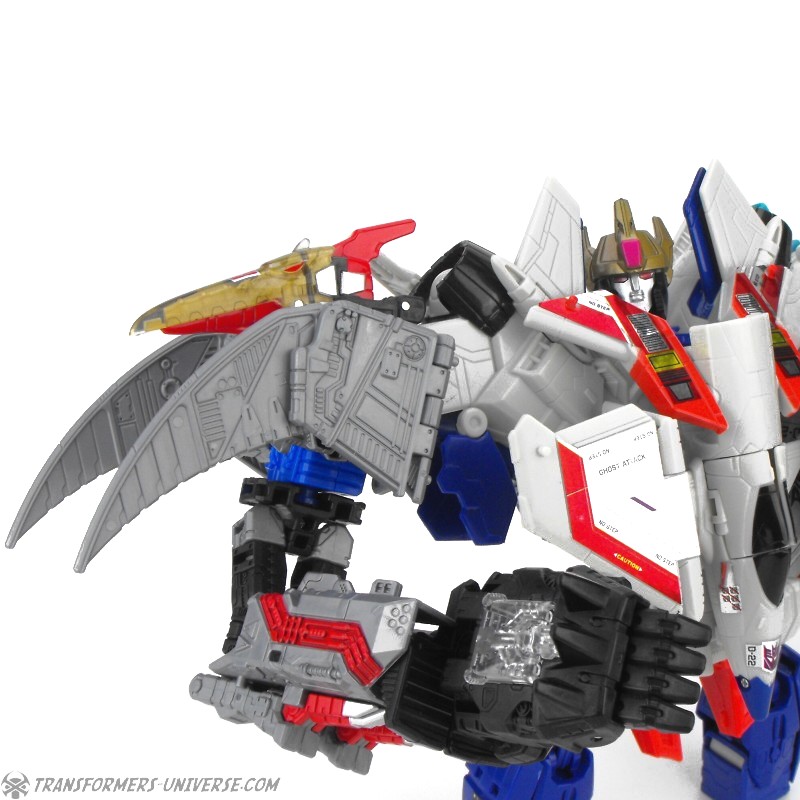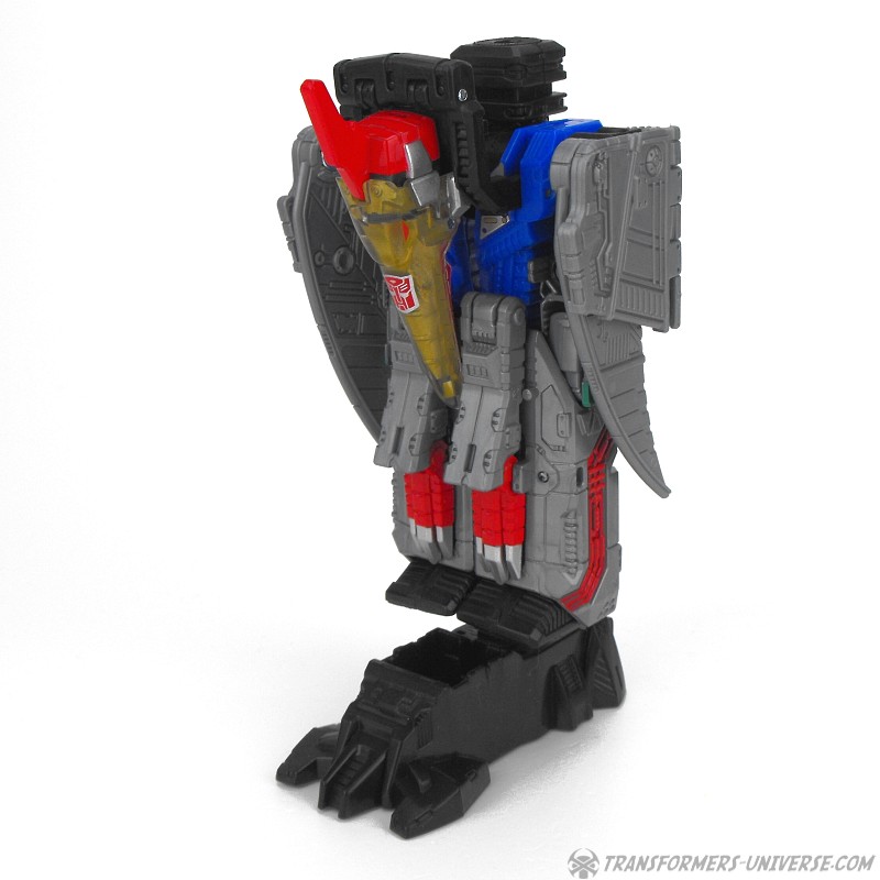 In terms of weapons Swoop comes with his familiar red sword. What irks me a bit is that he has neither a gun nor any missiles. Given that his function is “bombardier” (even mentioned as such in the profile text), it seems strange that he doesn’t have any missiles or bombs in either mode. As an additional accessory he comes with a fist for his combiner mode (see below) that doubles as chest armor. Here is where he can place one of the Prime Masters if you so choose. I have to say, though, that Swoop looks misproportioned with the chest armor. Plugging the big hand into his forearm looks much better, if you wish to use it.