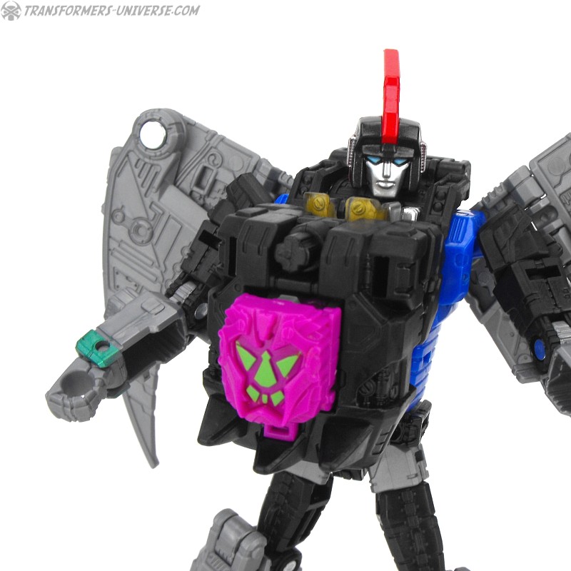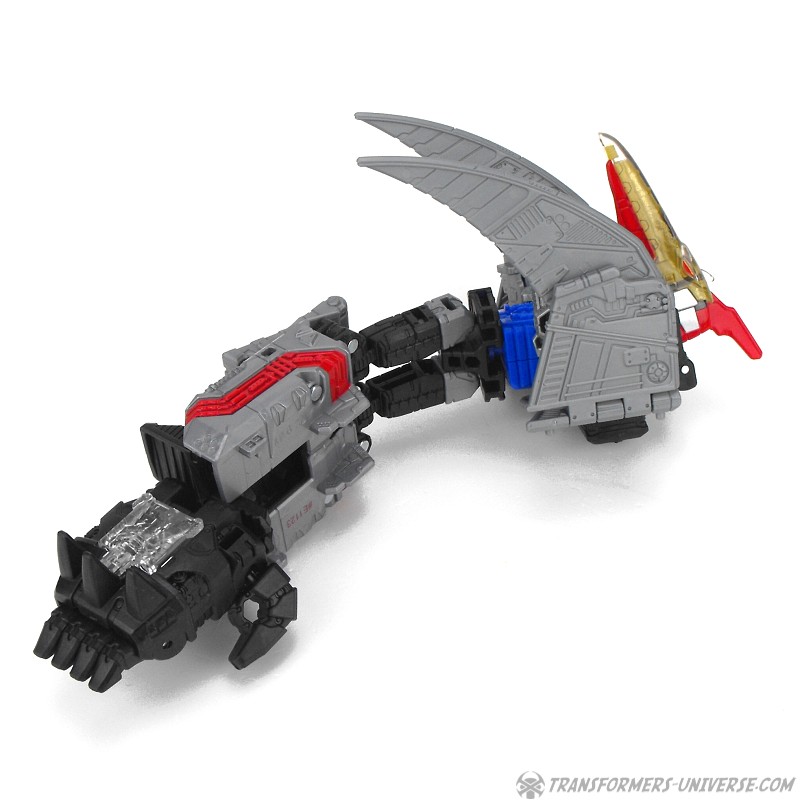 Combiner Mode: Though it’s not advertised on the toy’s packaging at all, Swoop is a working combiner limb in the Combiner Wars style. He can become either an arm or a leg. In arm mode he uses the chest armor as a hand, in leg mode he needs the foot piece that comes with a Voyager-class PotP figure. Nominally he is part of the Volcanicus Dinobot combiner, but he is compatible with any Combiner Wars style combiner.