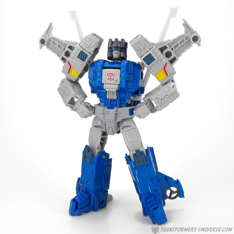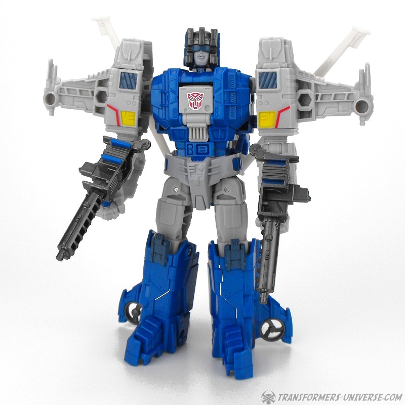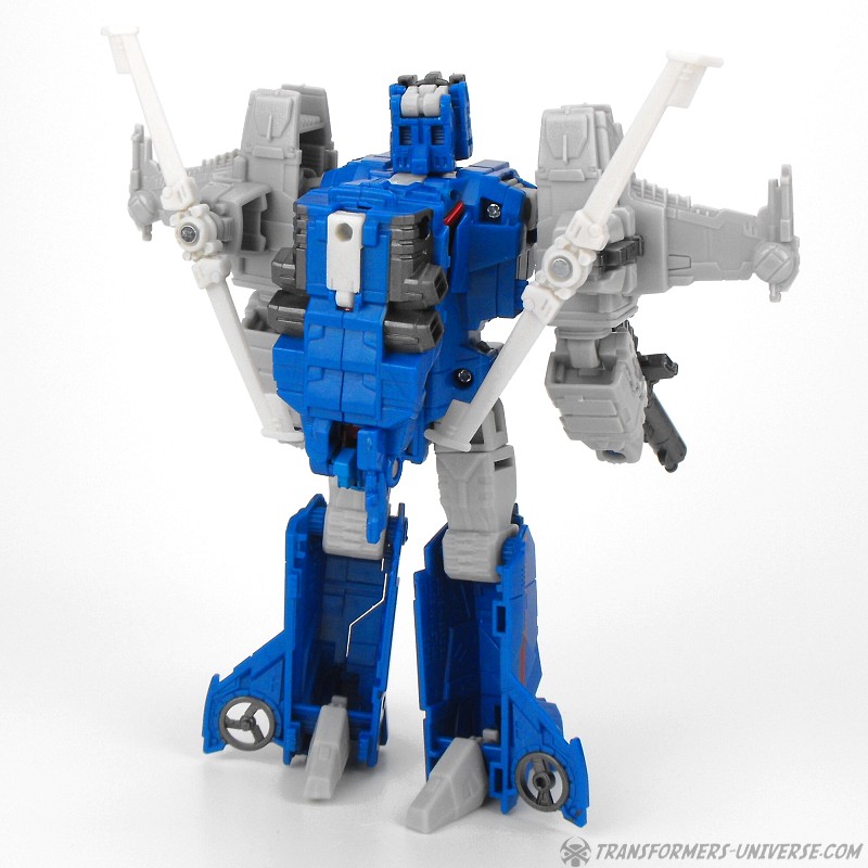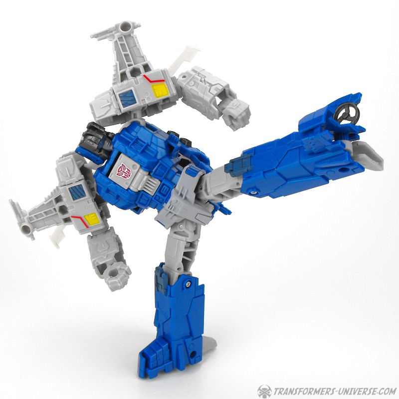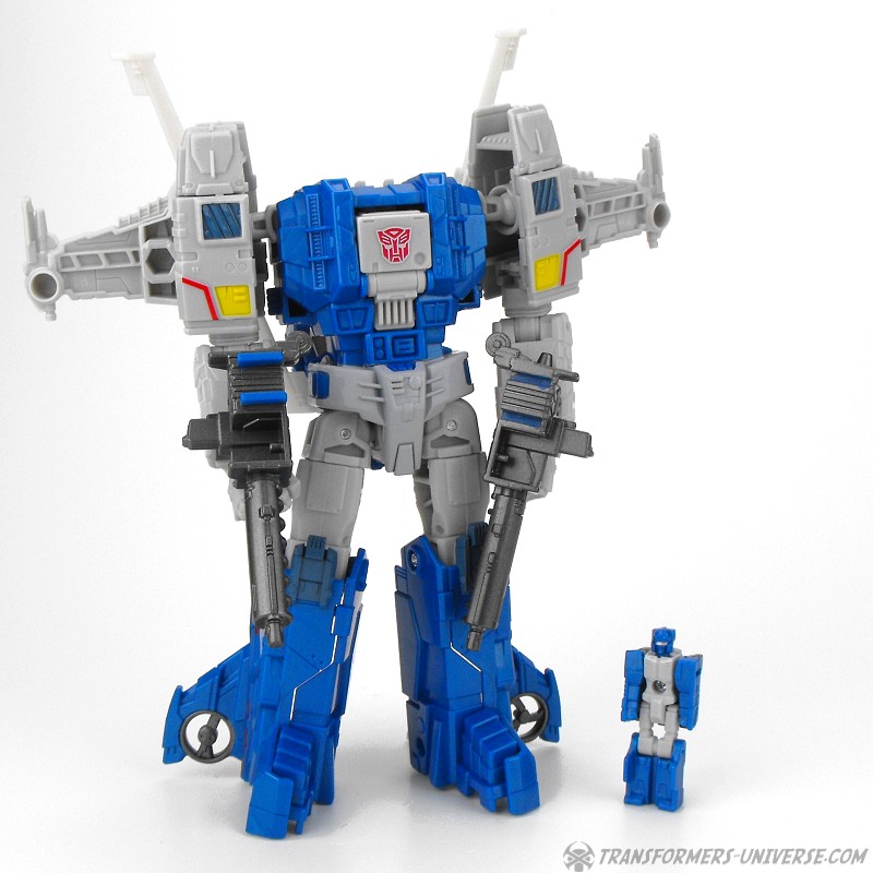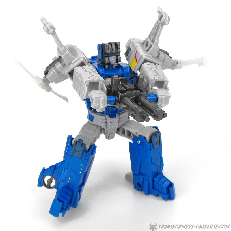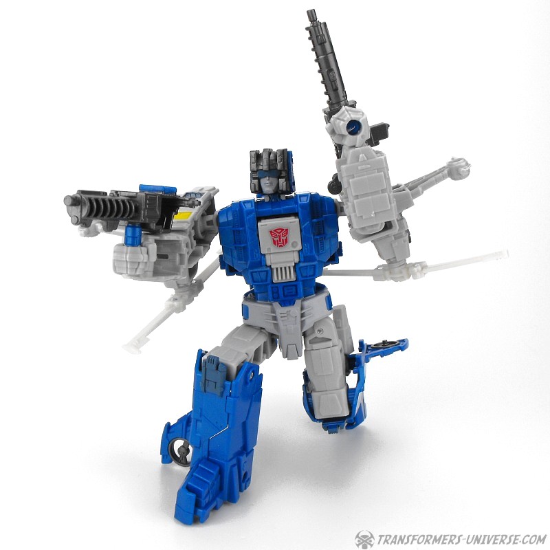 Detailing on the figure is pretty nice, too, and Highbrow has a solid stance as well, so he can pull off quite a few poses. One thing I’d have liked would be for the rotors on the back of his shoulders to fold together as they did on the G1 figure, but that’s just a minor thing. In terms of armaments Highbrow comes with two rifles which can combine into a bigger cannon, which he can hold double-handed in a pretty cool pose, too. So bottom line, a very nice robot mode. Some minor things could be improved, but overall I like it very much.