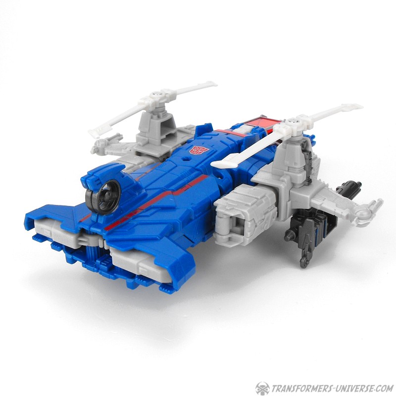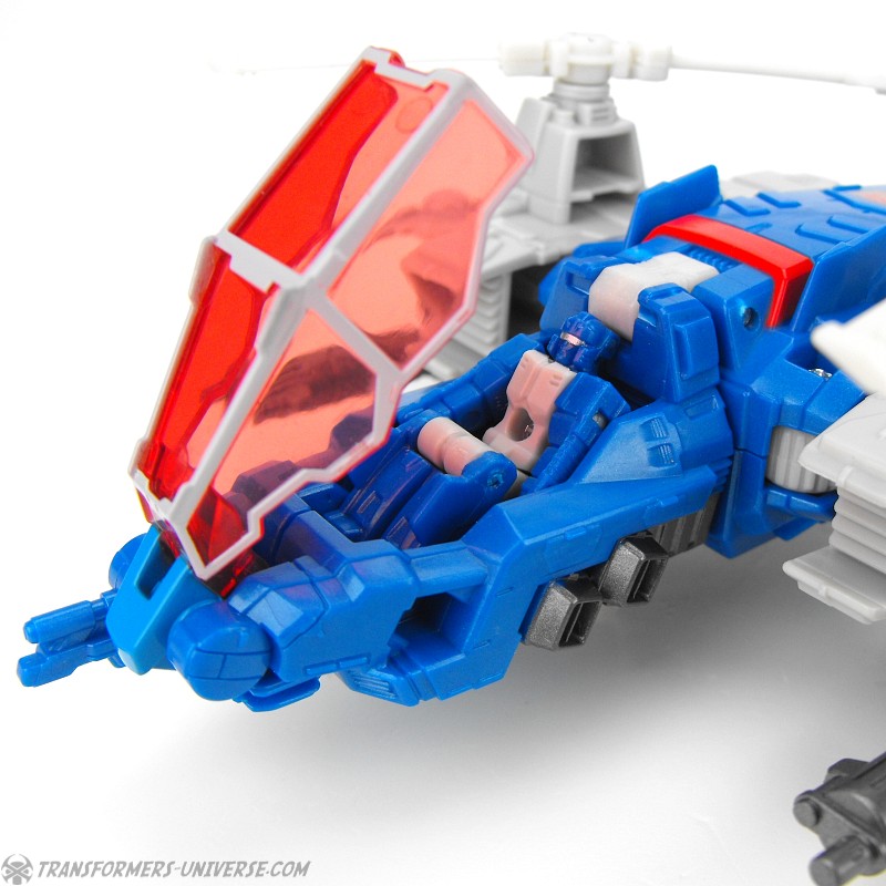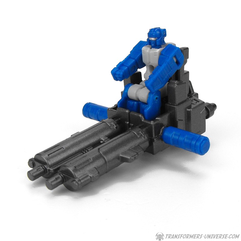 Alternate Mode: Highbrow transforms into a futuristic two-prop helicopter. It’s pretty much the exact same alternate mode as the G1 toy, just a tad more detailed and streamlined. The cockpit opens up so you can seat Xort (see below) inside and you can mount Highbrow’s two guns under the wings. Or rather, you HAVE to mount Highbrow’s guns under the wings, because the rear wheels of the landing gear are actually part of the guns, only the front wheel is part of the actual toy. Also, if you mount the guns as depicted in the instruction sheet, the landing gear is turned sideways instead of down (maybe it’s meant to be retracted here?).