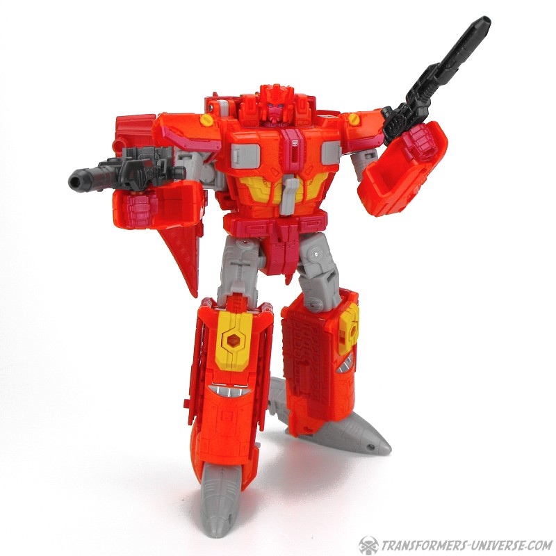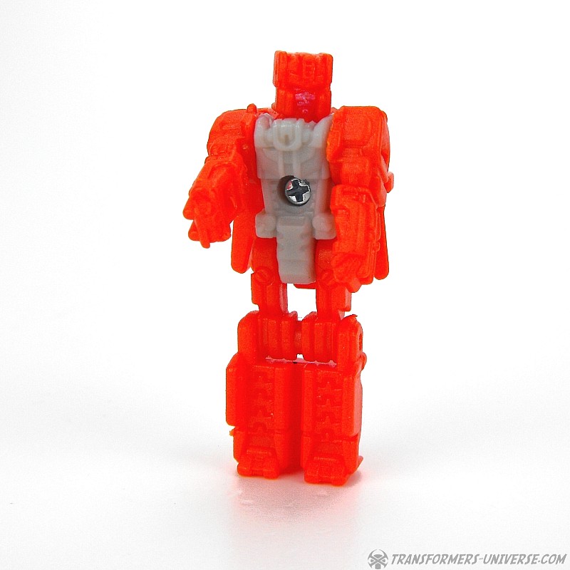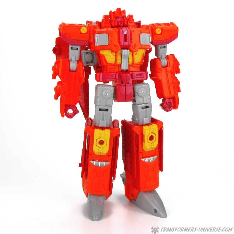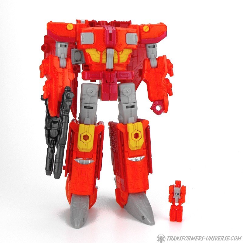 As a figure Sentinel Prime looks pretty good. There is a lot of detailing to be found (you can see it once your eyes have adapted to the blinding orangeness of him), he is nicely articulated, and his face is sufficiently Prime-like, too. Sentinel comes with two dark grey guns, a smaller rifle and a bigger one that features a seat for his Titan Master companion Infinitus (see below). The two rifles can combine into a single one, too, and Sentinel also has sculpted guns on his arms. Nicely done.