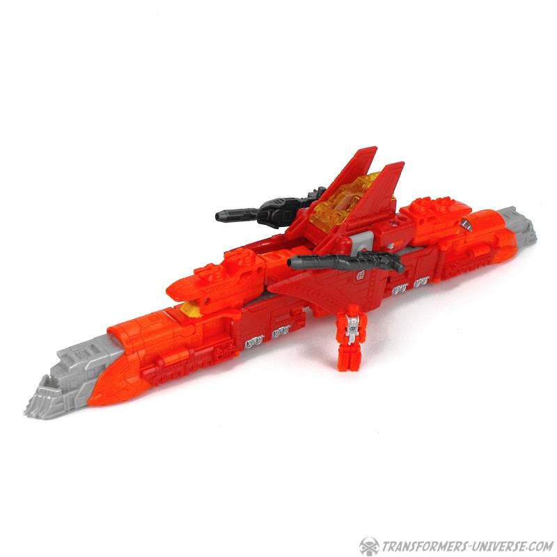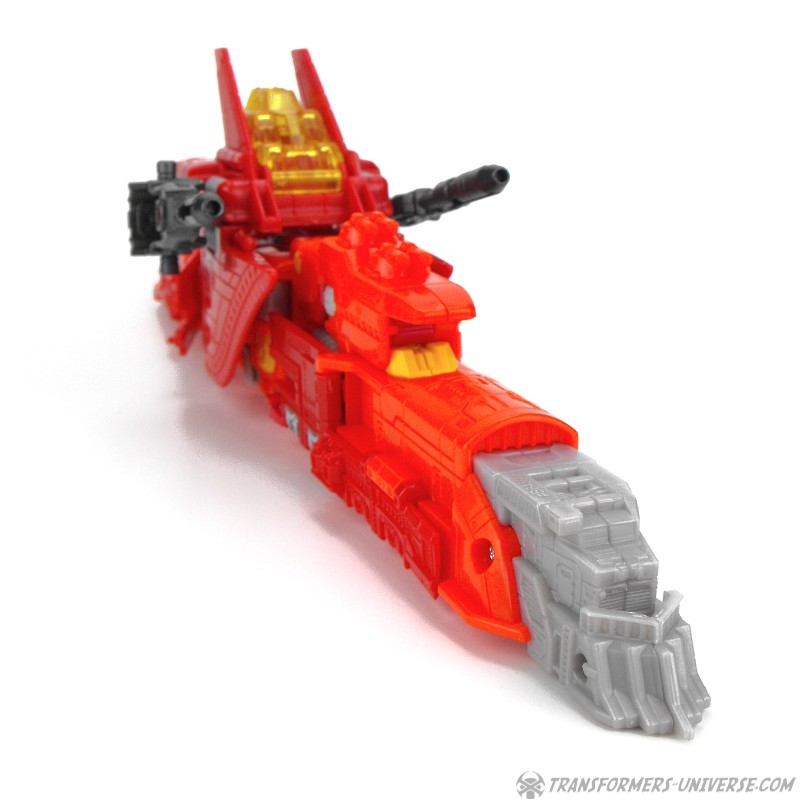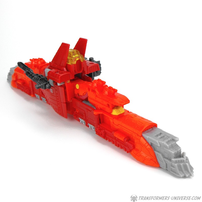 Alternate Modes: The mold of this figure was originally created for Astrotrain, so it does not come as a surprise that he’s a triple changer with a space shuttle and train mode. Let’s start with the, to me, far superior mode, the space shuttle, or star cruiser, really. The transformation is rather basic, as Sentinel basically just lies down on his stomach with his toes becoming the nosecone of the starship, but it works nicely and the resulting craft looks just fine (still very orange, though). There are numerous ways you can attach Sentinel Prime’s rifles and a cockpit for Infinitus sit in. Overall it’s not a spectacular mode, but looking good.