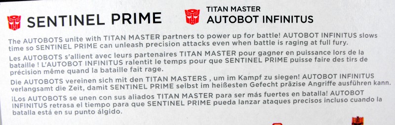 Partner: Sentinel Prime comes with Infinitus, a small Headmaster… excuse me, Titan Master figure that transforms into his head. Infinitus is pretty small, about the size of the 1988 “Junior” Headmaster figures from G1, and can move his arms at the shoulders and bend his connected legs at hip and knee. About as good as a figure this small can get, I guess. I don’t see myself transforming him out of head mode all that often, to be honest.
