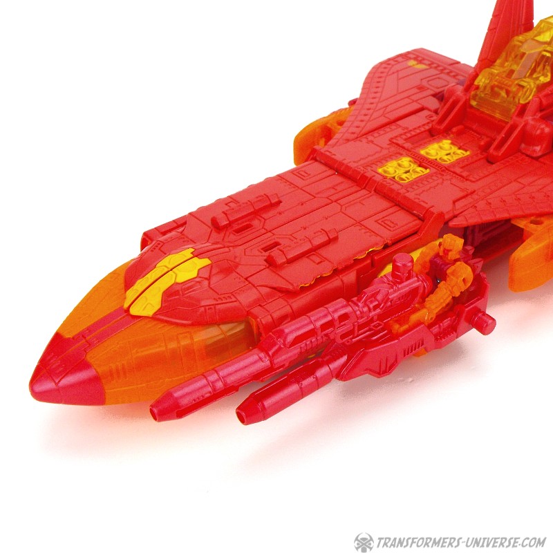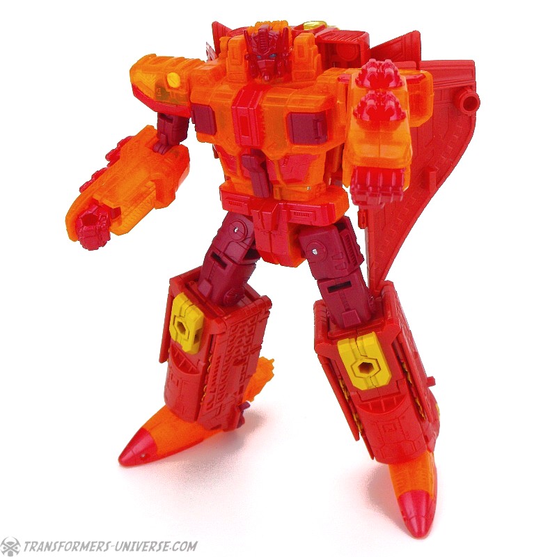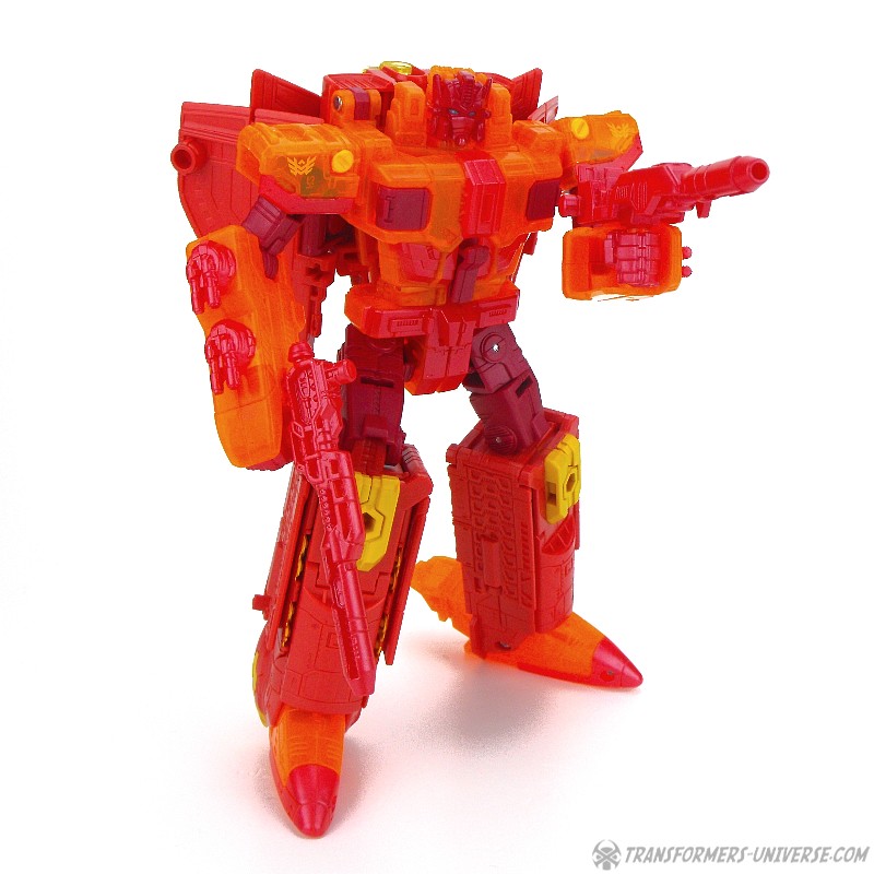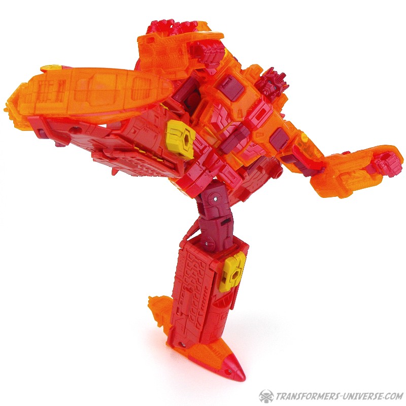Robot Mode: This version of Sentinel Prime was an exclusive figure at SDCC 2016 as part of the three-figure Titan Force set. I already reviewed the retail version of this figure here way back in 2016 (GOD, HE’S SO ORANGE!!!), so this review here will focus mainly on the differences. Those being the application of numerous transparent-orange parts where the original had non-transparent orange (SO! MUCH! ORANGE!), what were once grey parts are now red, and… yeah, that’s pretty much it. As a result of this, Titan Force Sentinel Prime is even harder to photograph than retail Sentinel without turning into a vaguely robot-shaped orange blob in the process.