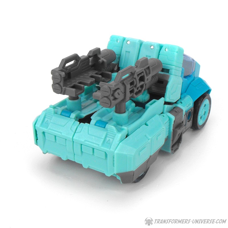 Alternate Mode: Kup transforms into a futuristic-looking pickup truck (for those few who don’t know, that’s actually where his name comes from: picKUP). The vehicle looks a bit boxier and more compact that the vehicle mode of G1 Kup, but it’s clearly meant to be the same vehicle. Also, it actually has a cockpit that opens up to seat Flintlock (see below), so it’s bound to be a bit boxier. The vehicle looks pretty good and shows no obvious robot bits. Kup’s two guns can be stored on the back of the truck, either separately or combined into a gunner’s seat for Flintlock. All in all a good vehicle mode and a very good likeness to the vehicle mode of the cartoon character.