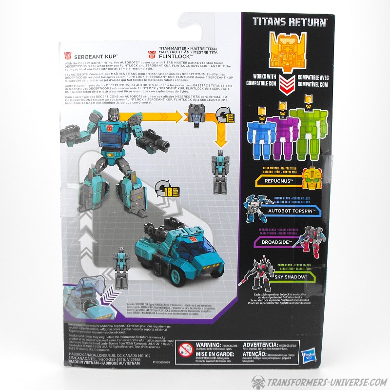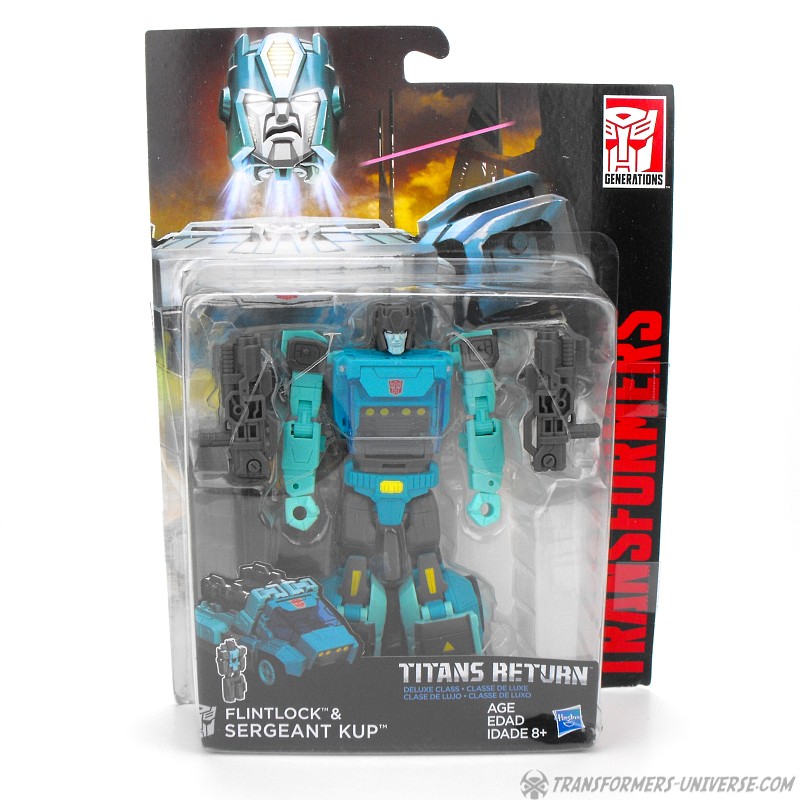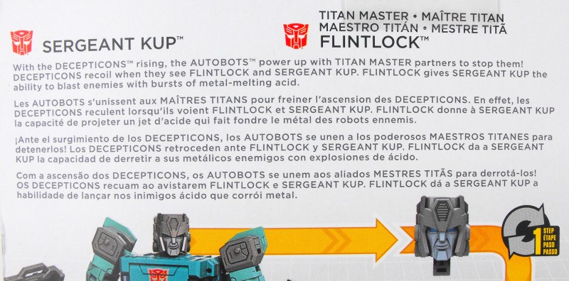 With the Decepticons rising, the Autobots power up with Titan Master partners to stop them. Decepticons recoil when they see Flintlock and Sergeant Kup. Flintlock gives Kup the ability to blast enemies with bursts of metal-melting acid.