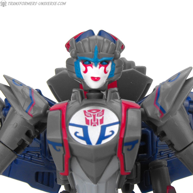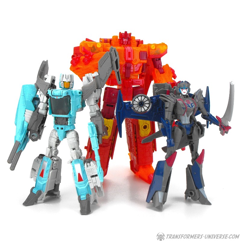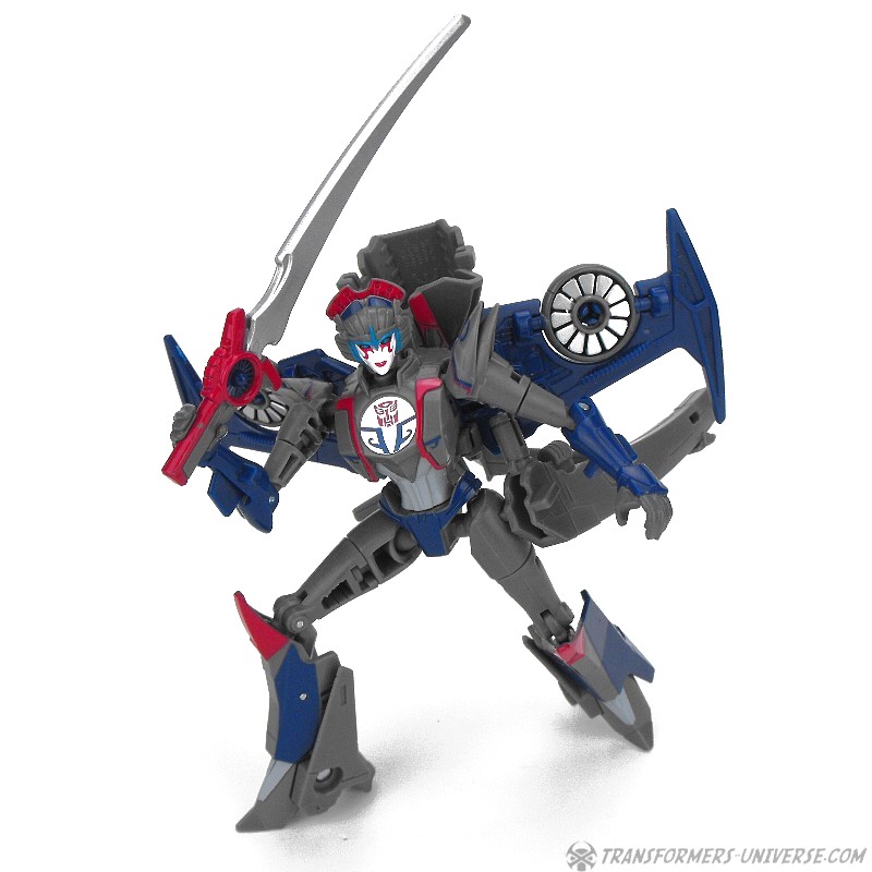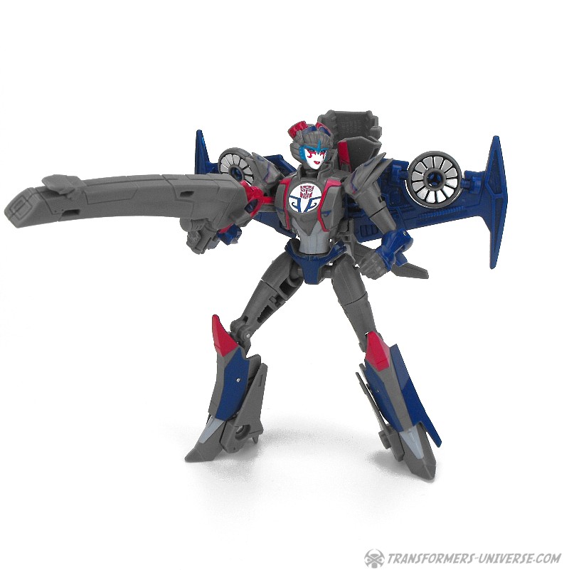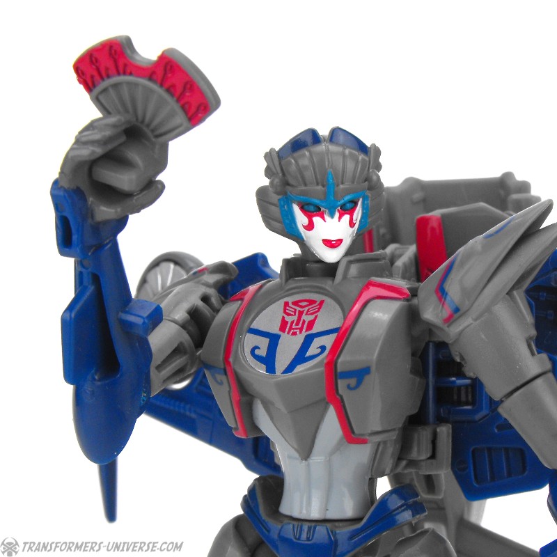 Remarks: After having written my longest-ever review, this one here might well be one of my shortest. Windblade here is a simple repaint of Robots in Disguise Windblade. No structural changes, just new colors, swapping out the red and black for blue and grey. And that’s pretty much it. Still a very nice figure, but the paint job seems pretty random to me. Windblade was part of a three-pack called Titan Force along with repaints of Brainstorm and Sentinel Prime. Why these three in particular? No idea, sorry. Anyway, the Titan Force three-pack is worth getting if you don’t have a Sentinel Prime or Brainstorm yet, but if you’re looking for a Windblade, I advise getting either the RID one or the new Titans Return version. This one here falls under “just another repaint”, I fear.