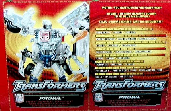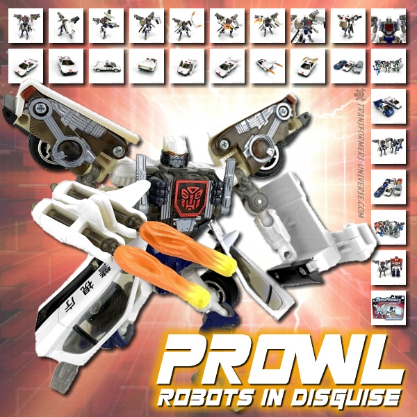 Prowl cruises the streets searching for enemy acitivity. His ultra-sensitive radars can detect the hum of a circuit from the other side of town. And once he locates them, they had better start running before he takes aim with his advanced weaponry. He can sabotage Decepticon plots with his electronic systems for jamming radios or hacking into systems.