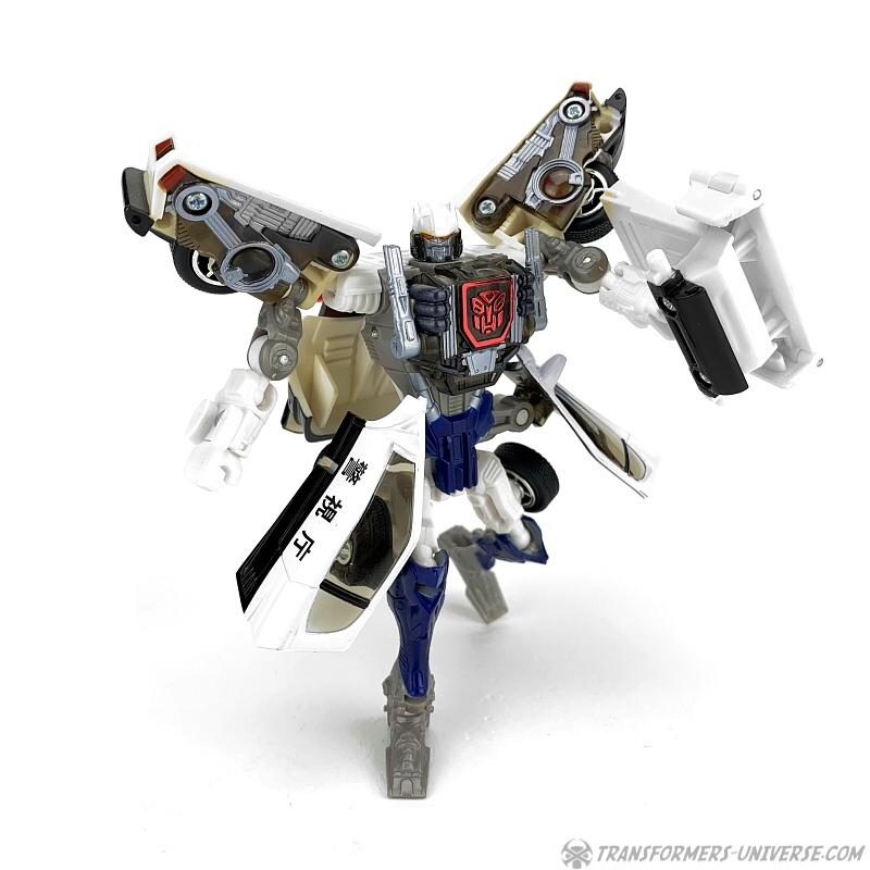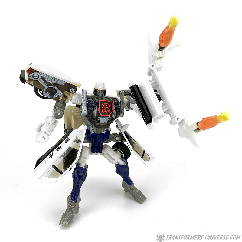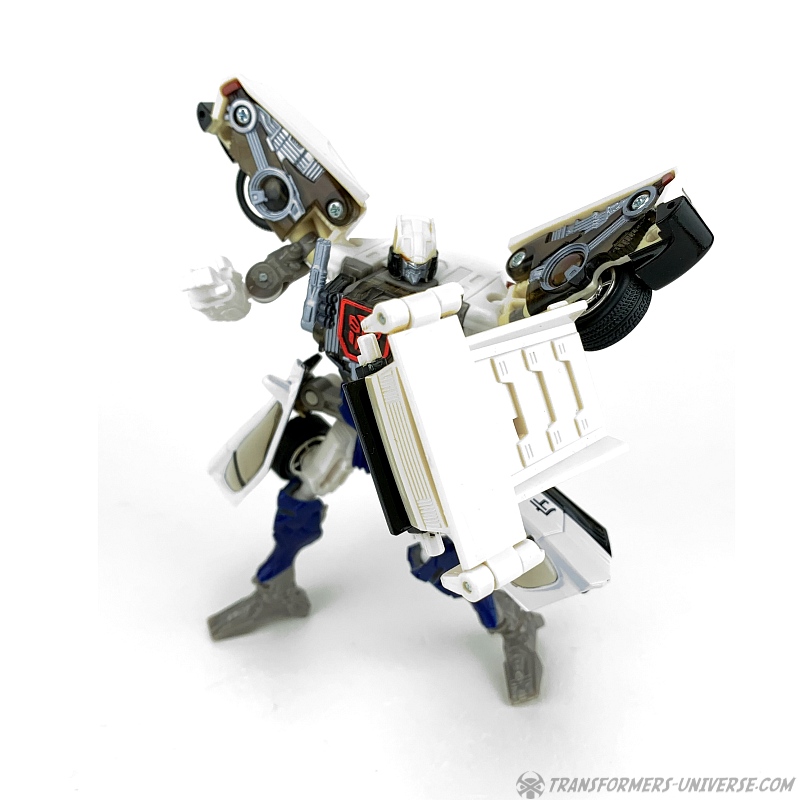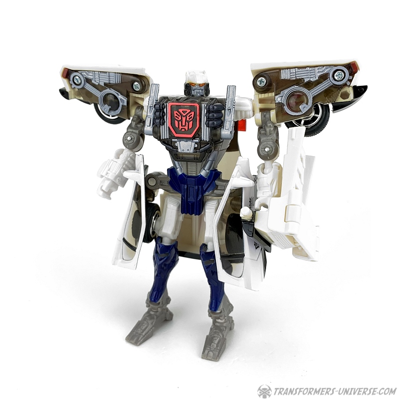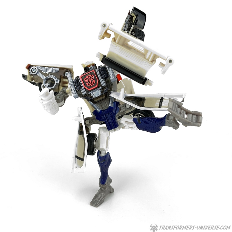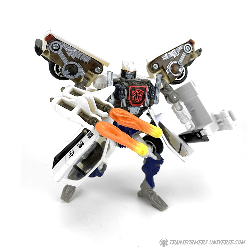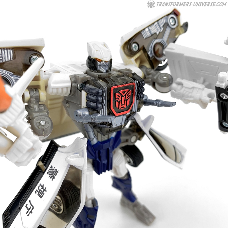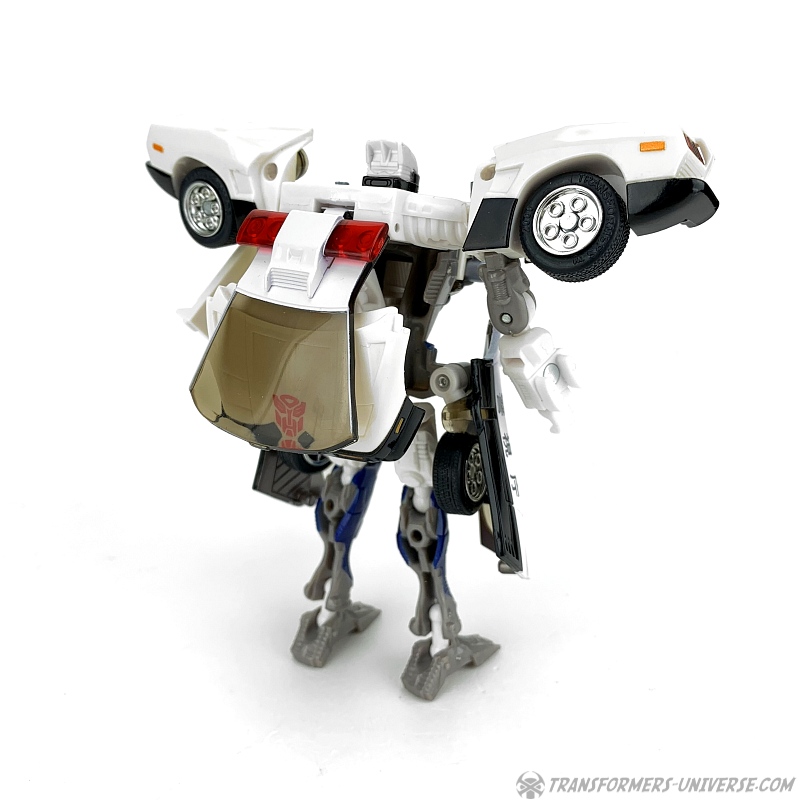 Robot Mode: Prowl makes for a slightly strange looking robot. He is a so-called shell-former, meaning that most of his car mode parts are folded away in some way or other. He is a lean, almost spindly figure with a huge backpack and lots of kibble hanging off of him, such as the car doors on his hips and the rear of the car on his left arm.