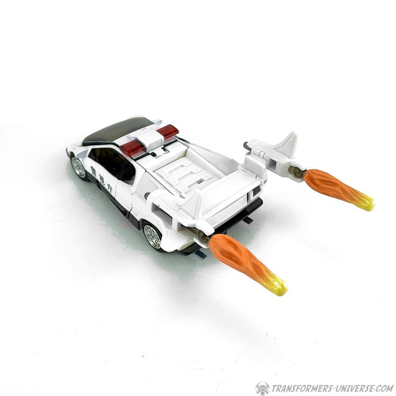Alternate Modes: Prowl transforms into a sleek Japanese police cruiser. The vehicle looks very realistic, has rubber tires, wing doors, and even some interior detailing with Prowl's robot feet becoming the seats. In order to enhance the car you can put Prowl's dual missile launchers on the rear spoiler, either facing forward as weapons or backward as booster units. The car mode is very nicely done and, after the lengthy 'Beast'-era of Transformers toys, signalled the return to true vehicle modes.