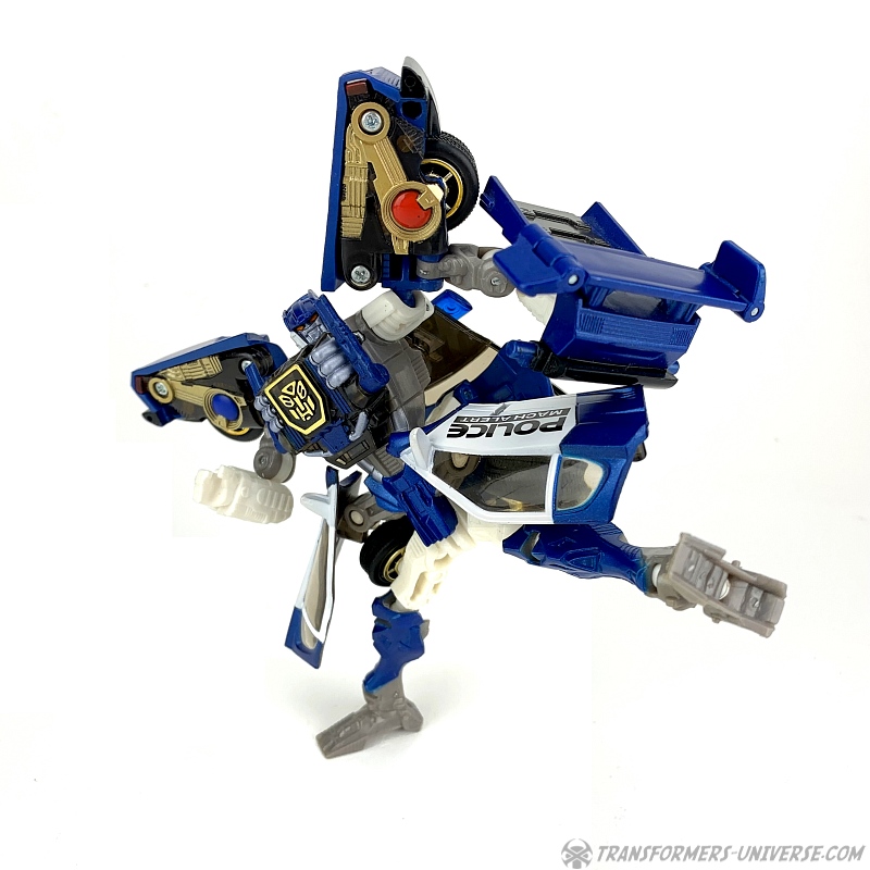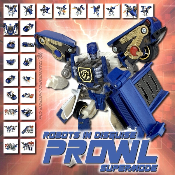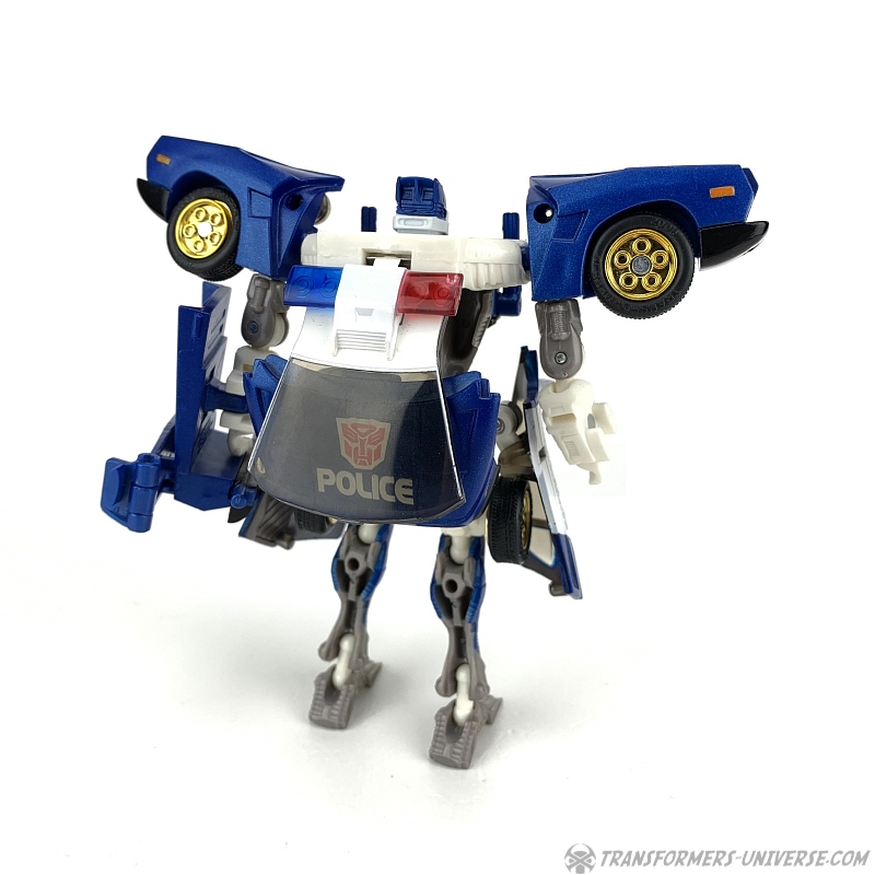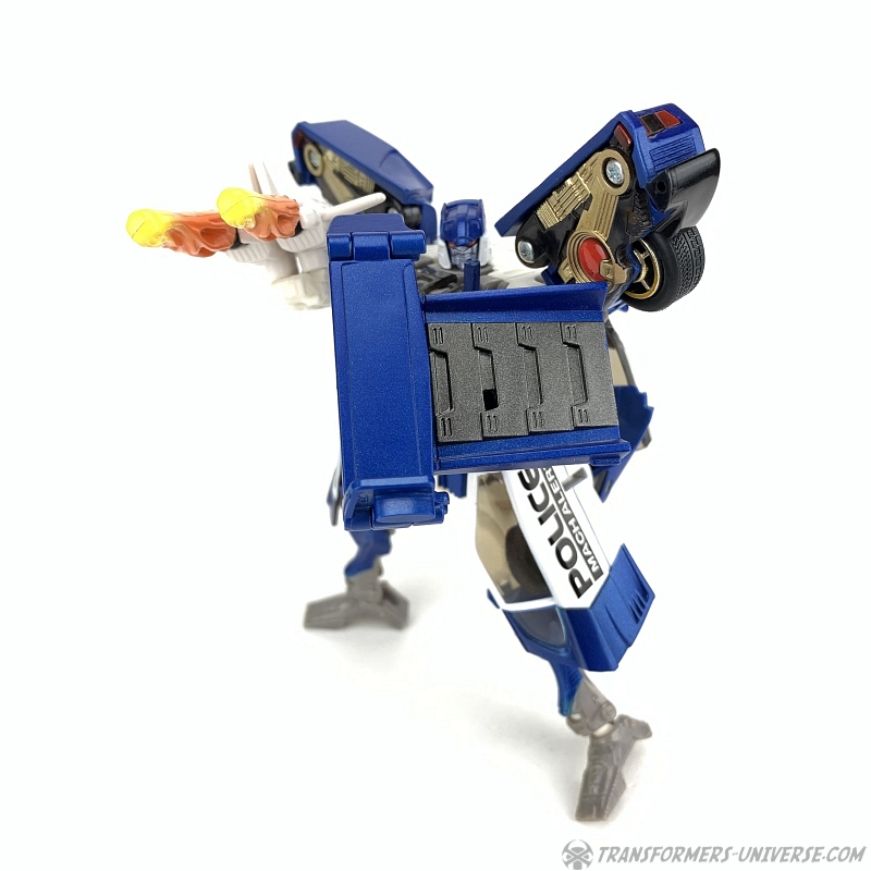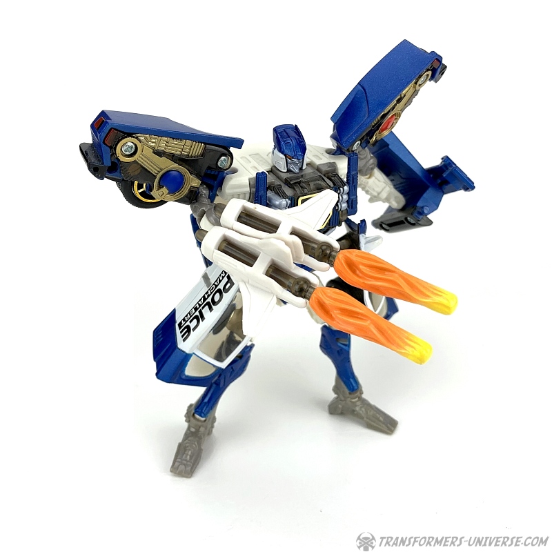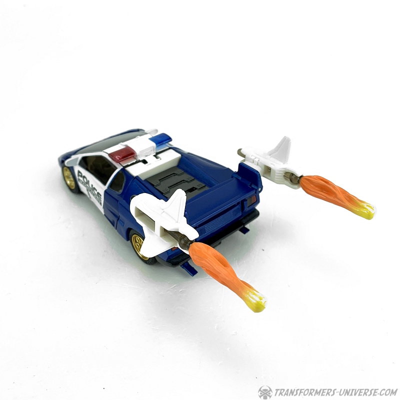 Remarks: Supermode Prowl is a repaint of RID Deluxe Prowl, so look for the full review there. Just a few words on the differences. For his power-up Prowl's mostly white exterior in car mode was recoloured partially blue, just like some parts of his inner robot mode. The gimmicks have remained the same, the missiles and launchers are pretty much identical. Oh, and the insides of his wheels are gold now, not silver anymore.