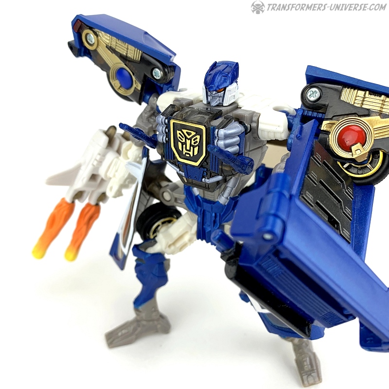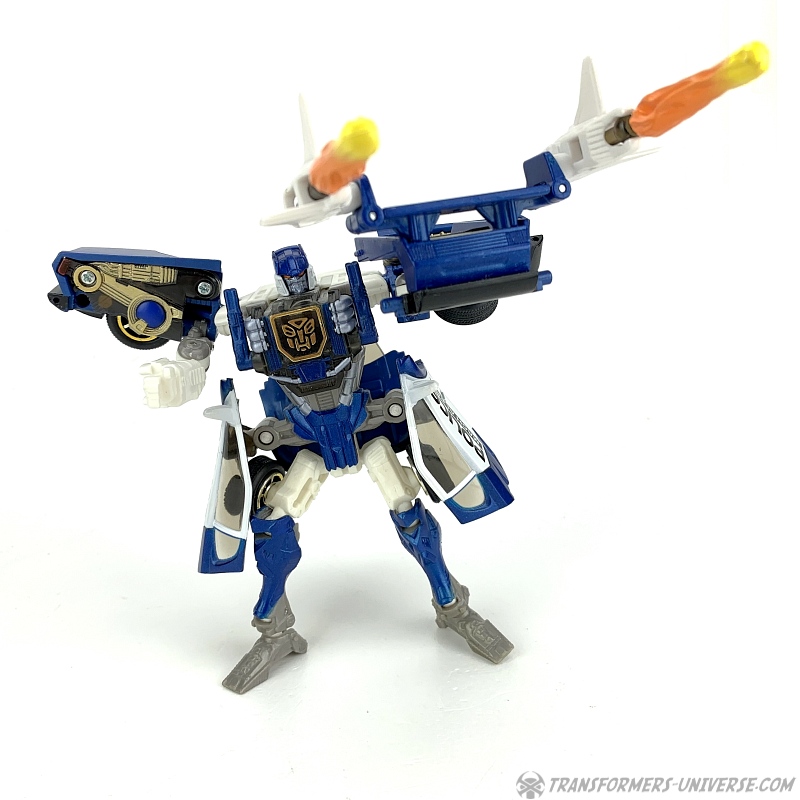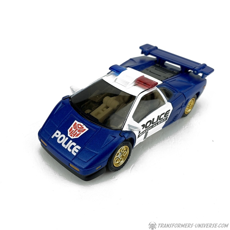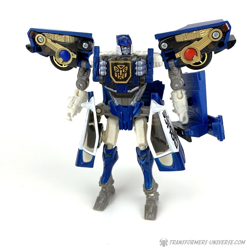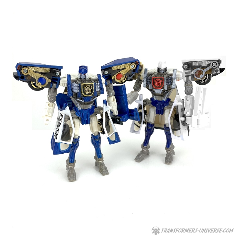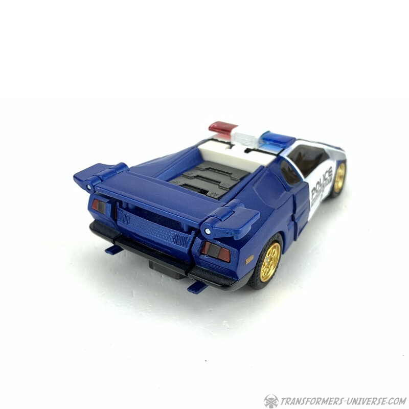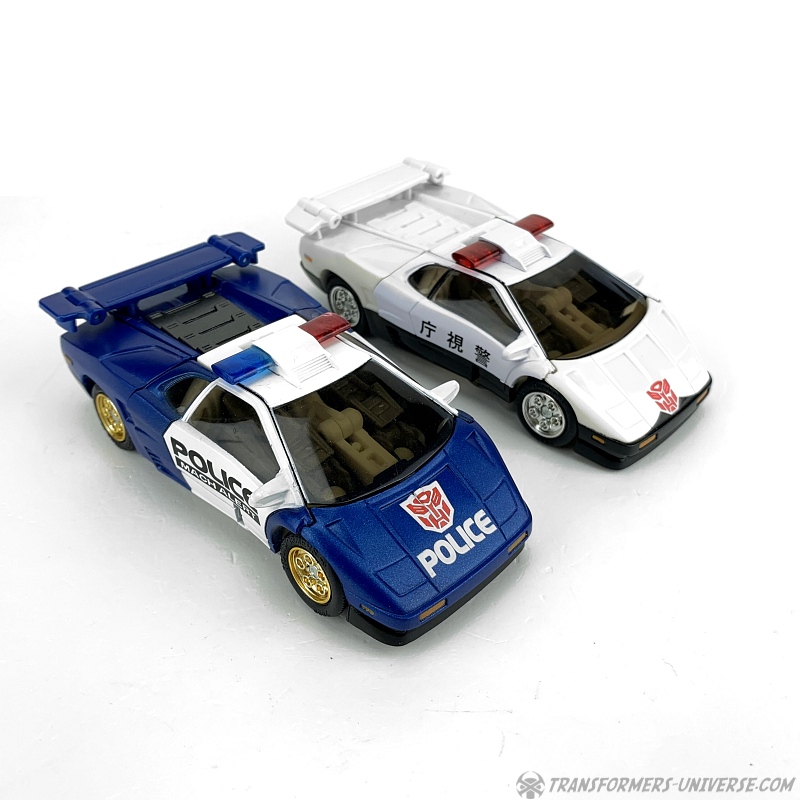 Prowl's repaint is pretty much the most straight-forward of the three Autobot Brothers, seeing as he kept parts of his white exterior and just added some blue. It fits, seeing as Prowl was the most boring of the three Brothers in the cartoon, too. To tell you the truth I pretty much just got this one here for completeness' sake, but that doesn't change the fact that he's a pretty solid robot, though some people might be turned off by his strange proportions and lots of kibble. Not me, though. I like Prowl, whether in white or white-blue.