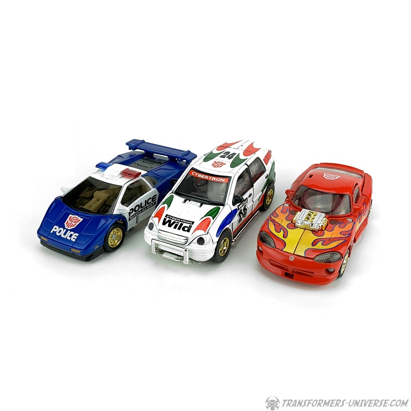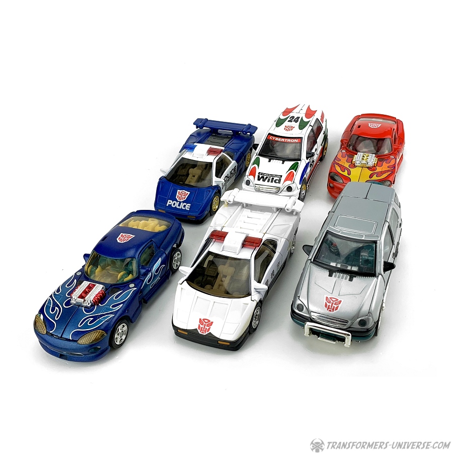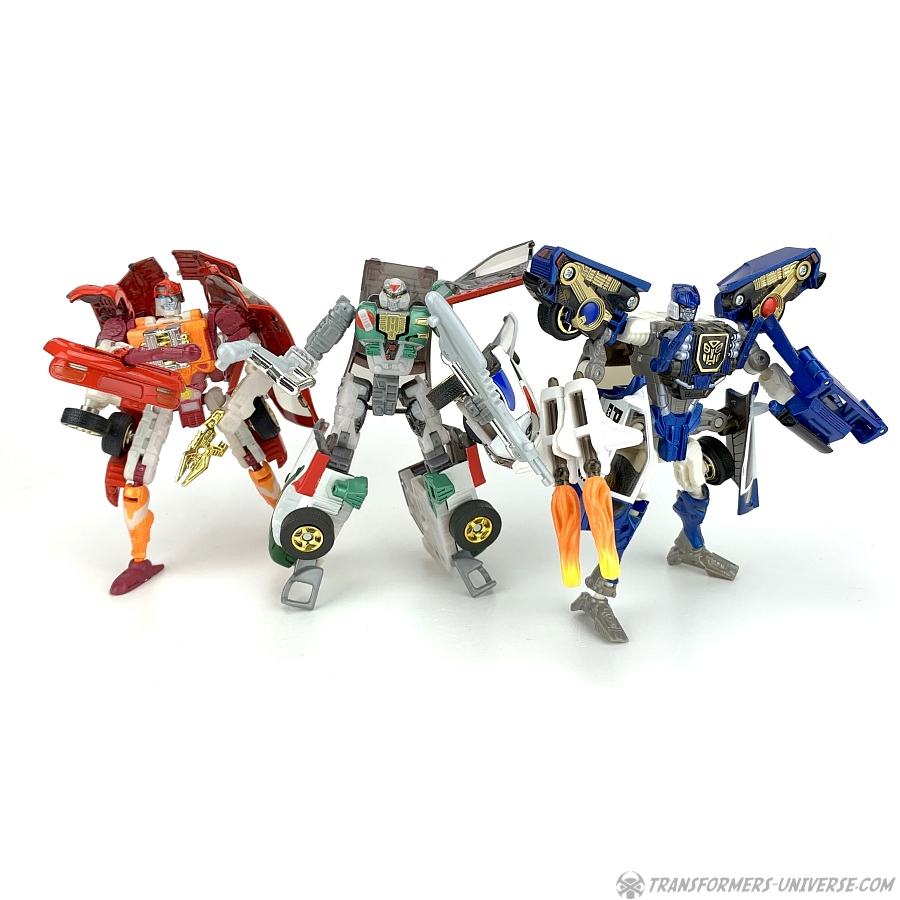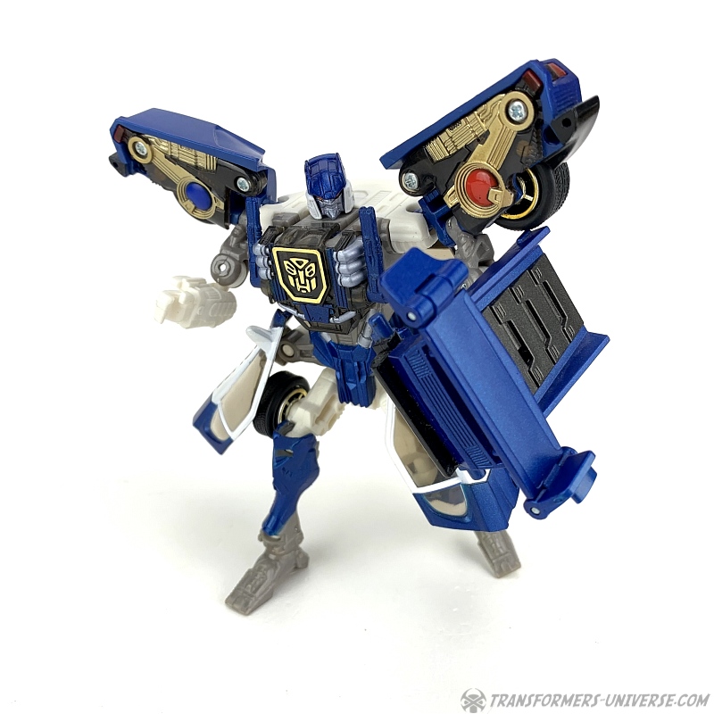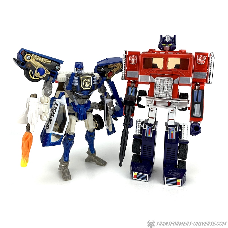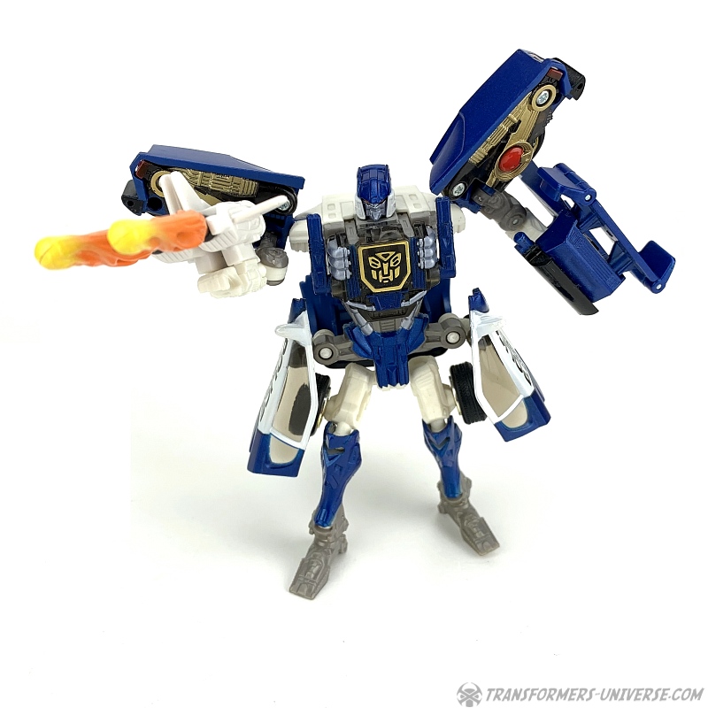 Prowl's repaint is pretty much the most straight-forward of the three Autobot Brothers, seeing as he kept parts of his white exterior and just added some blue. It fits, seeing as Prowl was the most boring of the three Brothers in the cartoon, too. To tell you the truth I pretty much just got this one here for completeness' sake, but that doesn't change the fact that he's a pretty solid robot, though some people might be turned off by his strange proportions and lots of kibble. Not me, though. I like Prowl, whether in white or white-blue.