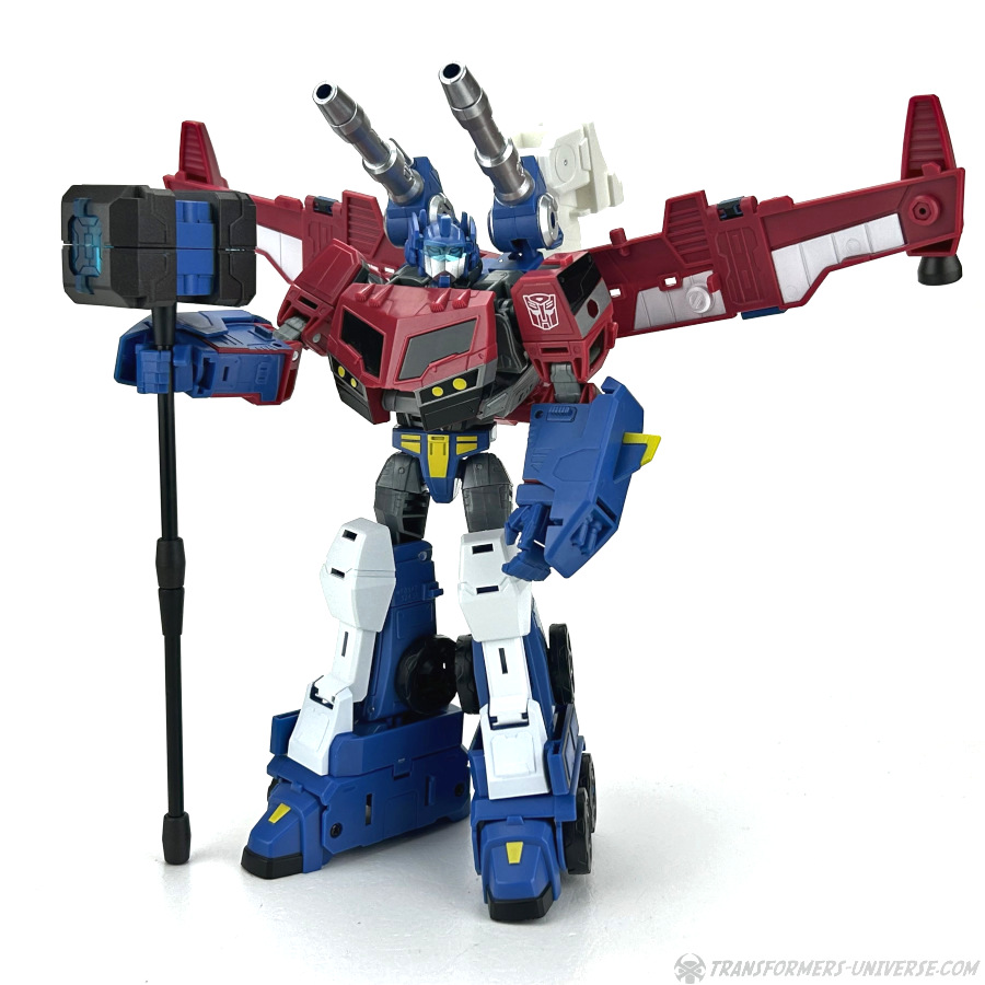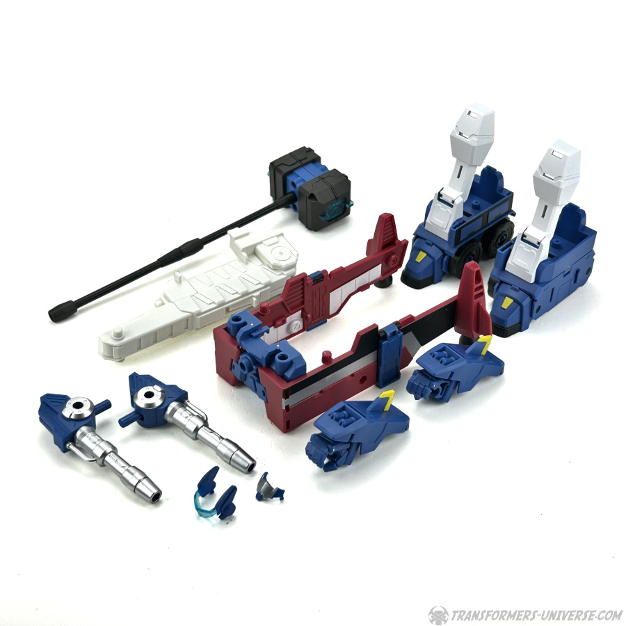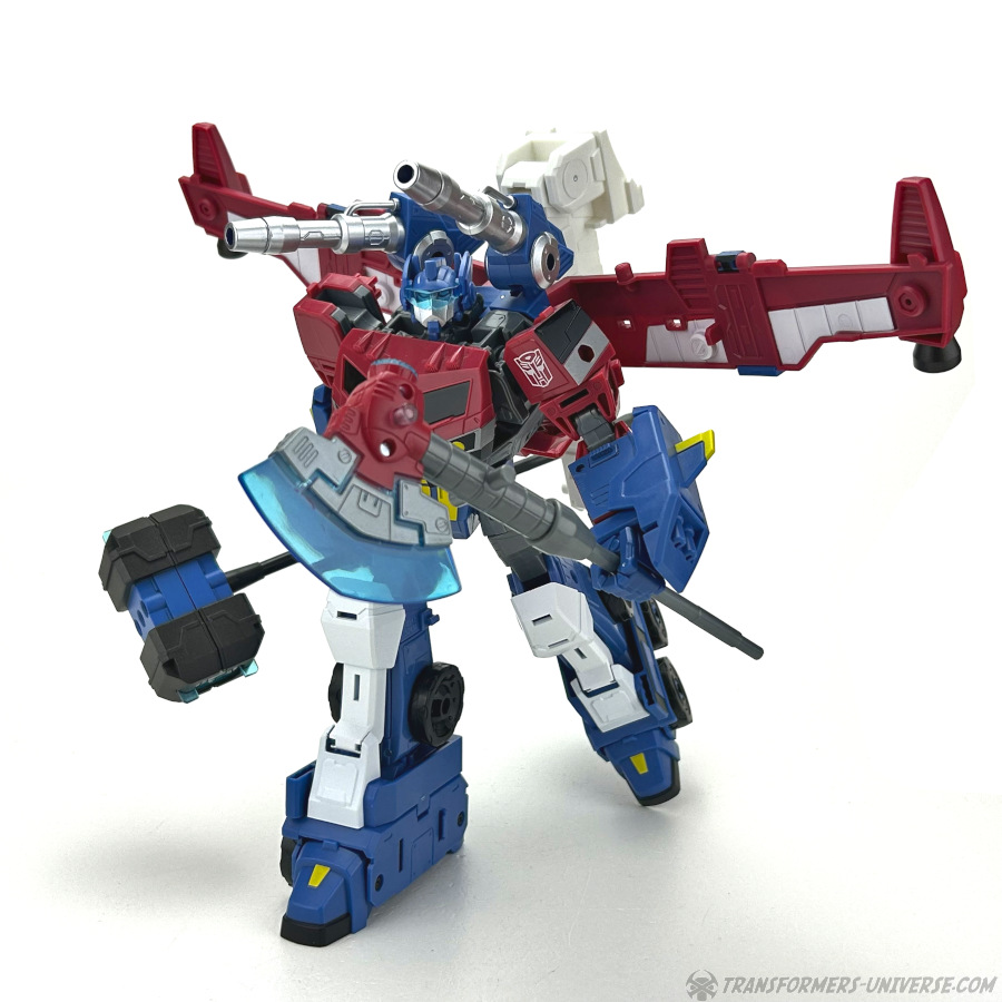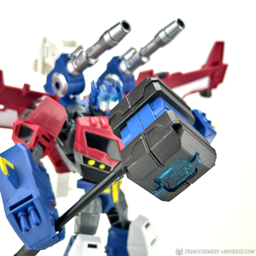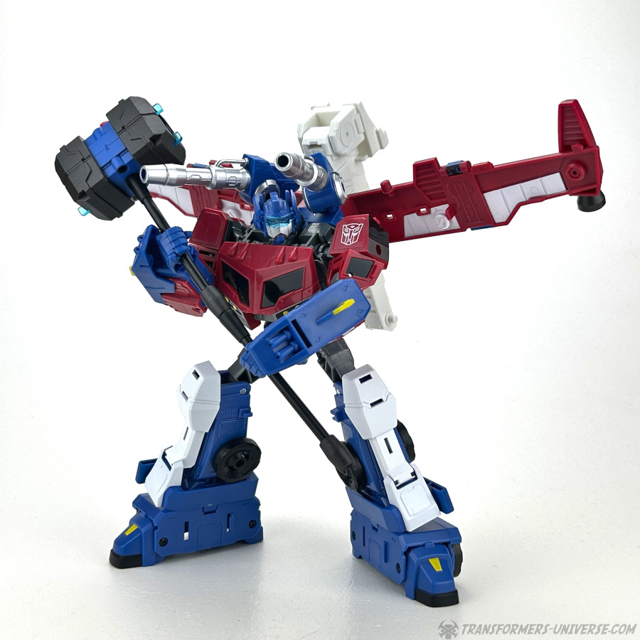 Apart from the aforementioned winged rucksack (which clips into Optimus’ back once you fold down the truck canopy from his back) with its water cannons and the stabilizer gloves (which once again feature brand-new, articulated hands), you have a chunky pair of boots with ankle tilt, a mouth plate, and two different visors you can put over Optimus’ eyes, one in blue and one in white. The set also contains the Magnus hammer, which pulls double duty as a storage device, as you can store the visor and mouth plate inside its head.