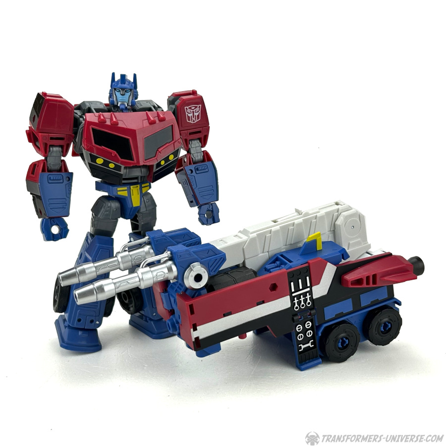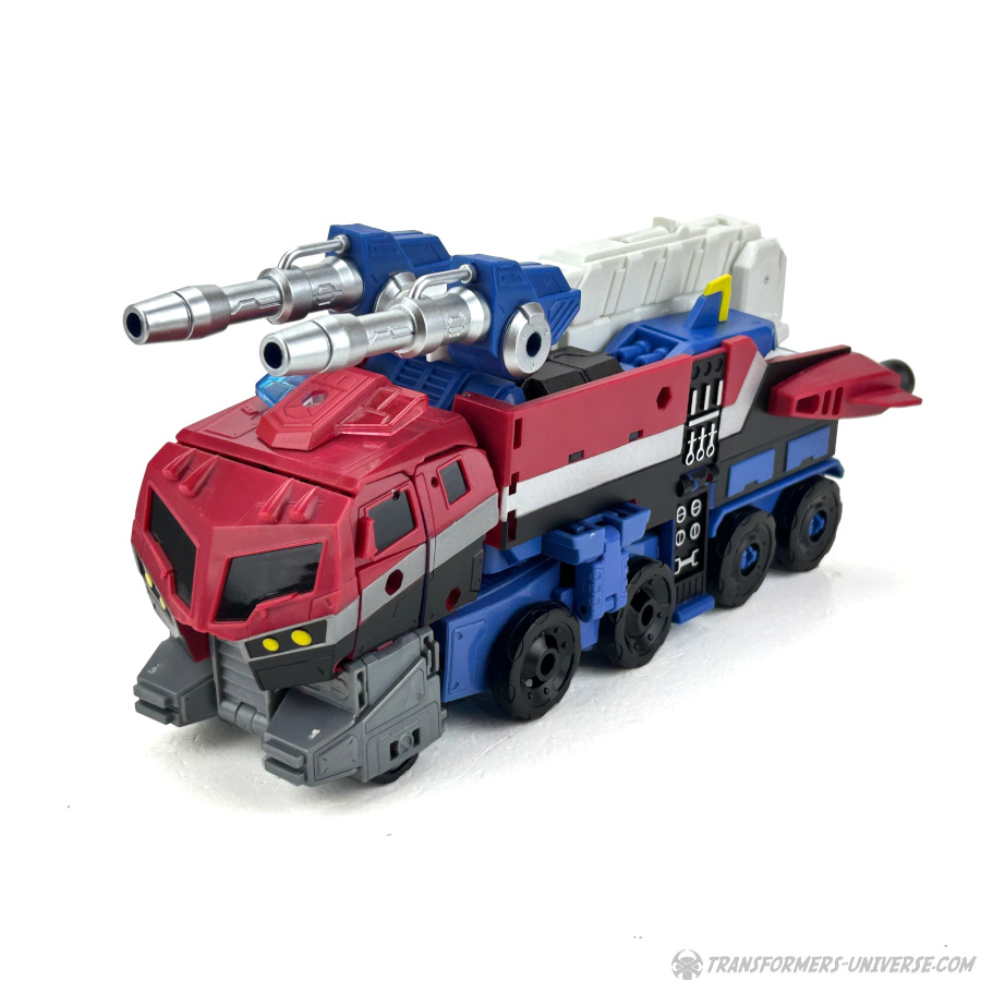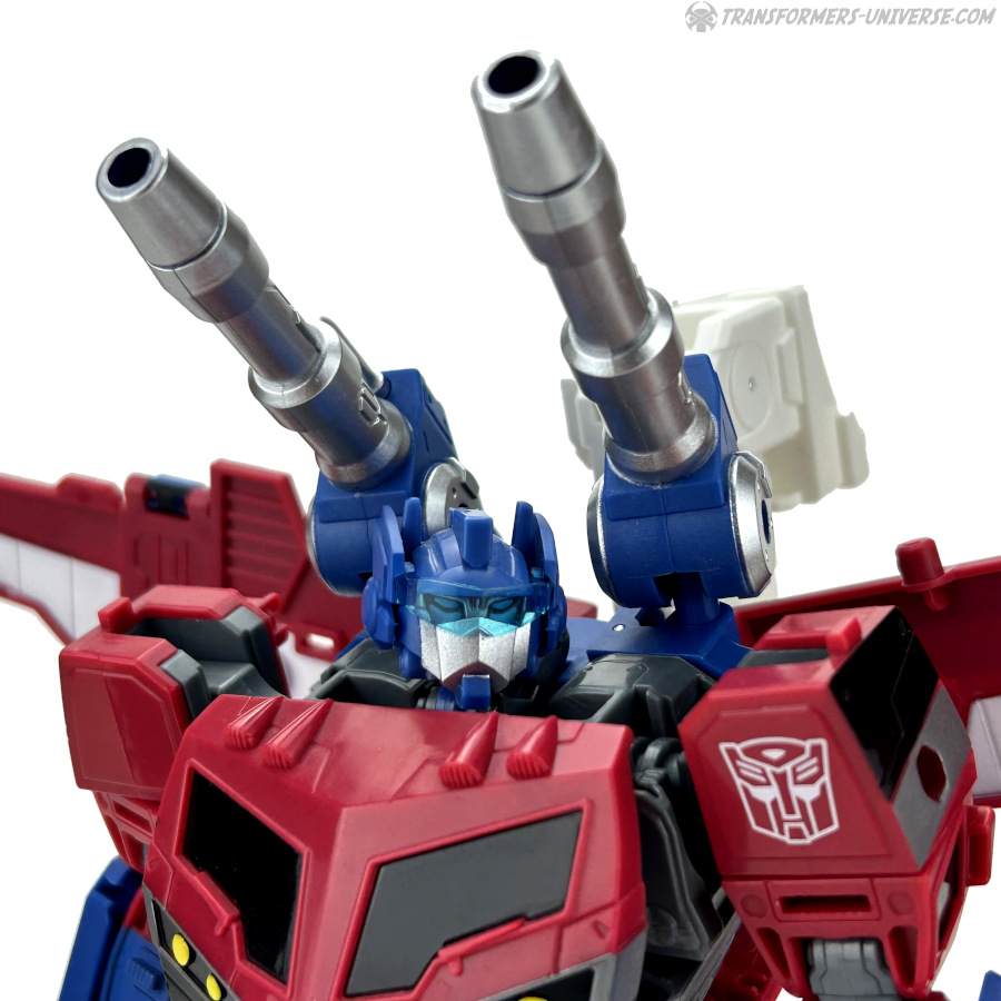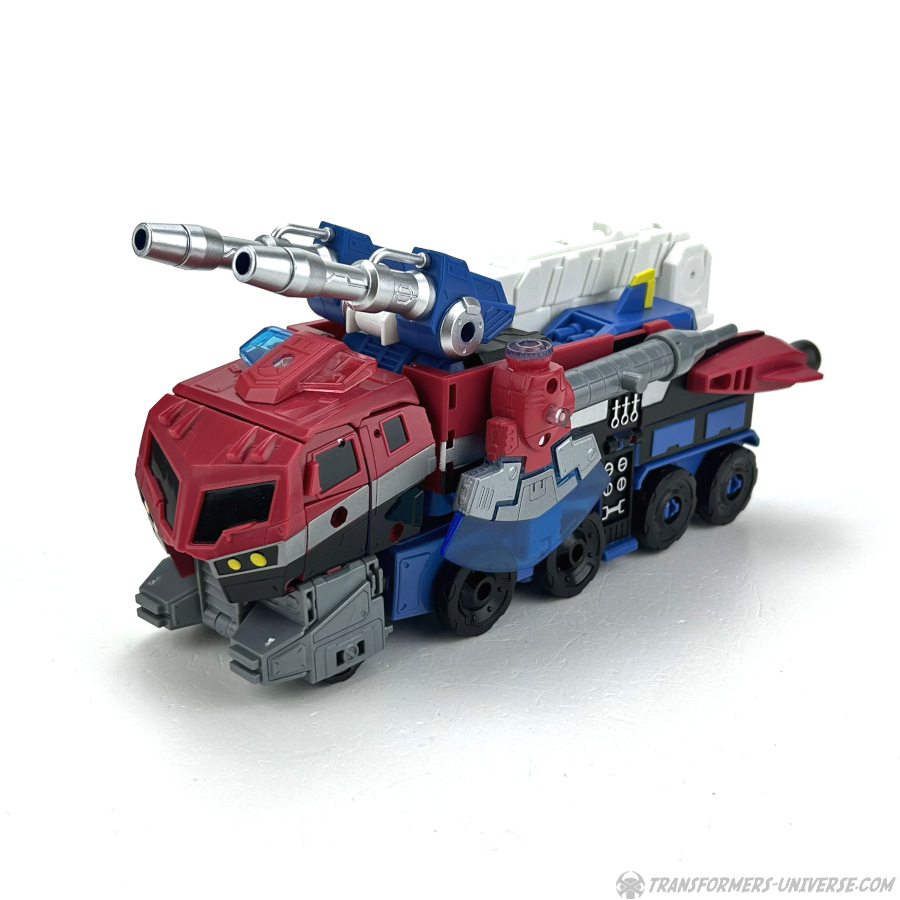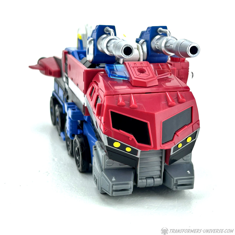 Robot Mode: The trailer falls apart into multiple pieces of gear that can be worn by Optimus in robot mode. The whole thing is basically an upgraded version of the Animated Wingblade Optimus Prime, as it contains the same winged rucksack with the cannons and gloves as the set from Takara. There are multiple other parts, though, to show that this is more than the hastily assembled gear used by Optimus in the season 3 finale of Animated.