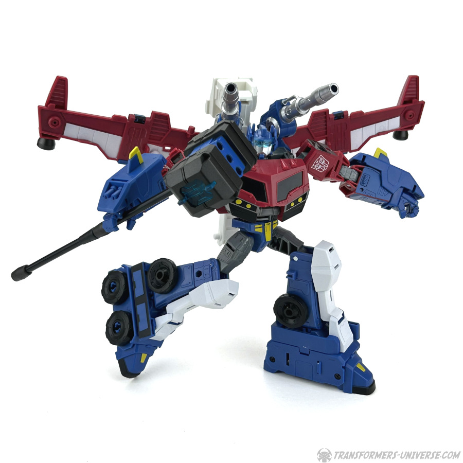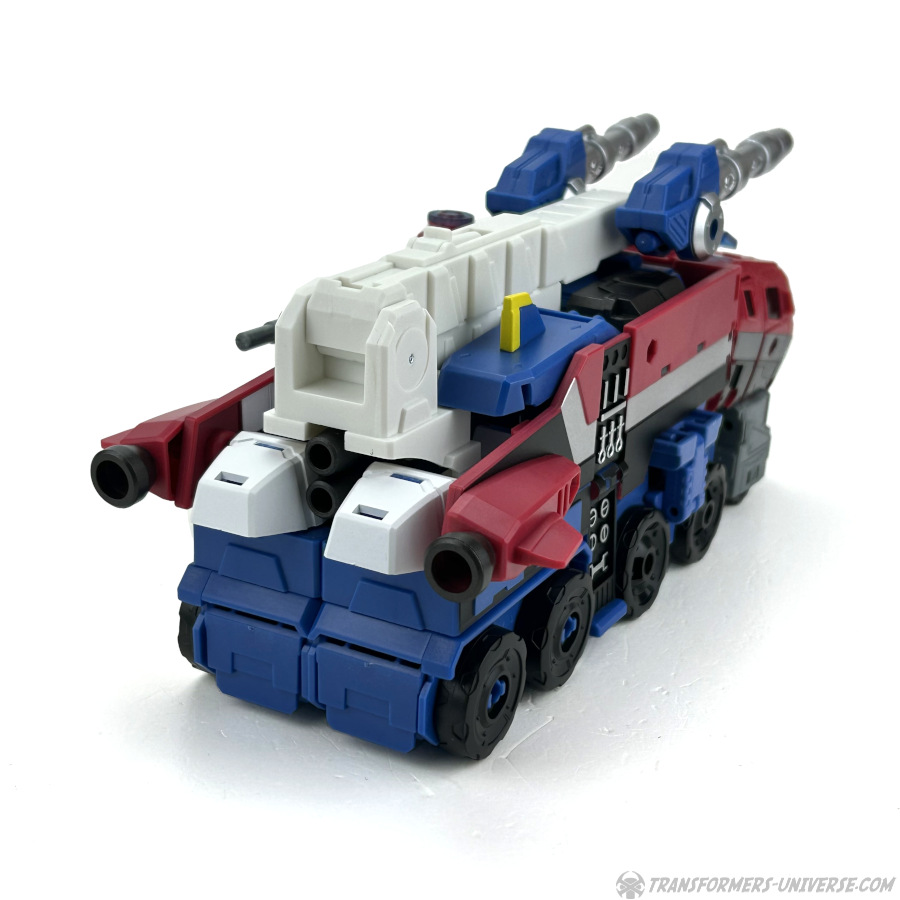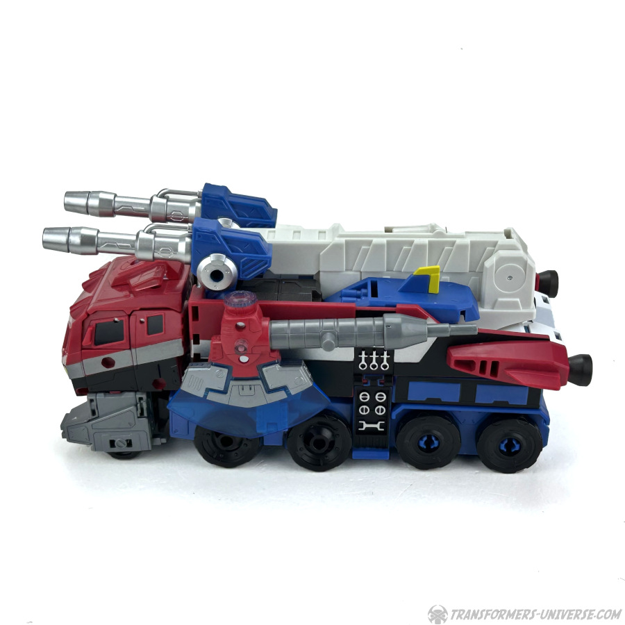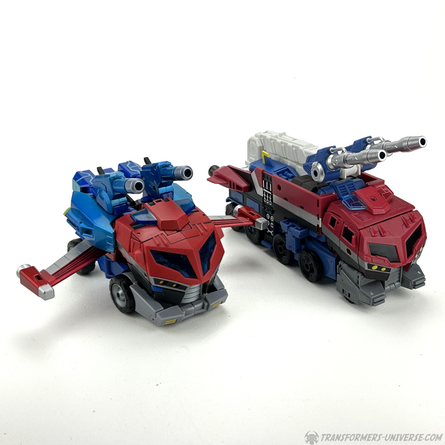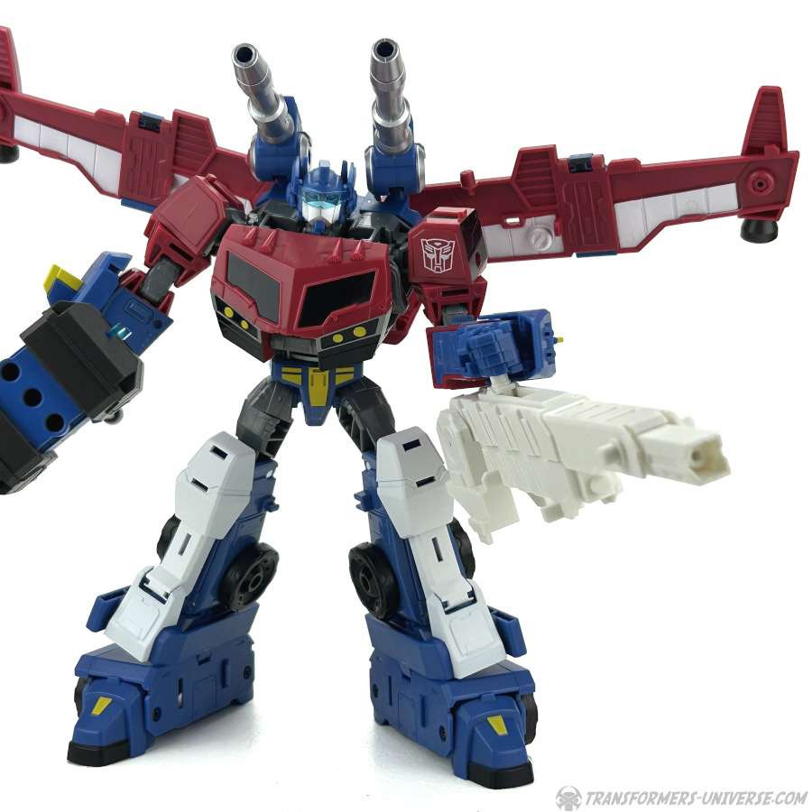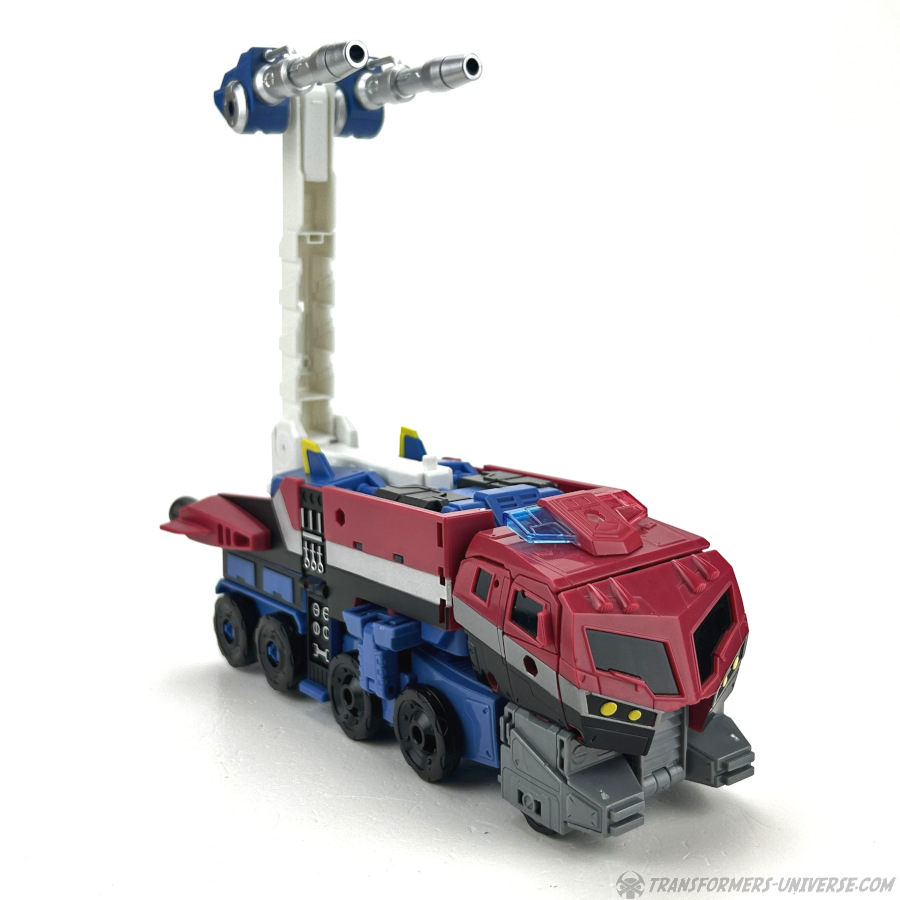 Robot Mode: The trailer falls apart into multiple pieces of gear that can be worn by Optimus in robot mode. The whole thing is basically an upgraded version of the Animated Wingblade Optimus Prime, as it contains the same winged rucksack with the cannons and gloves as the set from Takara. There are multiple other parts, though, to show that this is more than the hastily assembled gear used by Optimus in the season 3 finale of Animated.