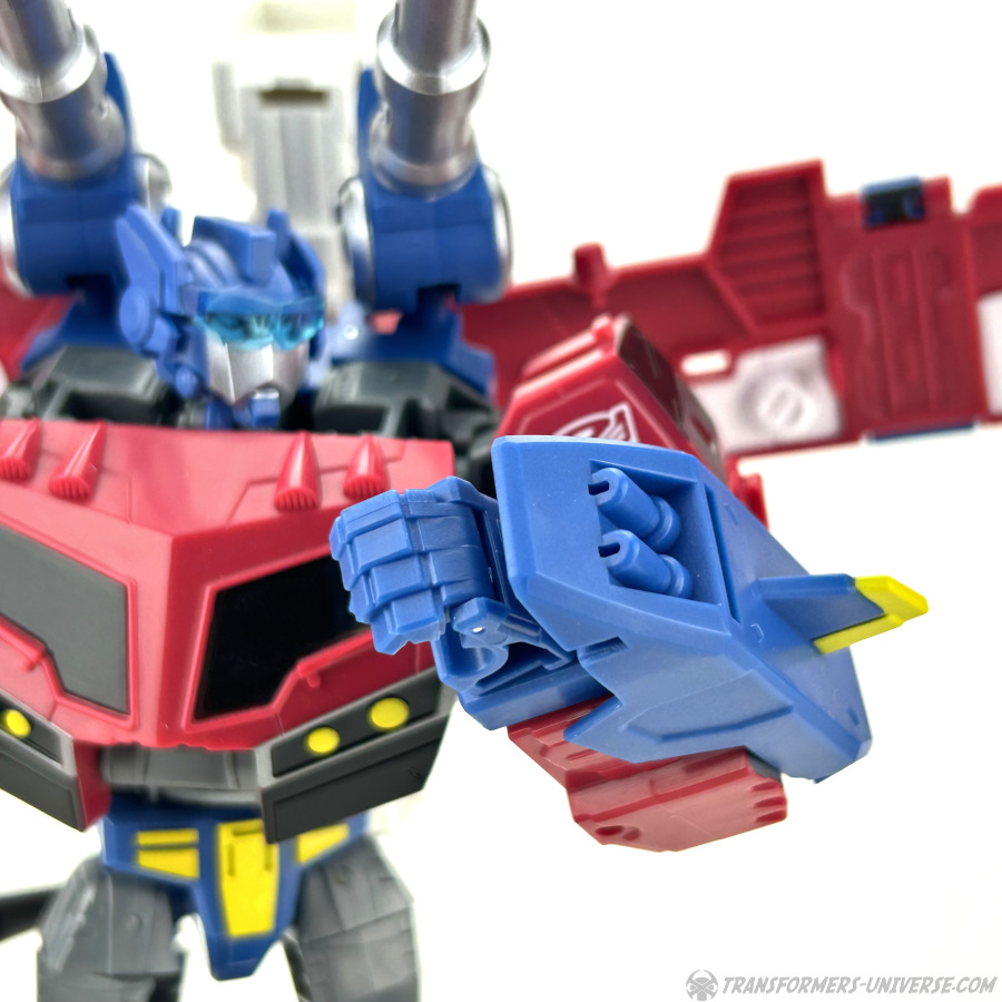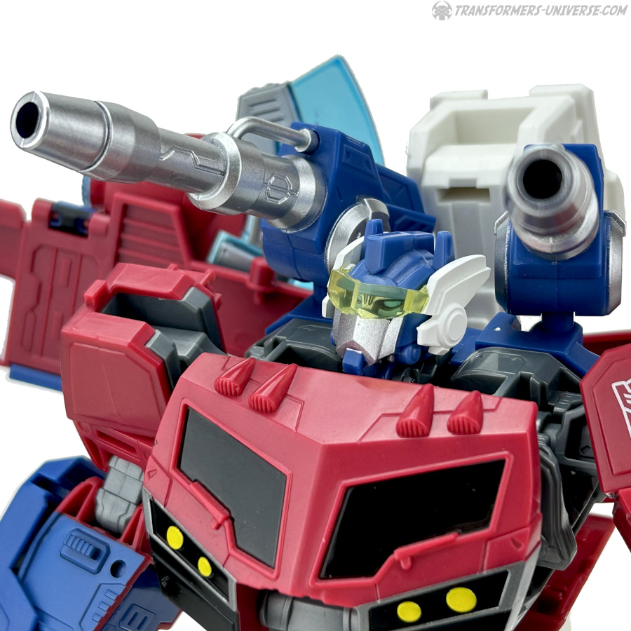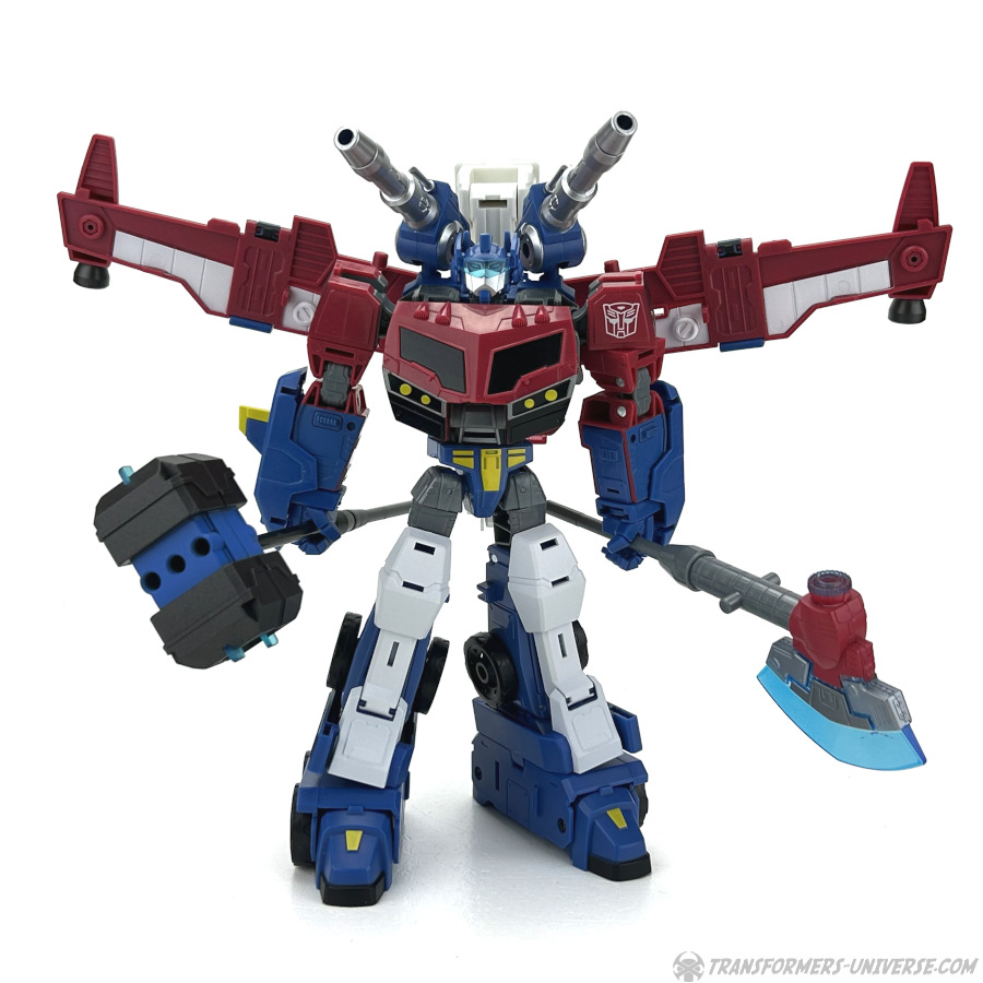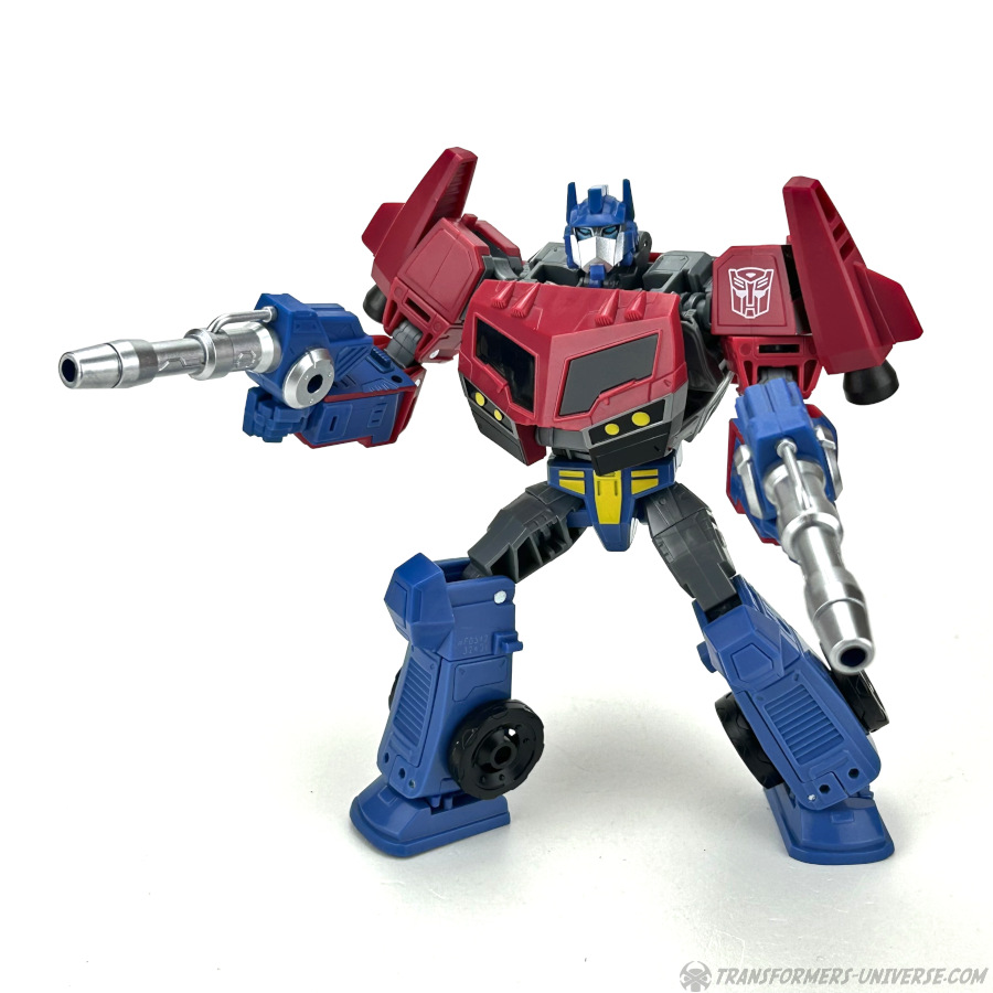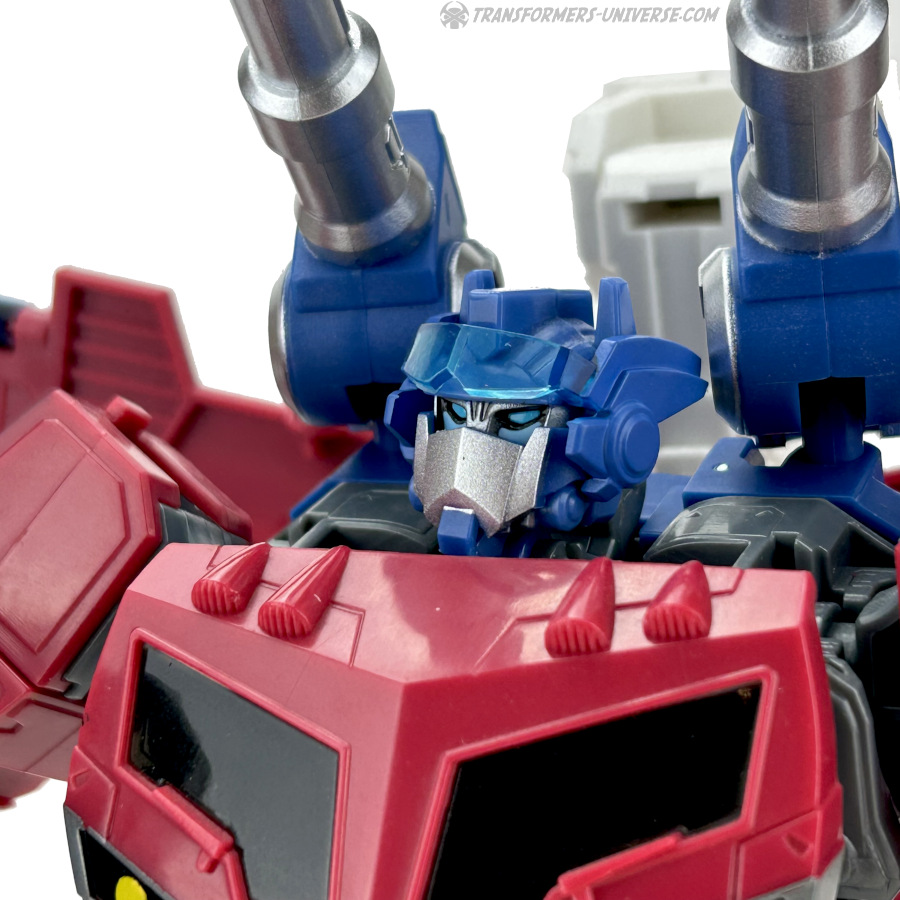 Robot Mode: The trailer falls apart into multiple pieces of gear that can be worn by Optimus in robot mode. The whole thing is basically an upgraded version of the Animated Wingblade Optimus Prime, as it contains the same winged rucksack with the cannons and gloves as the set from Takara. There are multiple other parts, though, to show that this is more than the hastily assembled gear used by Optimus in the season 3 finale of Animated.
