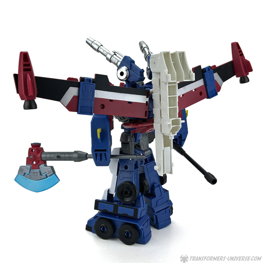 The ladder from the vehicle mode can either be stored on the back or used as a big gun in the style of Galaxy Convoy. Here, too, I must say that the ladder should not have been pure unpainted white plastic, but rather adorned with some detailing. Also, the rear end of the gun cannot be straightened out, it’s stuck at a ninety-degree angle. It’s not a deal breaker or anything, but I think this could have looked a lot better with some minimal effort.
