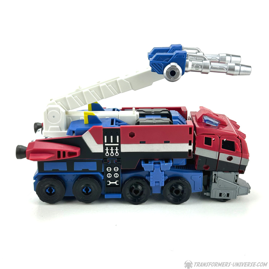 Alternate Mode: The DNA Design DK-52 Upgrade Set consists of various parts that combine into a trailer for use with the Legacy United Animated Optimus Prime figure. The trailer attaches to Optimus Prime’s alternate mode and now makes it look, really for the first time ever, like an actual fire truck. Complete with a ladder on top, though the ladder could easily be longer and maybe not all-white, as that swallows up most of the detailing. The two water cannons are attached to the end of the ladder, so Optimus can put out fires in upper stories as well. No rotation in the ladder, though, so he can only shoot forward.