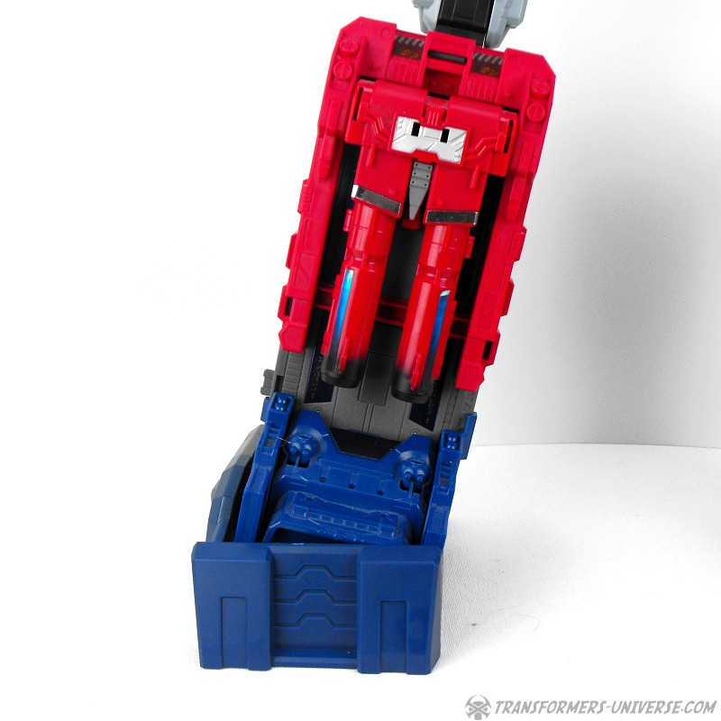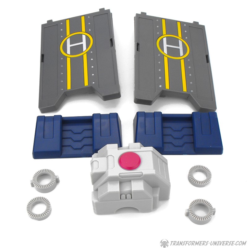 The true purpose of these slippers is to be found in FortMax’ alternate modes, though, where they turn into helipad platforms. A few pins are inserted into Max’ thighs and upper arms so they can plug in. In city mode the helipad platforms attach to the back of the arm ramps. It doesn’t really change the look much, to be honest, and the city mode still remains FortMax’ weakest mode. But it does give the city a bit more… well, city, so even a little improvement is appreciated.