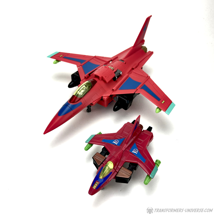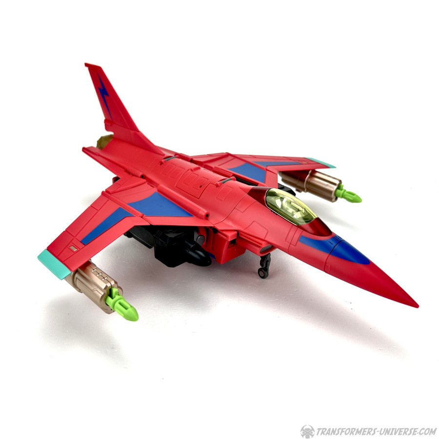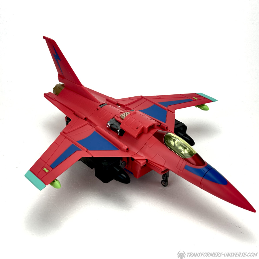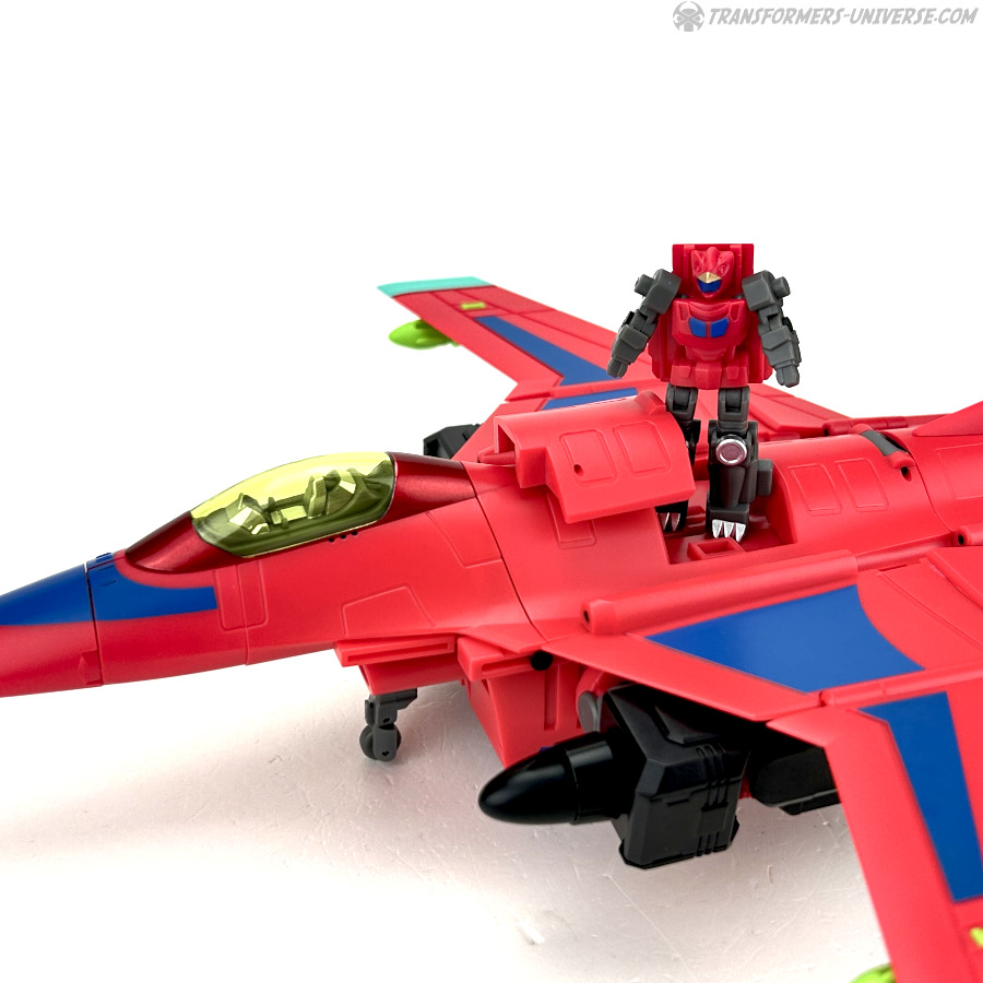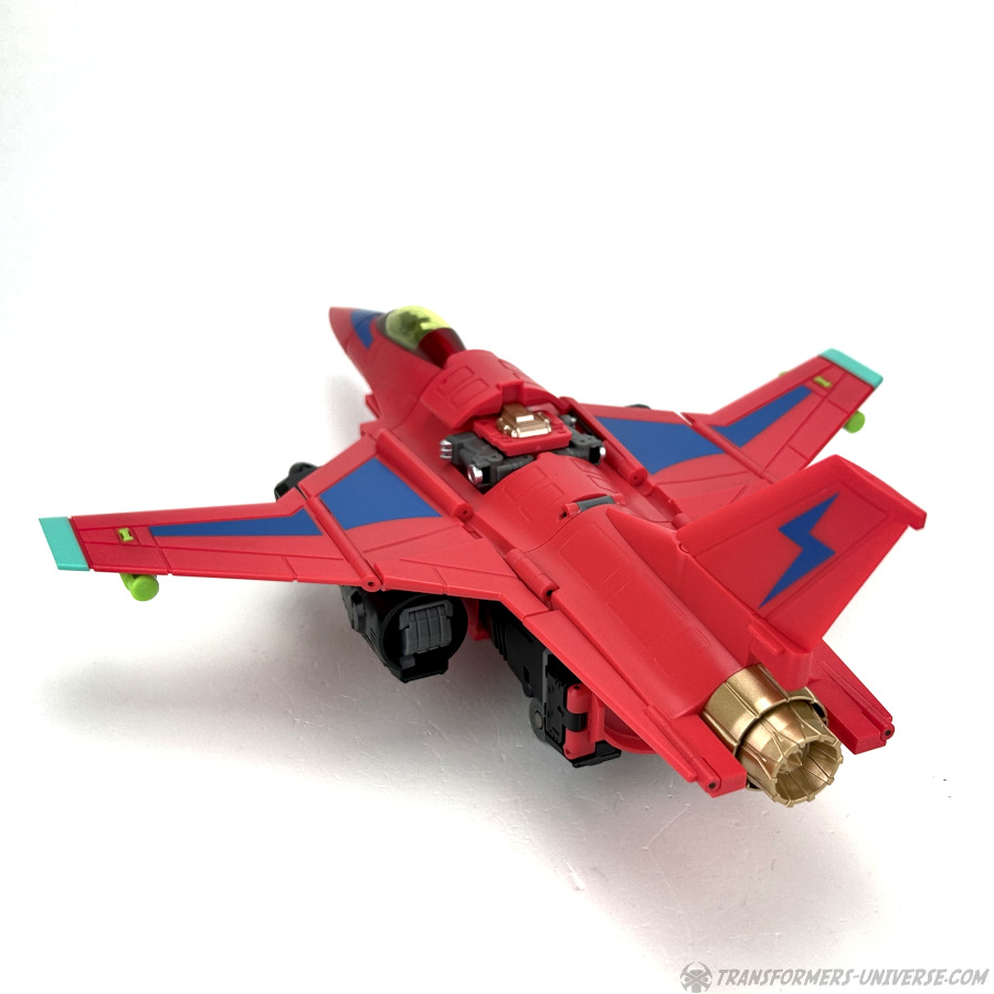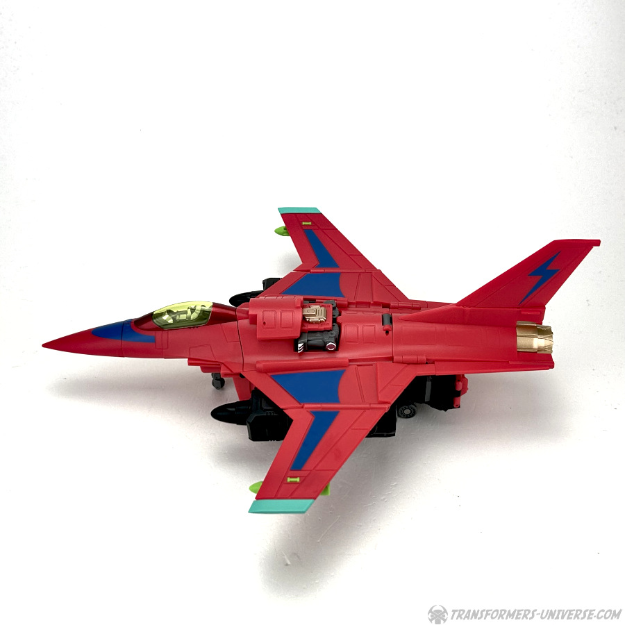 Apart from those changed pieces, it’s the same jet as before, just in red with some black. Personally I adore jets with forward-swept wings, so I am somewhat partial to this thing here. One thing I noticed on Hangman that I missed on Marksman is that the cover for the Powermaster socket can not just fold upward, it can also simply be removed if you want, so you’ll have same open socket you had on the G1 Powermasters Darkwing and Dreadwind.