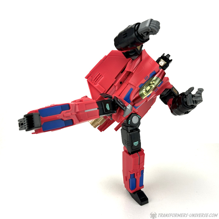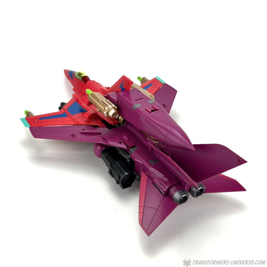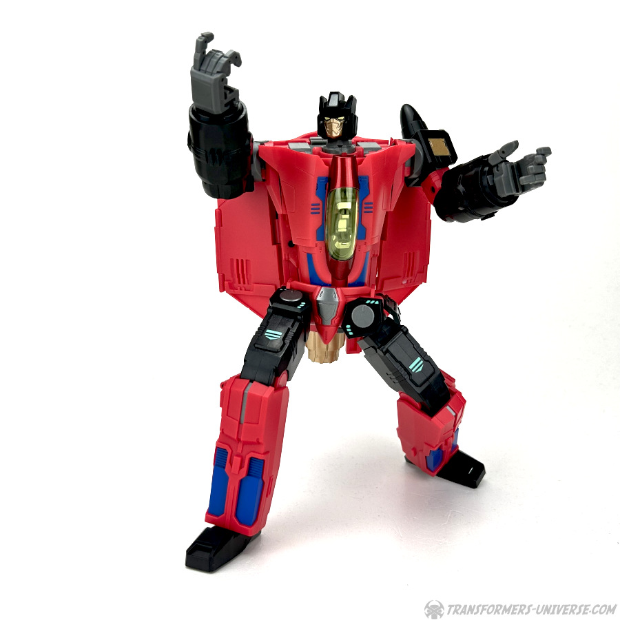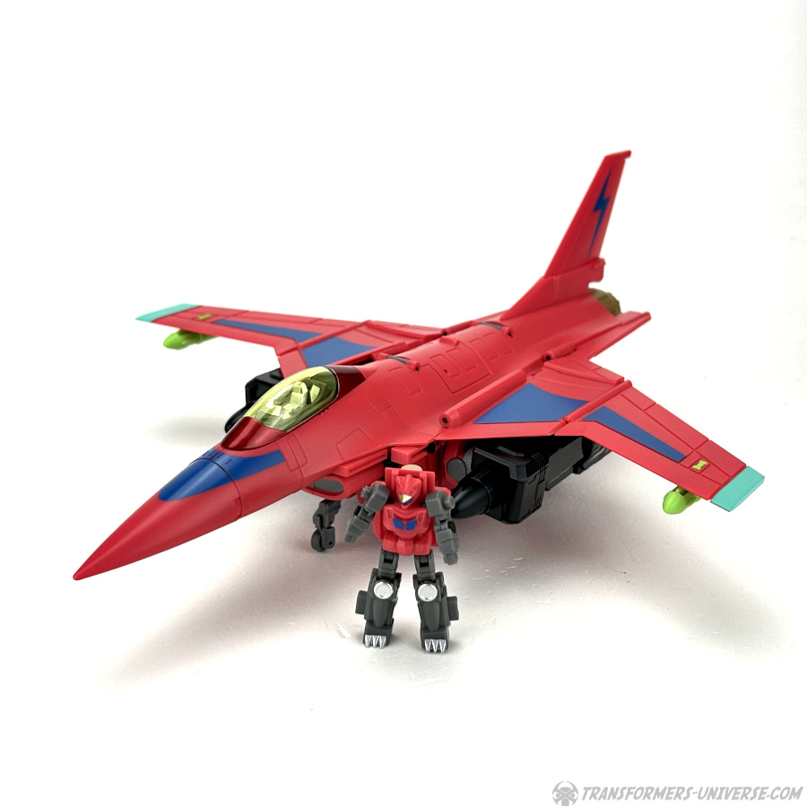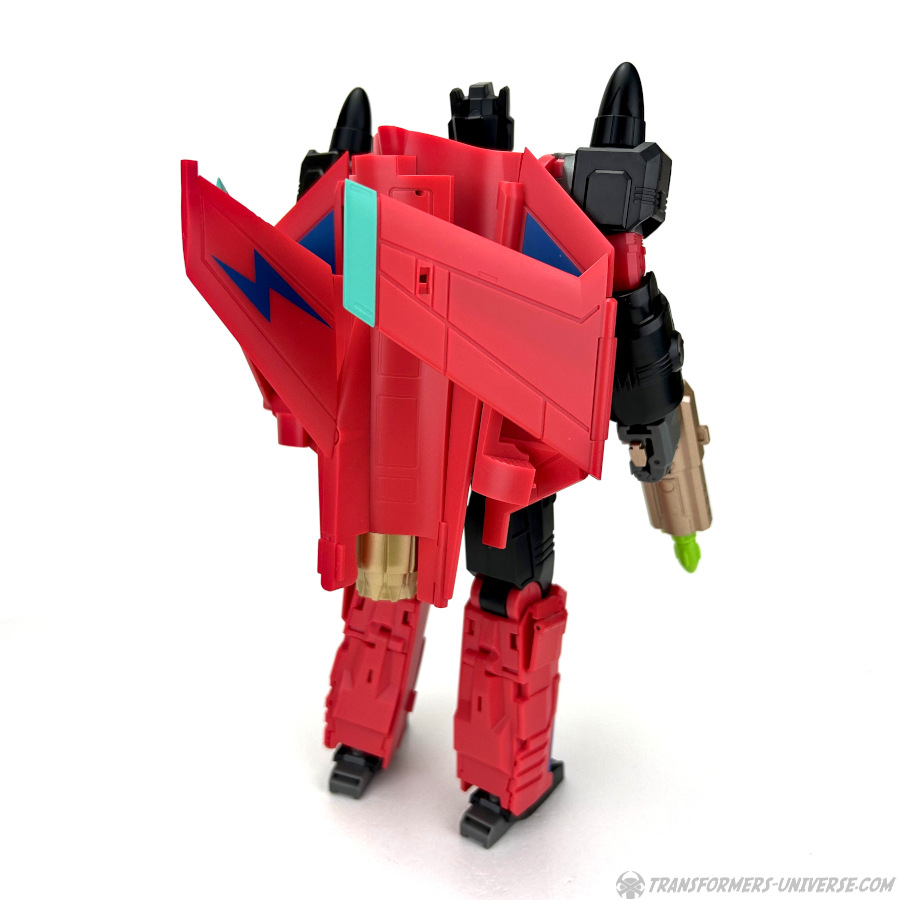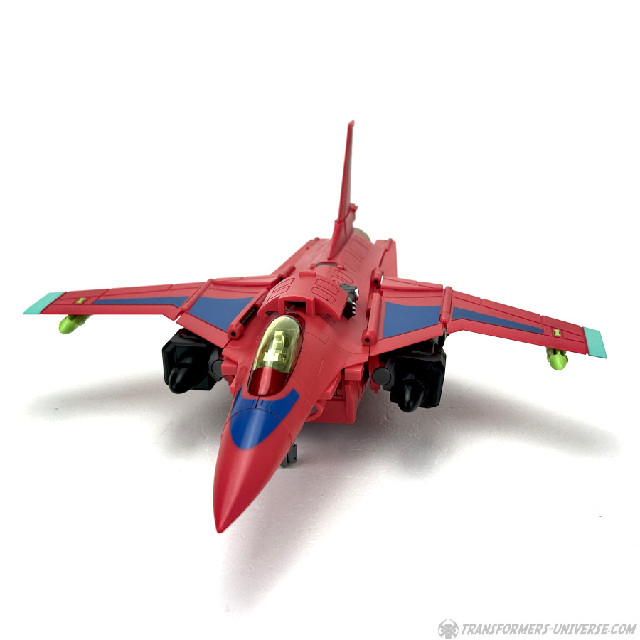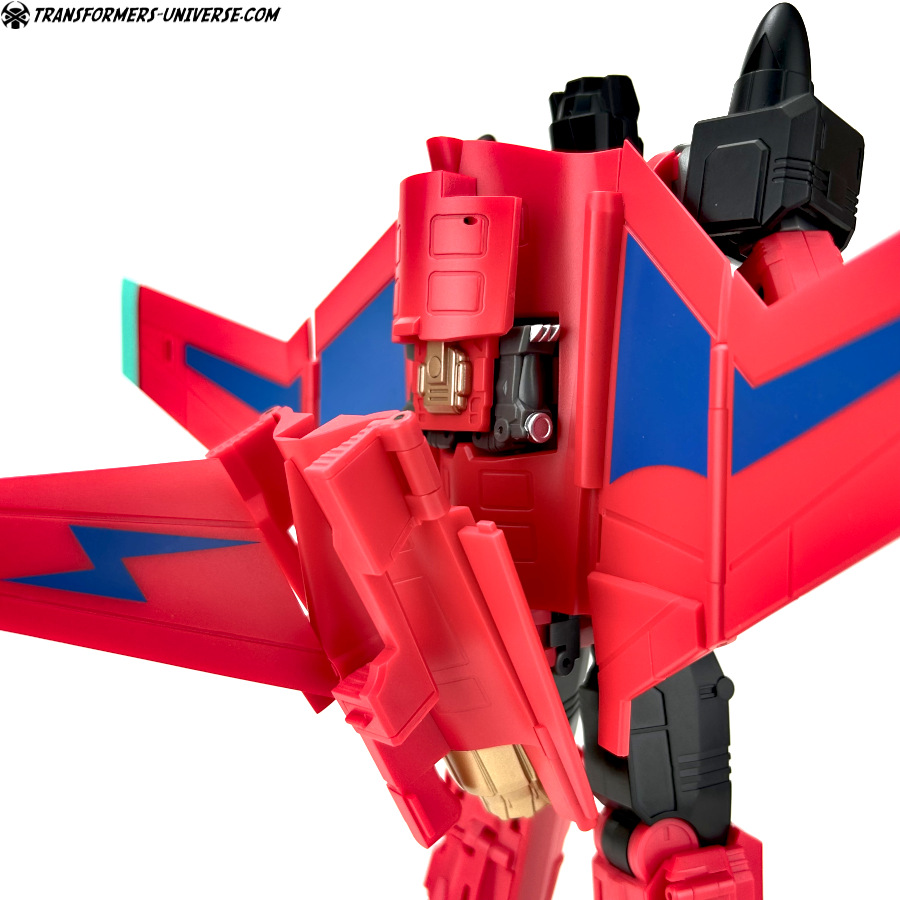 Apart from those changed pieces, it’s the same jet as before, just in red with some black. Personally I adore jets with forward-swept wings, so I am somewhat partial to this thing here. One thing I noticed on Hangman that I missed on Marksman is that the cover for the Powermaster socket can not just fold upward, it can also simply be removed if you want, so you’ll have same open socket you had on the G1 Powermasters Darkwing and Dreadwind.