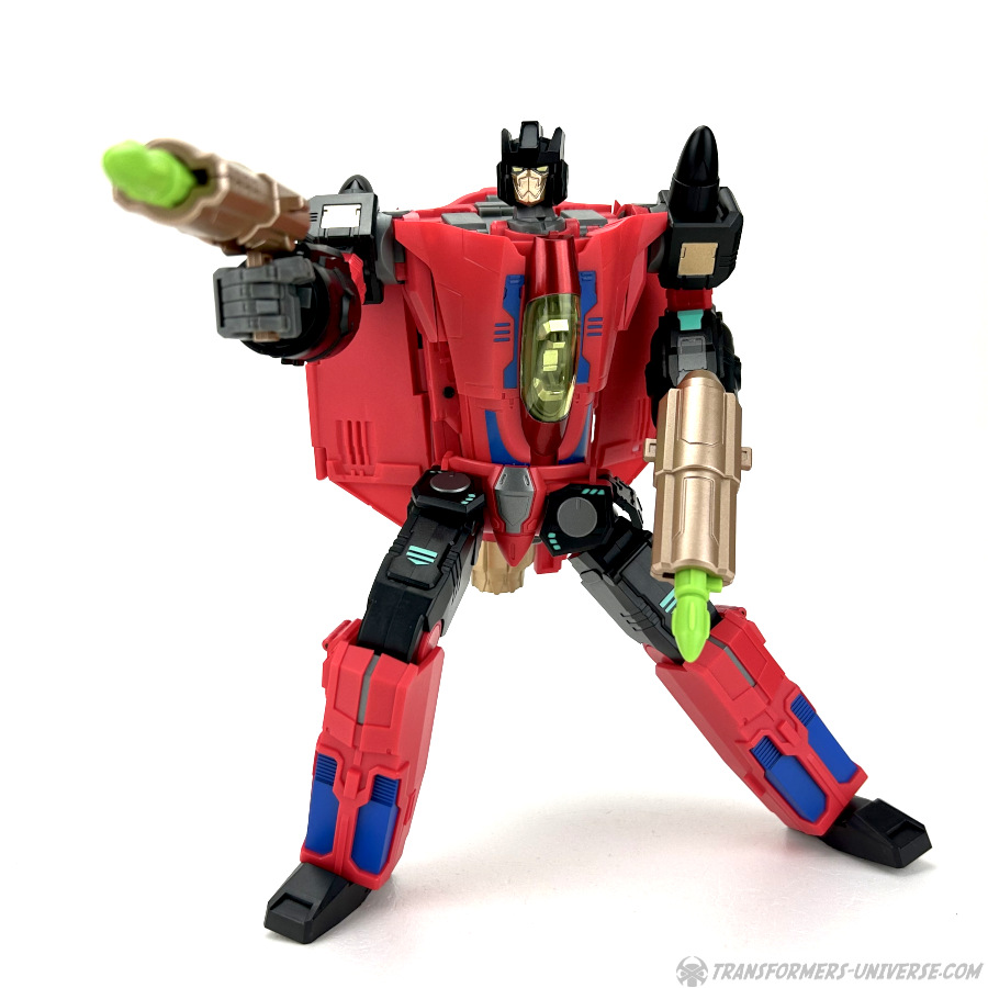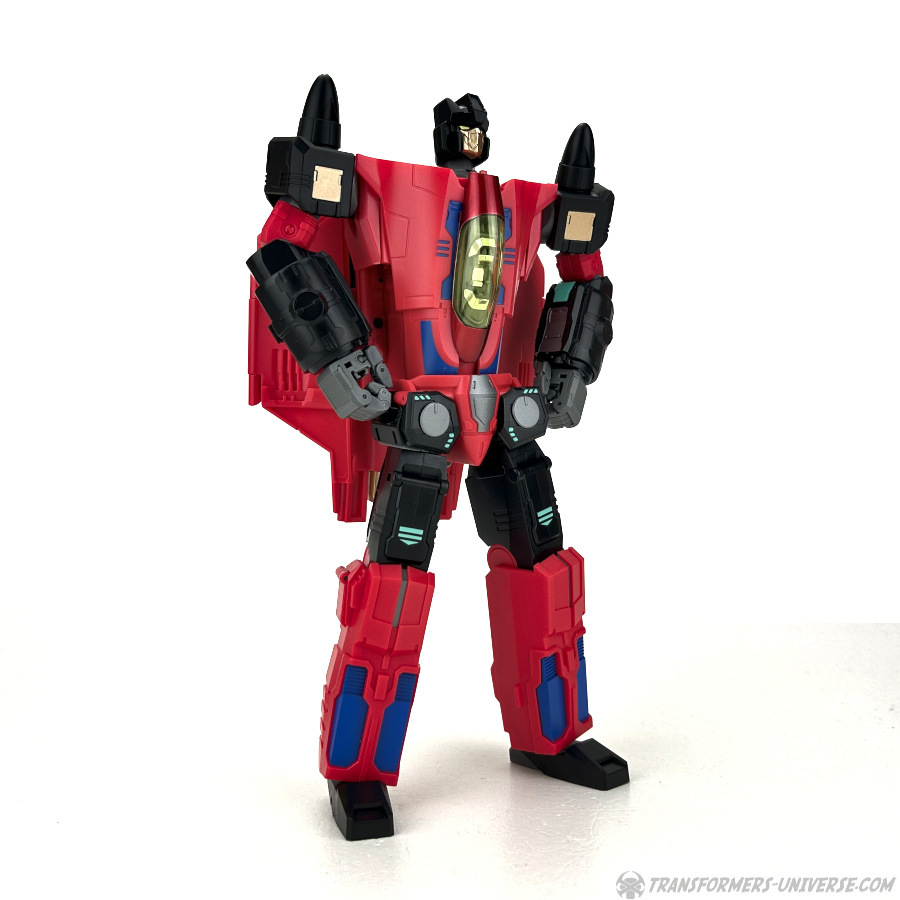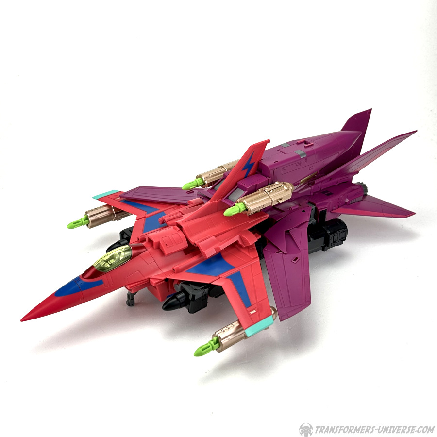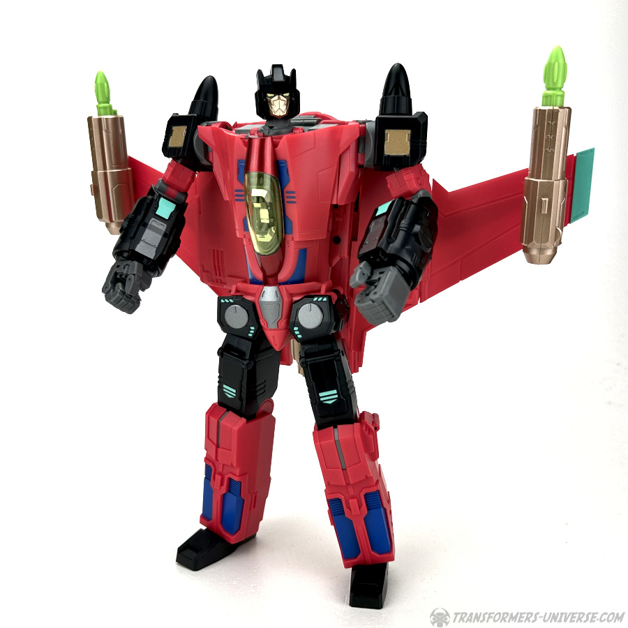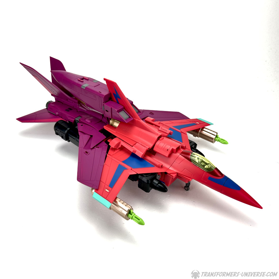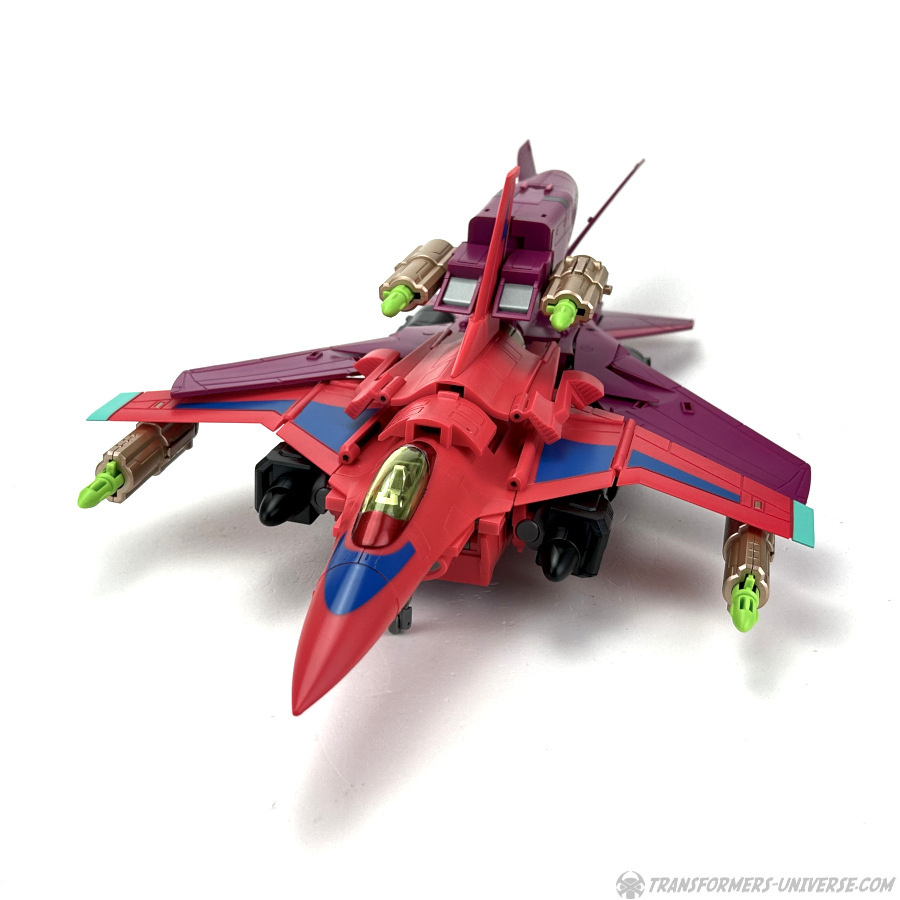 Apart from those changed pieces, it’s the same jet as before, just in red with some black. Personally I adore jets with forward-swept wings, so I am somewhat partial to this thing here. One thing I noticed on Hangman that I missed on Marksman is that the cover for the Powermaster socket can not just fold upward, it can also simply be removed if you want, so you’ll have same open socket you had on the G1 Powermasters Darkwing and Dreadwind.