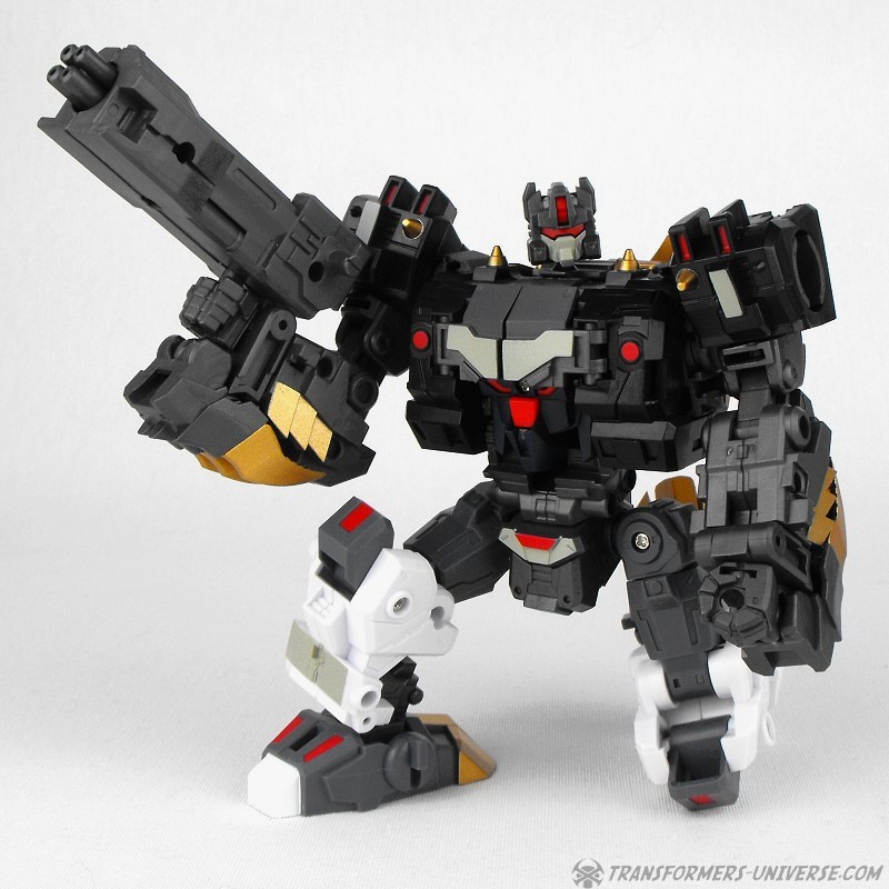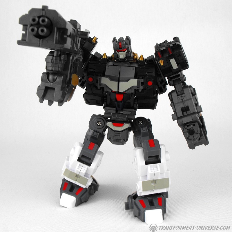 Robot Mode: Dinoichi is a stocky, powerful-looking robot who has a sort of generic evil warrior robot look. Looking at him from the front he offers no clue as to what he transforms into, he just looks strong and dangerous. His primary weapon, a grey triple-barreled rifle, fits nicely with that image, as does the rather subdued paintjob. In terms of the resemblance to the Kakuryu toy, the robot does a good job, though the figure is, of course, far bigger and more intricate than the Micromaster-sized original.