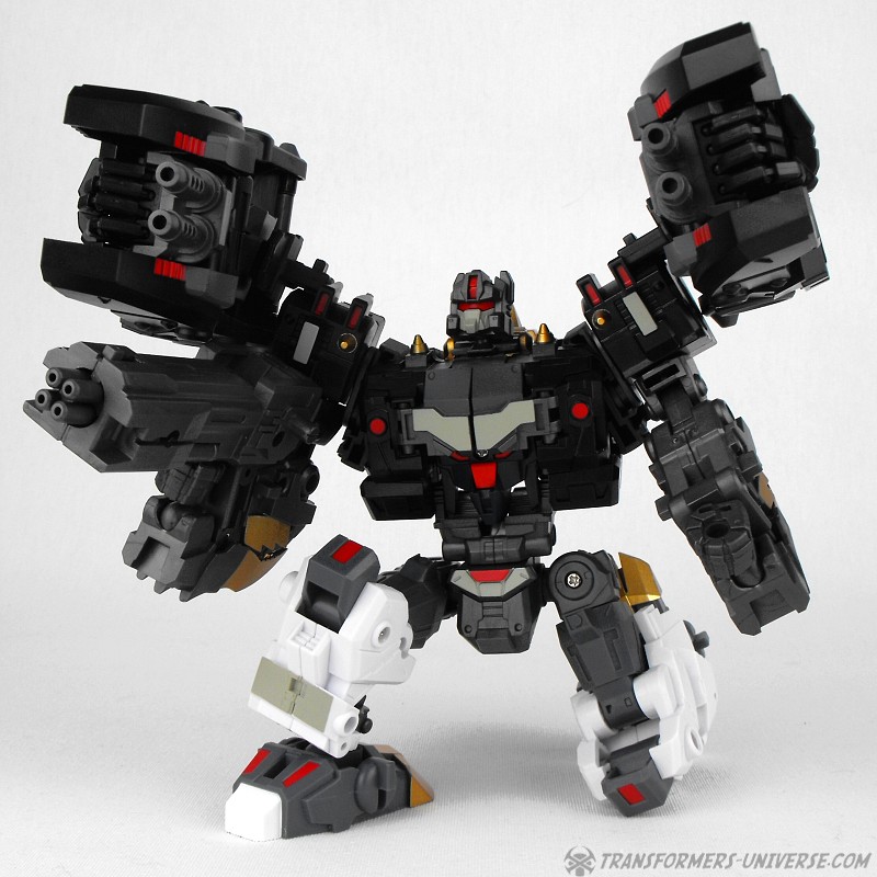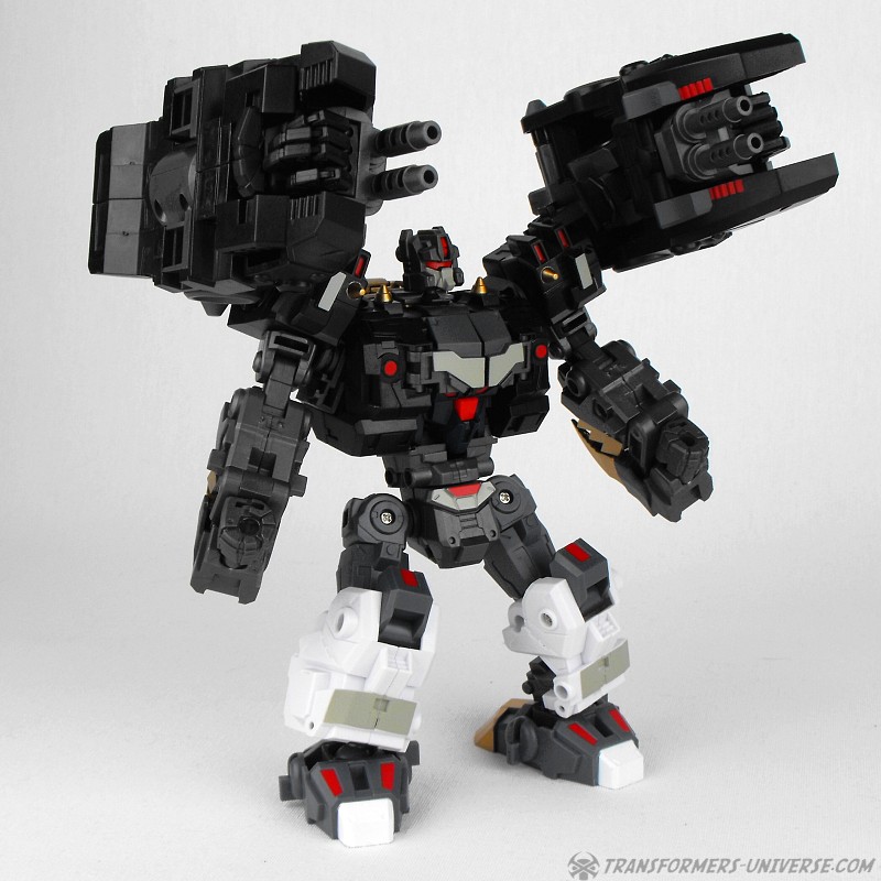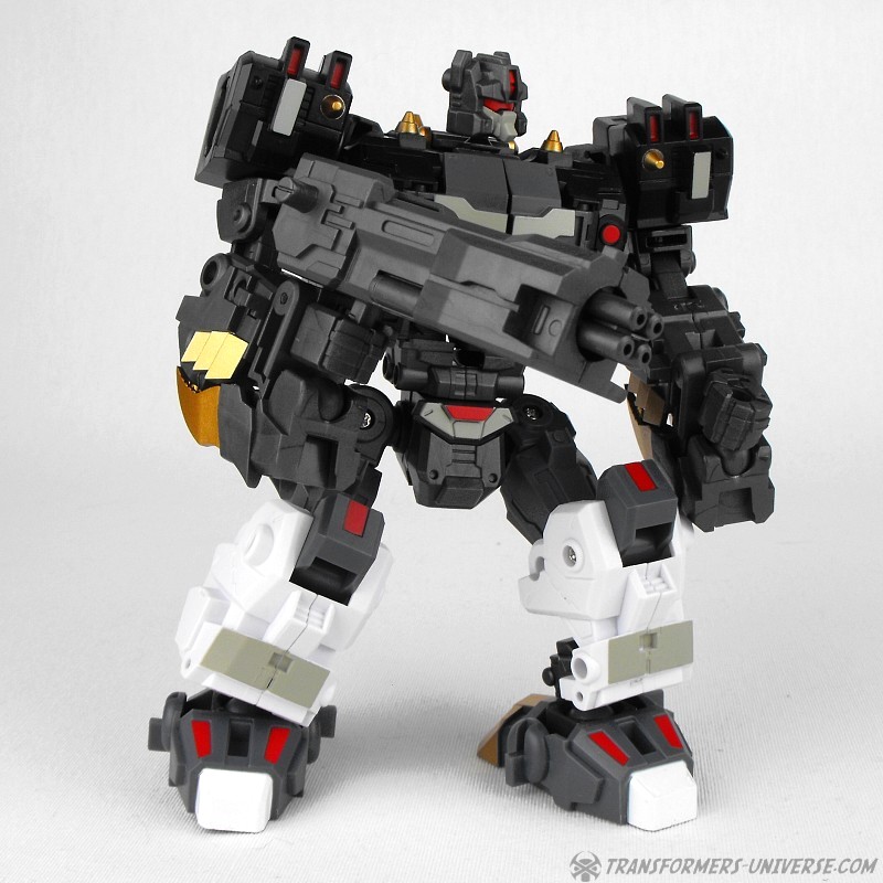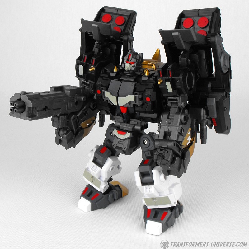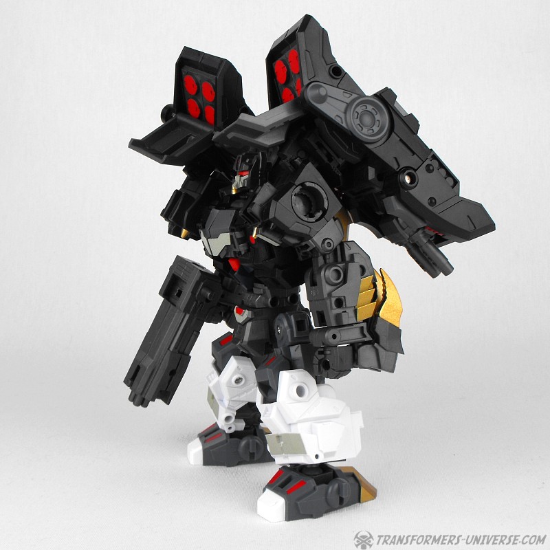 Articulation is pretty good, the only limitations being Dinoichi’s stocky build. He can still pull off all sorts of poses without any problems. For additional firepower has two big weapon pods – actually the feet and fists of the combiner mode – which he can attach to his shoulders in two different ways. They can either serve as gun pods with the gun barrels pointed forward, or as missile pods, as panels on the other side open up to reveal sculpted missile tubes. Seeing as I love shoulder-mounted weapons, those look pretty good to me.