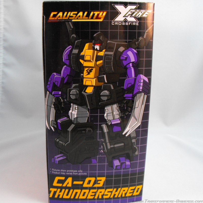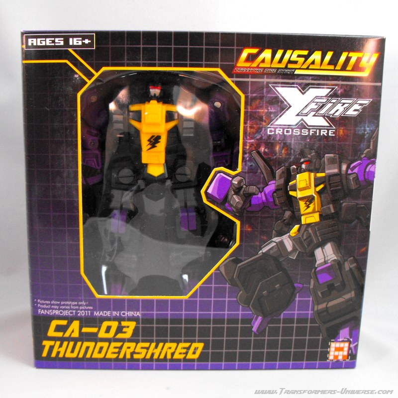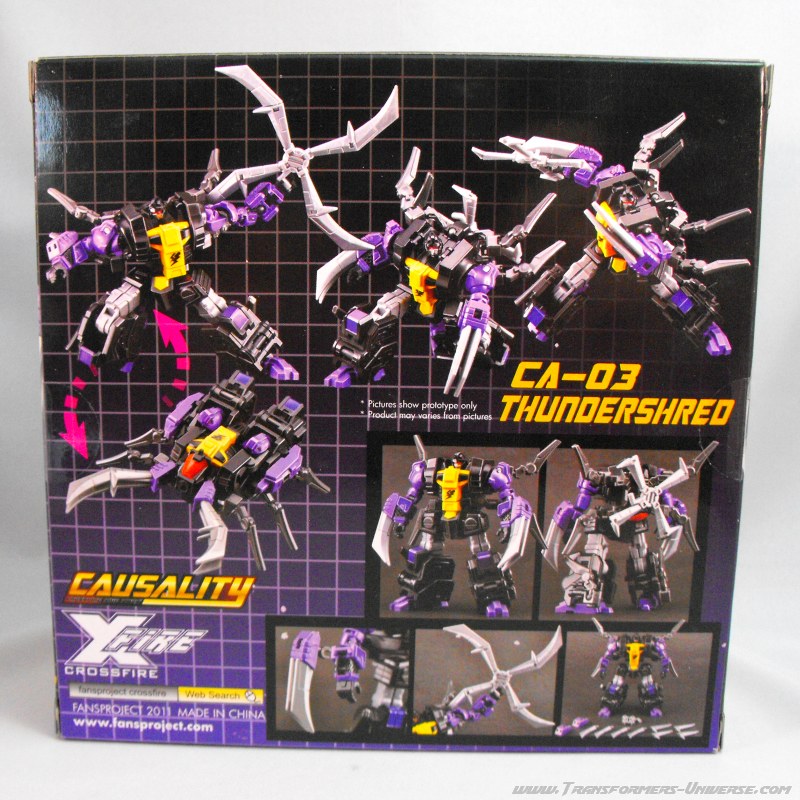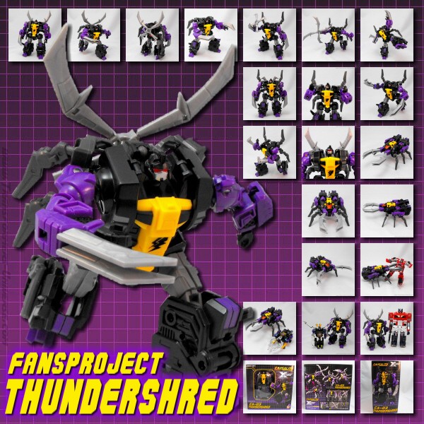 Prelude: To get the legal stuff out of the way: Thundershred is not a Transformer in the strictest sense, as he was not produced by either Hasbro or Takara-Tomy. He’s a third party product by Fansproject and pays homage to the G1 Insecticon Shrapnel. For legal reasons he can’t be called that, of course, so Thundershred it is. Btw, this is actually the fourth name for this character by now. The Robot Hero version was called simply Insecticon, while the Universe re-issue carried the name Sharpshot.