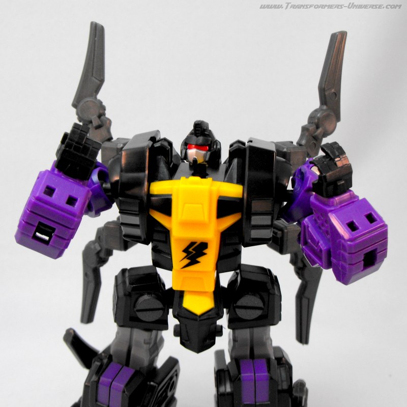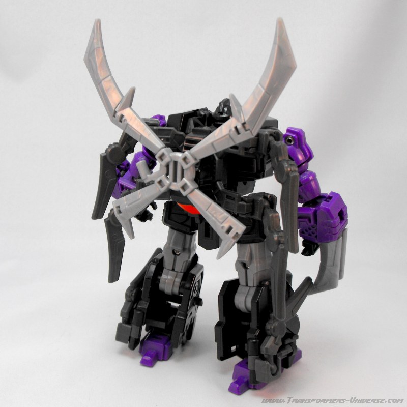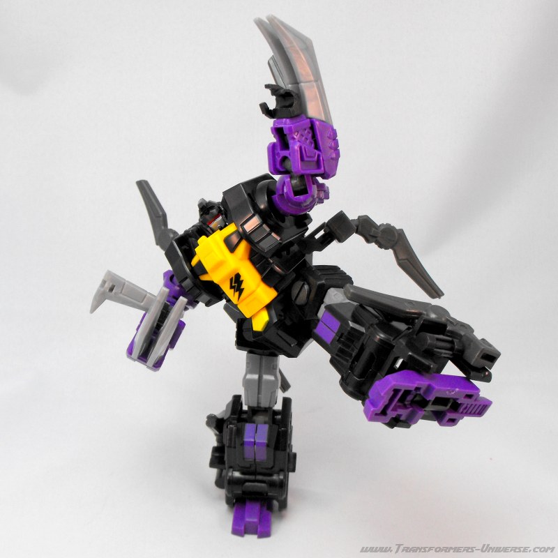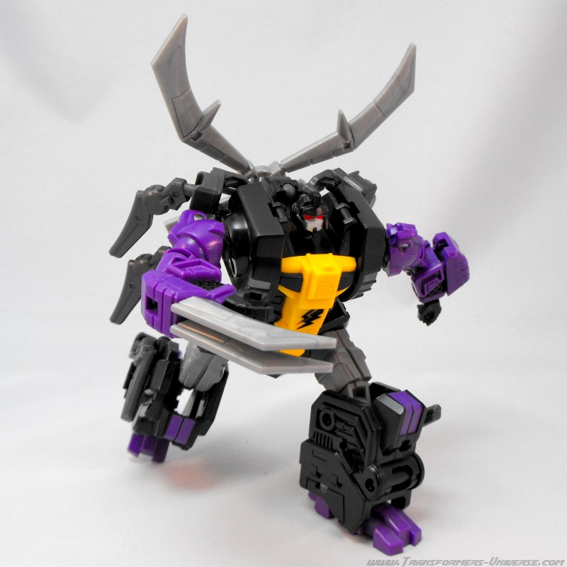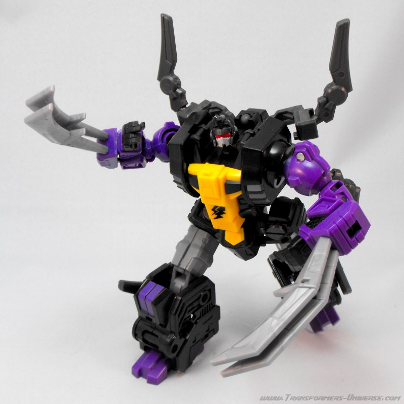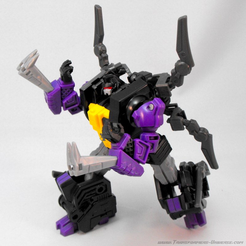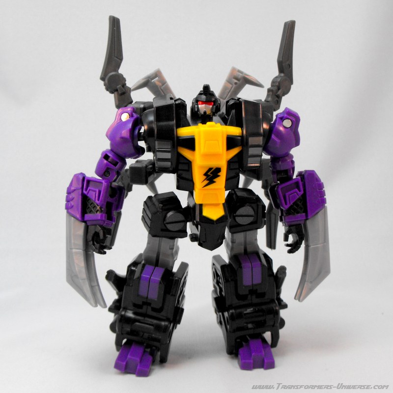 Alternate Mode: Just like his G1 predecessor, Thundershred transforms into a mechanized stag beetle. The transformation is a tad more intricate than it was for the original figure (which pretty much just laid down on its back), but not terribly complicated, either. The only thing that takes some fiddling is the arms, which slide into the folding legs. It works, but takes a moment to get everything positioned right.