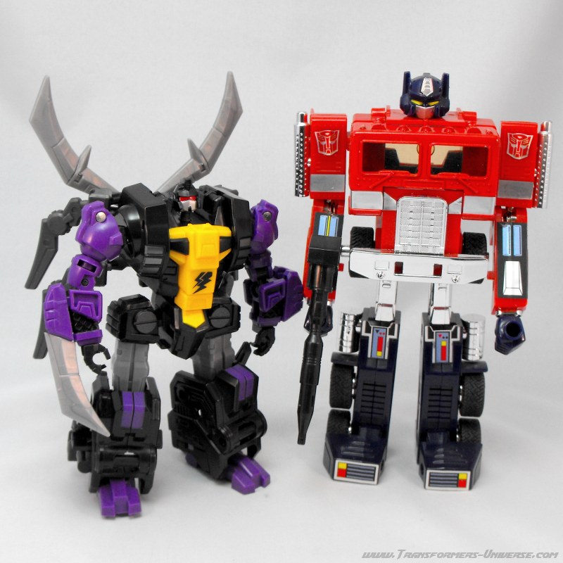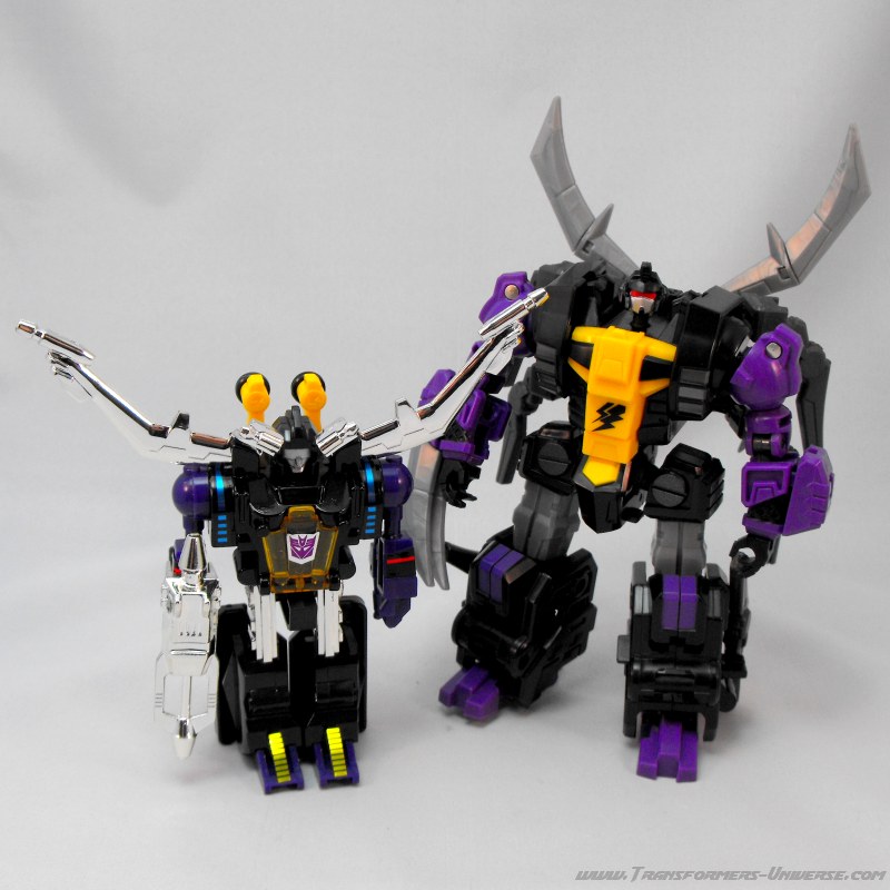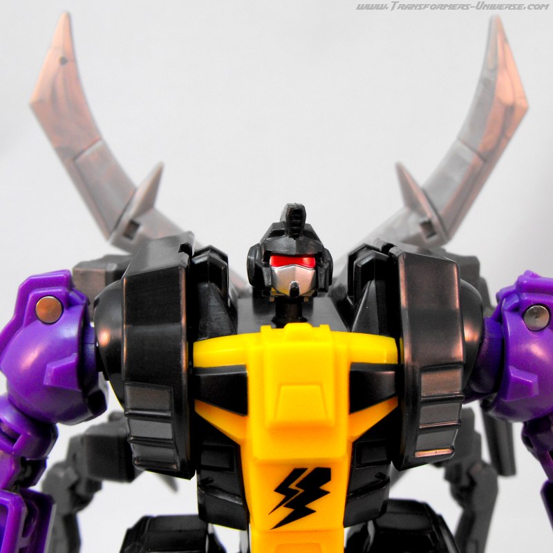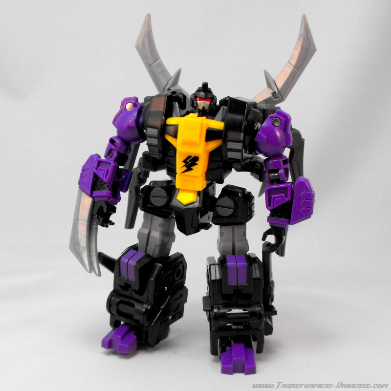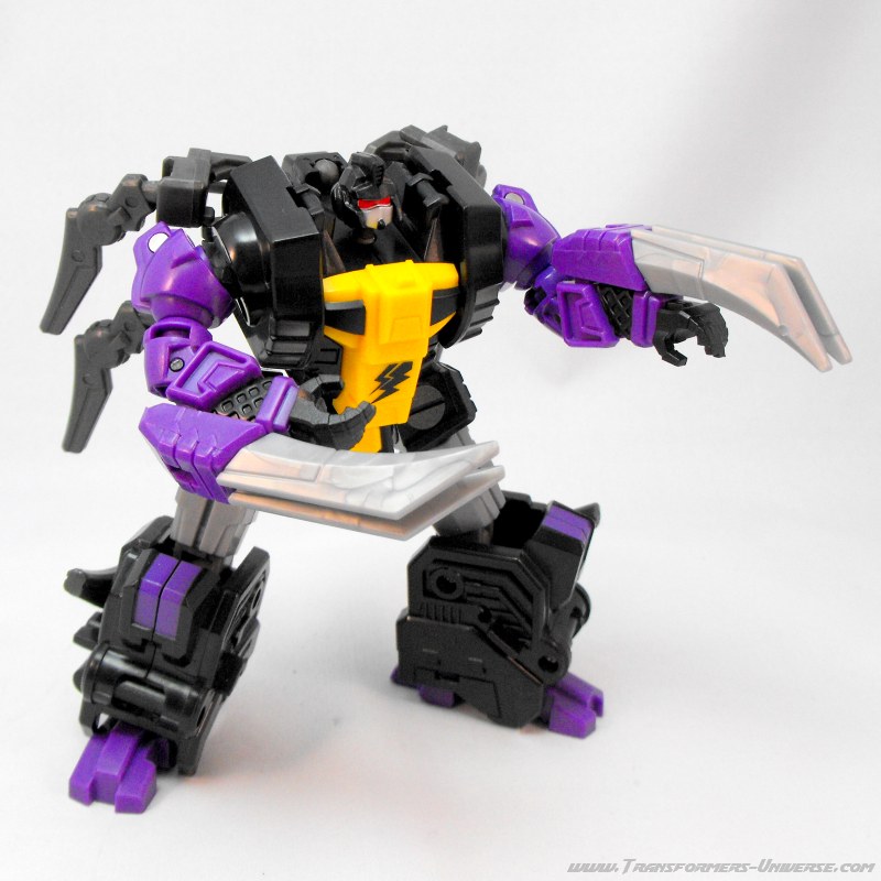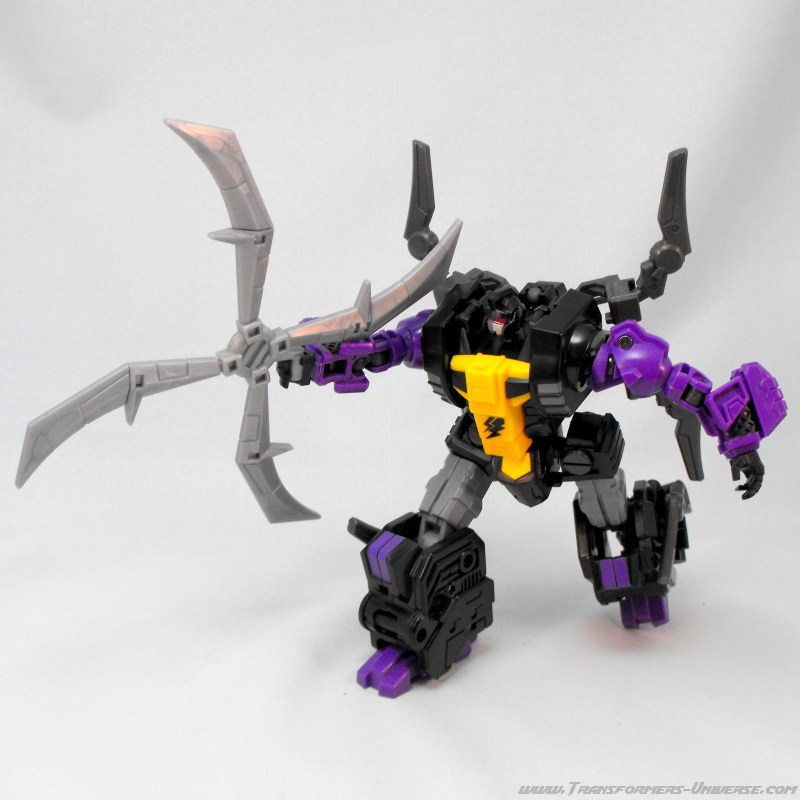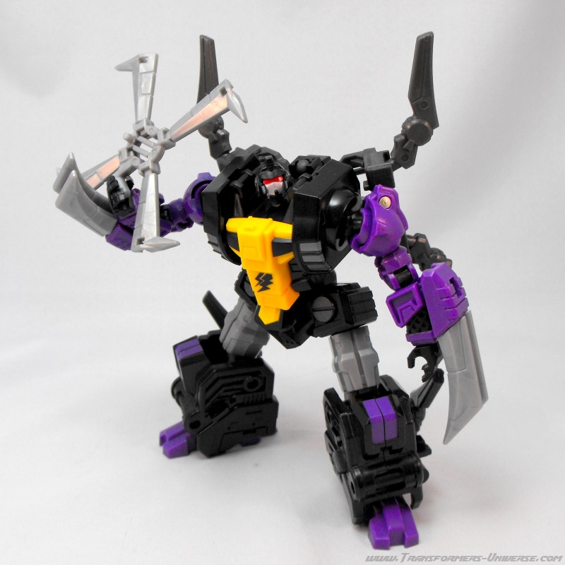 Alternate Mode: Just like his G1 predecessor, Thundershred transforms into a mechanized stag beetle. The transformation is a tad more intricate than it was for the original figure (which pretty much just laid down on its back), but not terribly complicated, either. The only thing that takes some fiddling is the arms, which slide into the folding legs. It works, but takes a moment to get everything positioned right.