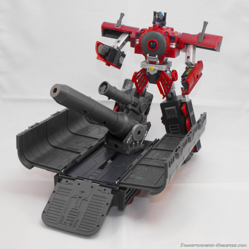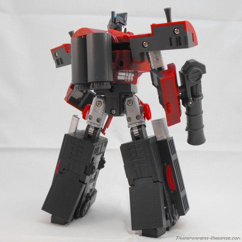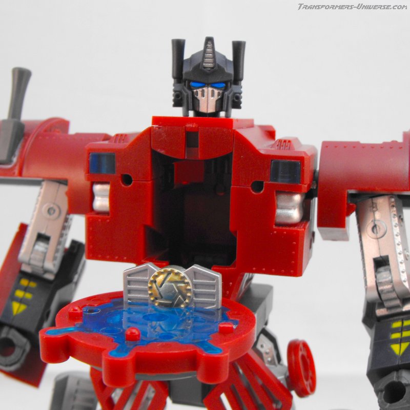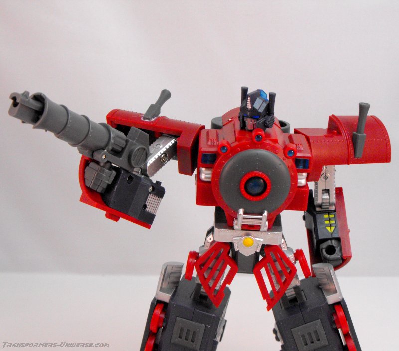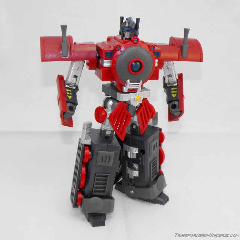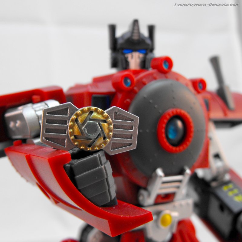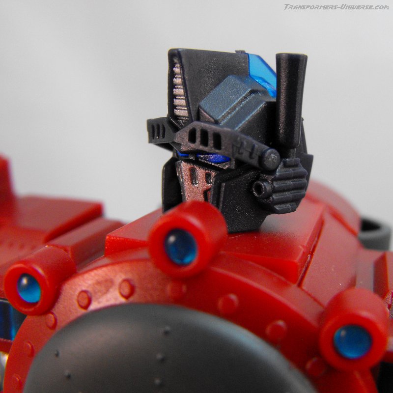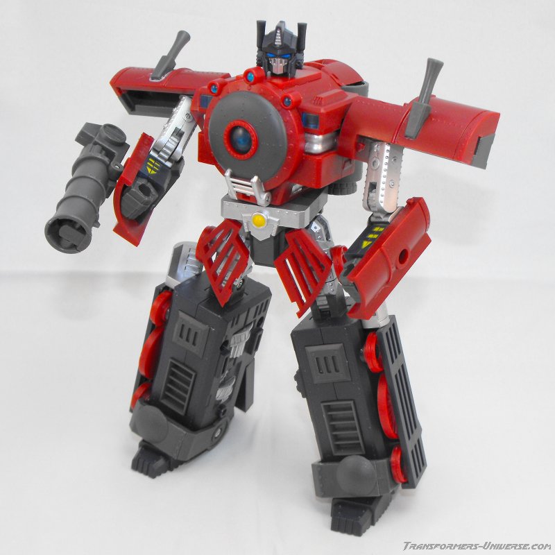 Robot Mode: Where to start? Names aside, this robot obviously depicts Optimus Prime, leader of the Autobots. Despite a different alternate mode than the usual truck, the general look & feel of the figure is most definitely Prime-like. The head is, of course, a pretty straight-forward match. Several other details were also included, though, to perfect the look. He's got exhaust pipes on his shoulders, he's got those yellow stripes on his forearms, as well as multiple other little details to put Prime-fans around the world at ease. So absolutely no complaints on this front.